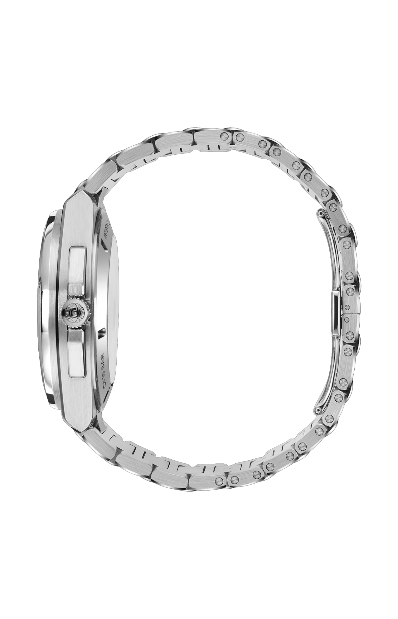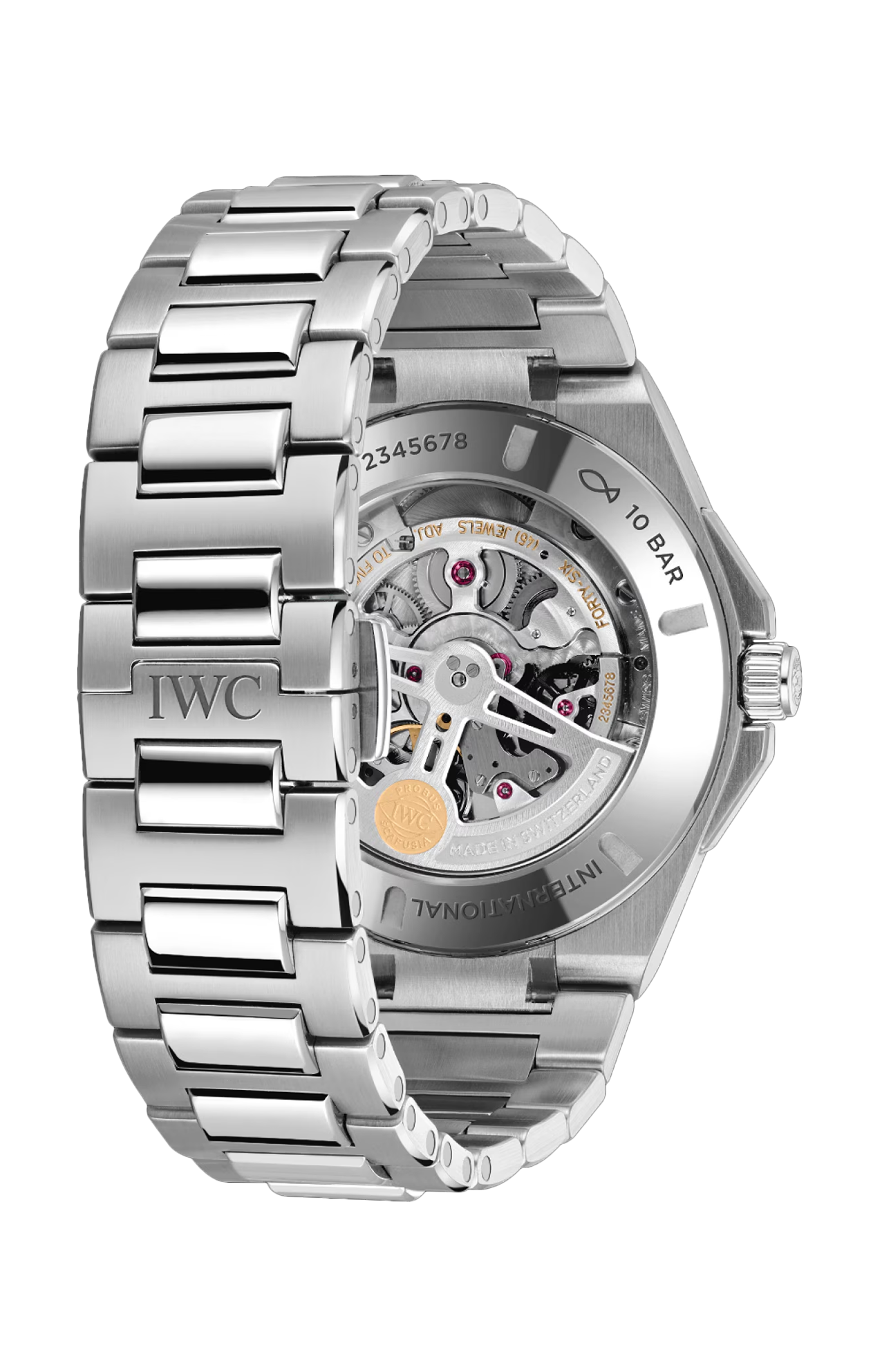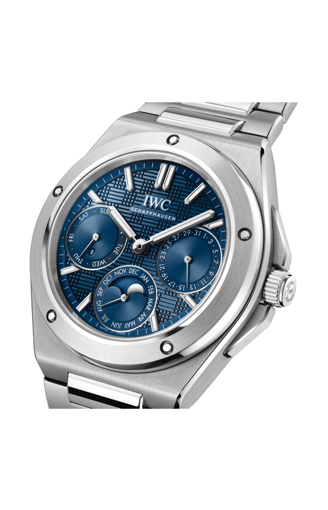 L’ingenieur perpetual calendar 41 è il primo modello in acciaio a combinare il visionario design ingenieur di Gérald Genta con il calendario perpetuo a corona di Kurt Klaus. L’orologio presenta una cassa di 41 millimetri e un bracciale integrato in acciaio, un quadrante blu e lancette e indici applicati rodiati. Perfettamente integrato nella cassa tramite un attacco a maglie centrali, il bracciale a maglie ad H con fibbia butterfly garantisce un eccellente comfort di utilizzo. L’iconica lunetta, segno distintivo del design di Gérald Genta, è fissata alla cassa con cinque viti funzionali. La cassa e la lunetta sono finemente rifinite con una combinazione di superfici satinate e lucide. Le maglie ad H del bracciale sono satinate con bordi esterni lucidi, mentre le maglie centrali e l’anello del fondello sono lucidi. Un altro punto di forza è il quadrante con il caratteristico motivo “a griglia”, composto da piccole linee e quadrati, che aggiunge ulteriore profondità al quadrante e riflette la luce. I contatori che mostrano le informazioni del calendario sono trattati con finitura soleil, mentre i bordi esterni presentano un raffinato “azurage”. Gli indici e le lancette in metallo rodiato sono riempiti con super-luminova®. Il calendario perpetuo visualizza sul quadrante la data, il giorno della settimana, il mese e le fasi lunari. Grazie a un ruotismo di riduzione che utilizza due ruote intermedie, l’indicazione delle fasi lunari si discosterà di un solo giorno dopo 577,5 anni. Oltre a indicare il giorno della settimana, il quadrante a ore 9 presenta anche un piccolo indicatore dell’anno bisestile, che conta gli anni fino al prossimo anno bisestile. Il calibro di manifattura IWC 82600 vanta un sistema di carica Pellaton. Dotato di componenti in ceramica a base di ossido di zirconio, praticamente esente da usura, accumula in modo affidabile una riserva di carica di 60 ore nella molla principale. Il movimento è rifinito con perlage, finiture Côtes de Genève e viti azzurrate e può essere osservato attraverso il fondello in vetro zaffiro.