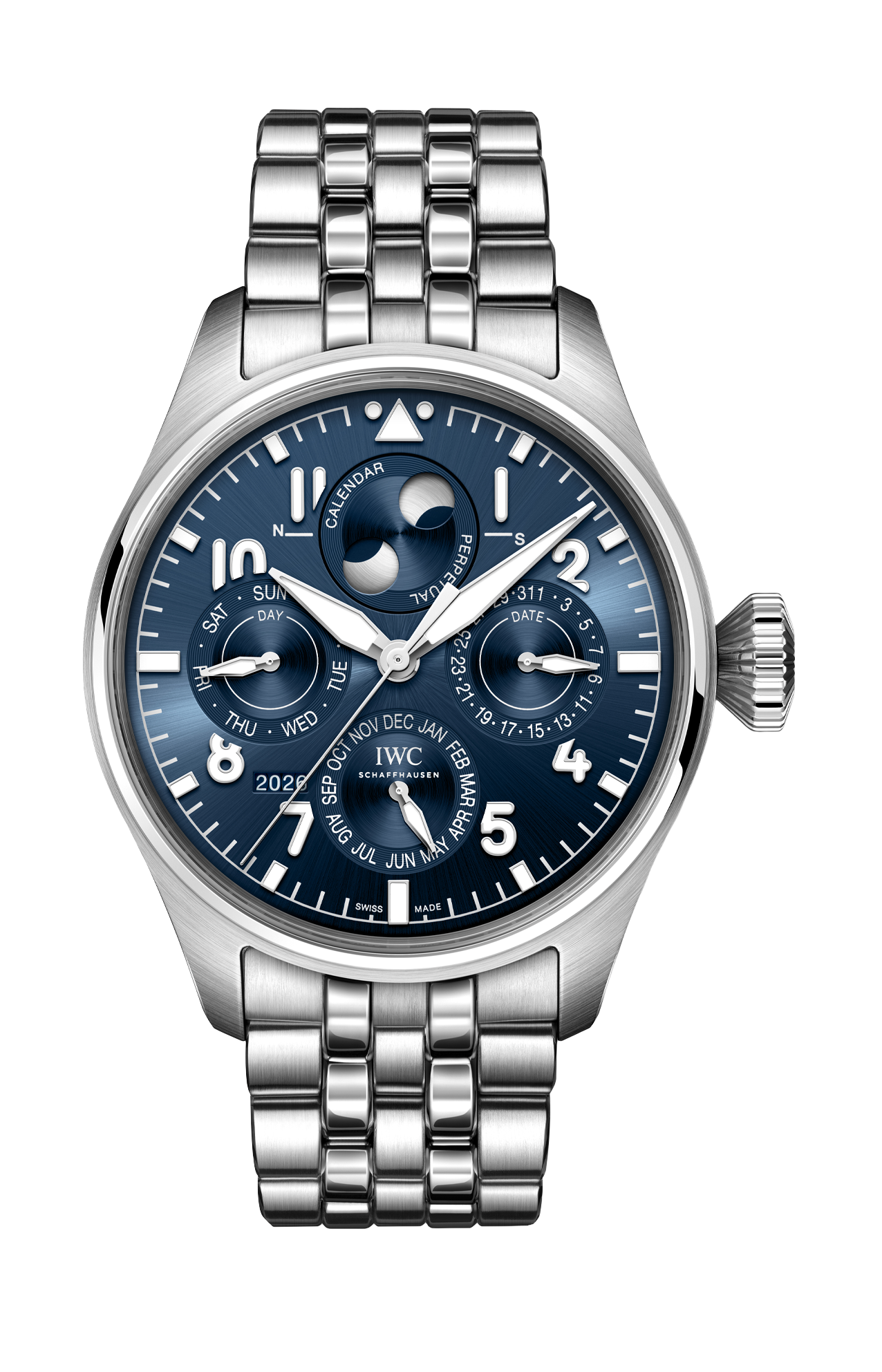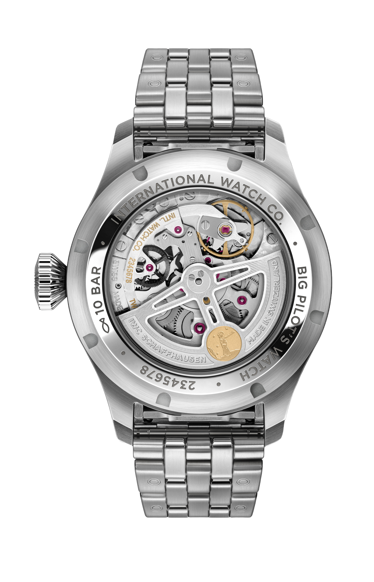 Il Big Pilot’s Watch Perpetual Calendar ProSet Le Petit Prince colpisce per la cassa da 42 millimetri e il bracciale realizzati in robusto e durevole acciaio inossidabile. La cassa è completata da un quadrante blu intenso con finitura soleil, un elemento distintivo delle edizioni speciali IWC create in omaggio al celebre racconto di Antoine de Saint-Exupéry. Le applicazioni rodiate per gli indici e i numeri, insieme alle lancette rodiate, sono riempite con Super-LumiNova® per garantire un’eccellente leggibilità. Il Perpetual Calendar ProSet è il primo calendario perpetuo con indicazione delle fasi lunari che può essere regolato sia in avanti sia indietro tramite una singola posizione della corona, rendendo le correzioni del calendario facili e intuitive quanto impostare l’ora. Ciò è reso possibile da una nuova architettura del modulo, basata interamente su ingranaggi e protetta da cinque brevetti. Molti dei componenti presentano geometrie altamente complesse e sono realizzati con il processo LIGA, una tecnologia di microstrutturazione ad alta precisione che combina litografia ed elettrodeposizione. Il calendario mostra data, giorno della settimana, mese e fase lunare su quattro contatori. La caratteristica indicazione dell’anno a quattro cifre è posizionata tra le ore 7 e le ore 8. Anche il treno di ingranaggi che aziona le fasi lunari è stato riprogettato, con una deviazione di appena un giorno ogni 1.040 anni. L’iconica visualizzazione Double Moon® di IWC mostra la luna così come appare sia dall’emisfero settentrionale sia da quello meridionale. Il modulo del calendario è integrato nel calibro 82665 di manifattura IWC. Il sistema di carica Pellaton è stato rinforzato con componenti realizzati in ceramica praticamente esente da usura, accumulando in modo affidabile una riserva di carica di 60 ore nella molla principale. Oltre a un bracciale in acciaio inossidabile, l’orologio è fornito con un cinturino in caucciù blu. Sia il bracciale in metallo sia il cinturino in caucciù sono dotati del sistema EasX-CHANGE® di IWC, che consente di cambiare il cinturino con un semplice gesto, senza l’uso di strumenti.