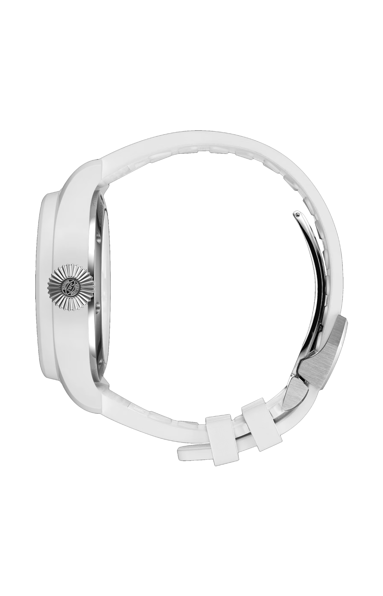 Il Big Pilot's Watch Perpetual Calendar Top Gun Lake Tahoe fa parte della collezione IWC Colori di Top Gun e presenta una cassa da 46,5 millimetri in ceramica bianca. Questo colore della ceramica, definito da IWC e Pantone® come 'Lake Tahoe IWC', si ispira al paesaggio invernale intorno al Lago Tahoe, un'area montuosa che i piloti della vicina scuola di volo Topgun della Marina degli Stati Uniti sorvolano spesso. Il quadrante nero pece e le lancette nere luminescenti, la corona e il fondello in acciaio e il cinturino in caucciù testurizzato bianco completano il design a contrasto. La ceramica bianca è l'emblema dell'ampia competenza di IWC nel campo dei materiali all’avanguardia. La manifattura ha sperimentato questo colore già negli anni '80, poco dopo aver presentato il suo primo orologio da polso con cassa in ceramica nera a base di ossido di zirconio. La ceramica bianca è realizzata tramite un sofisticato processo in cui l’ossido di zirconio è mischiato ad altri ossidi metallici e sinterizzato in una fornace ad alte temperature. La ceramica, altamente resistente ai graffi e straordinariamente leggera, è il materiale perfetto per un Pilot's Watch. Il leggendario calendario perpetuo di IWC è stato sviluppato da Kurt Klaus negli anni '80 e da allora è stato costantemente perfezionato e migliorato. È programmato meccanicamente per riconoscere la diversa durata dei mesi e gli anni bisestili e non necessita di alcuna regolazione manuale fino al 2100. La doppia indicazione delle fasi lunari, brevettata, mostra esattamente la luna vista dagli emisferi nord e sud e presenta uno scarto di un solo giorno ogni 577,5 anni. Il modulo del calendario è azionato da un singolo impulso di commutazione notturno del movimento di manifattura IWC calibro 52616. Il sistema di ricarica automatica Pellaton usa le rotazioni della massa oscillante bidirezionale per accumulare una riserva di carica di 7 giorni in due bariletti. Il movimento è visibile attraverso il fondello in vetro zaffiro.