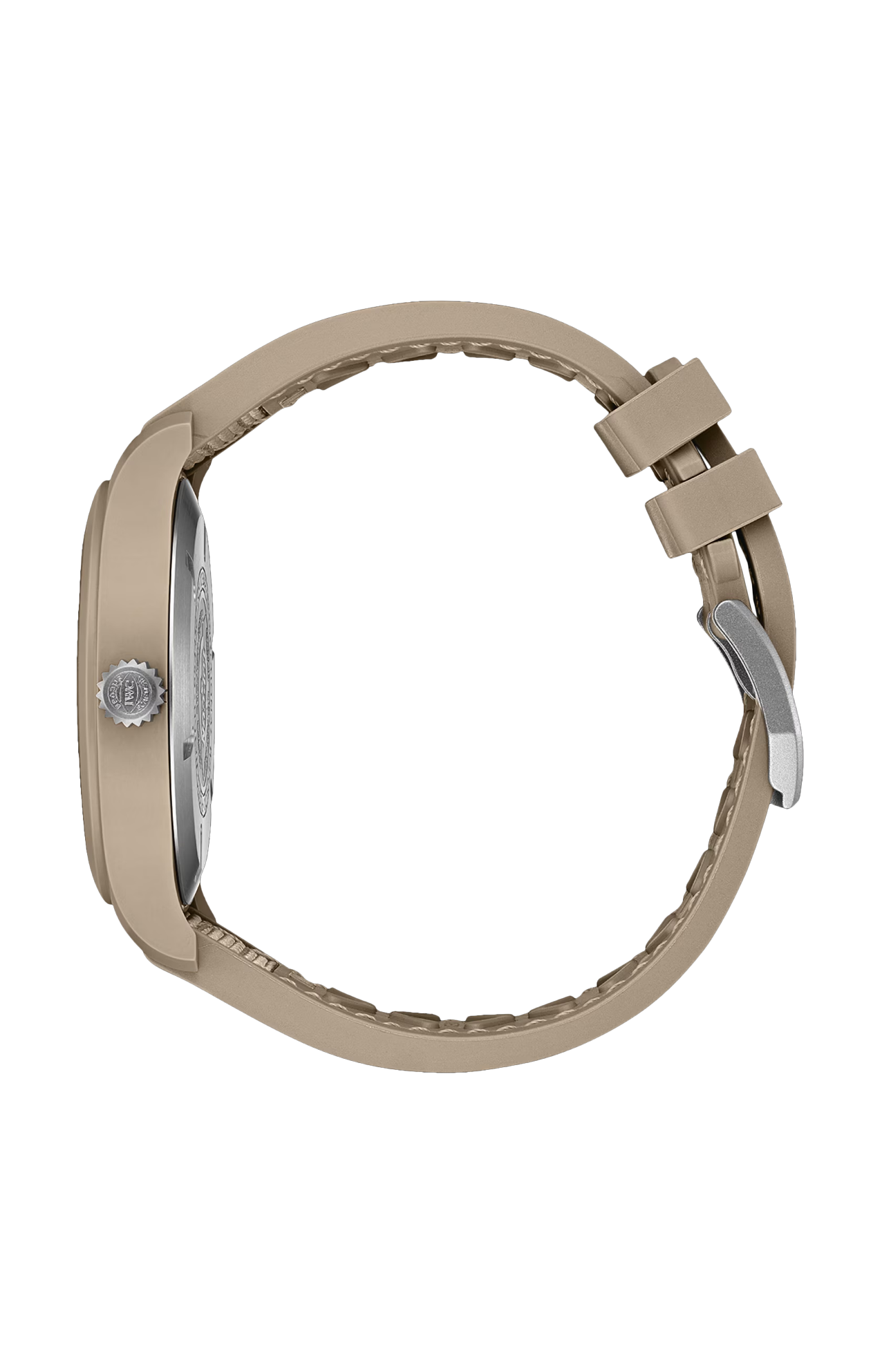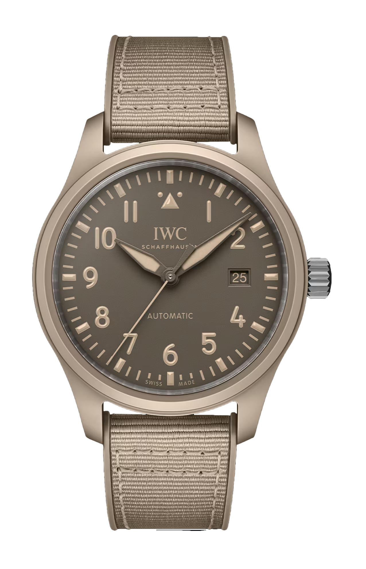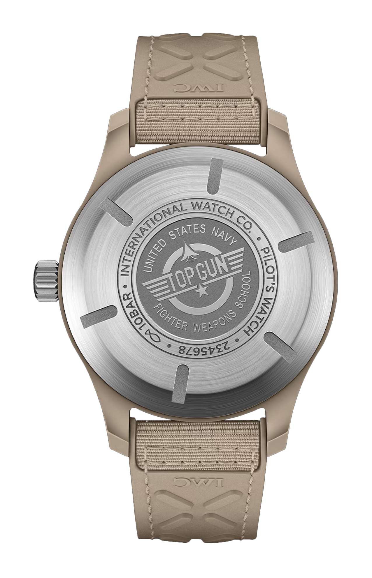 Il Pilot’s Watch Automatic 41 Top Gun Mojave Desert presenta una cassa in ceramica color sabbia e un quadrante marrone chiaro. Vetro zaffiro, bombato, antiriflesso su entrambi i lati, secondi centrali con dispositivo di arresto, datario, vetro zaffiro antidicompressione, cassa interna in ferro dolce per la schermatura dall’irradiazione di campi magnetici.