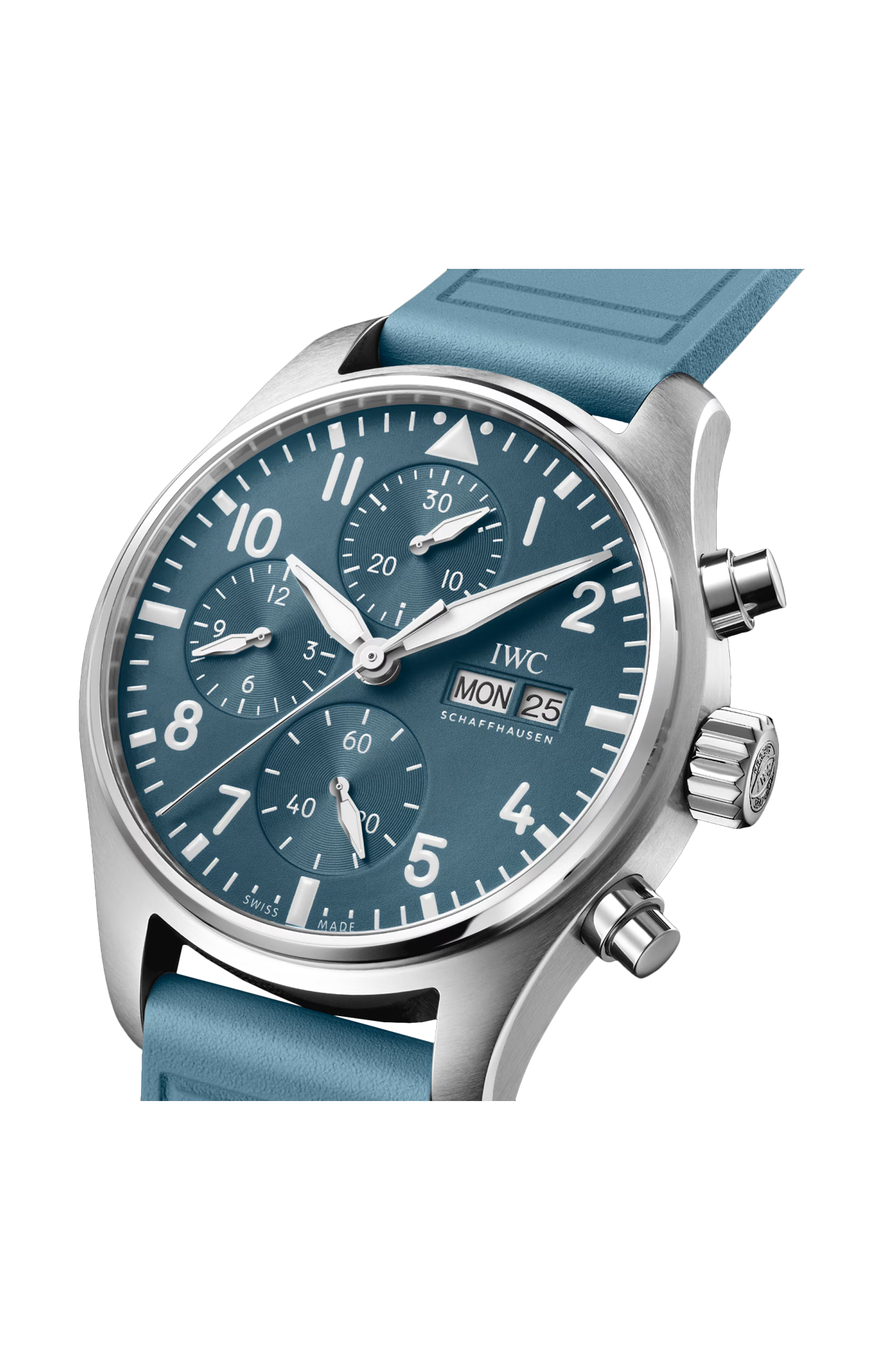 Cassa 41 mm in acciaio, quadrante azzurro. Movimento cronografico a carica automatica con indicazione di giorno e data a ore 3, calibro 69385 di manifattura IWC Schaffhausen, riserva di ricarica 46 ore. Cinturino in caucciù azzurro con sistema EASX-CHANGE® e fibbia ad ardiglione in acciaio. Impermeabilità 10 ATM.