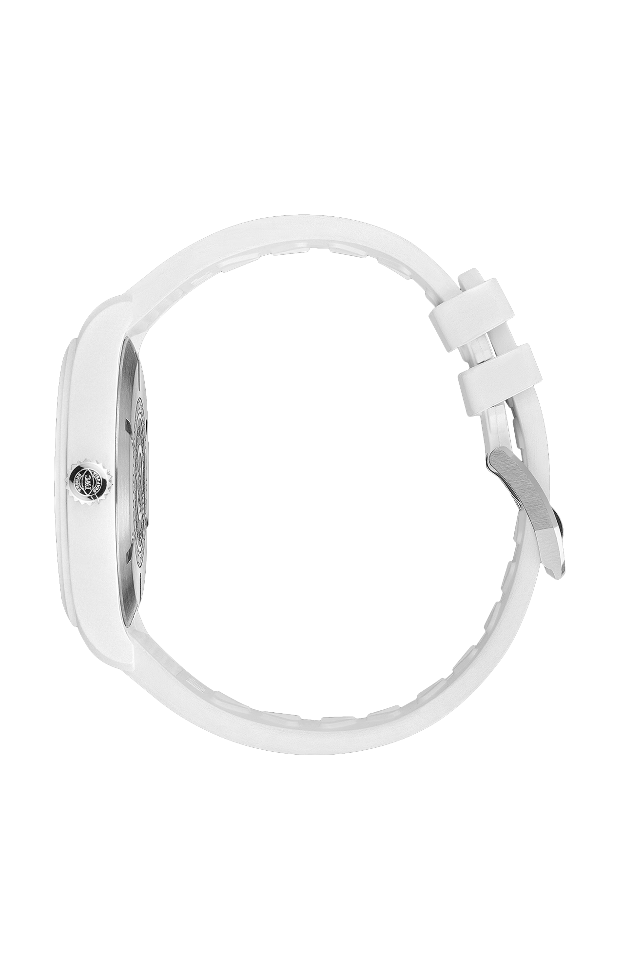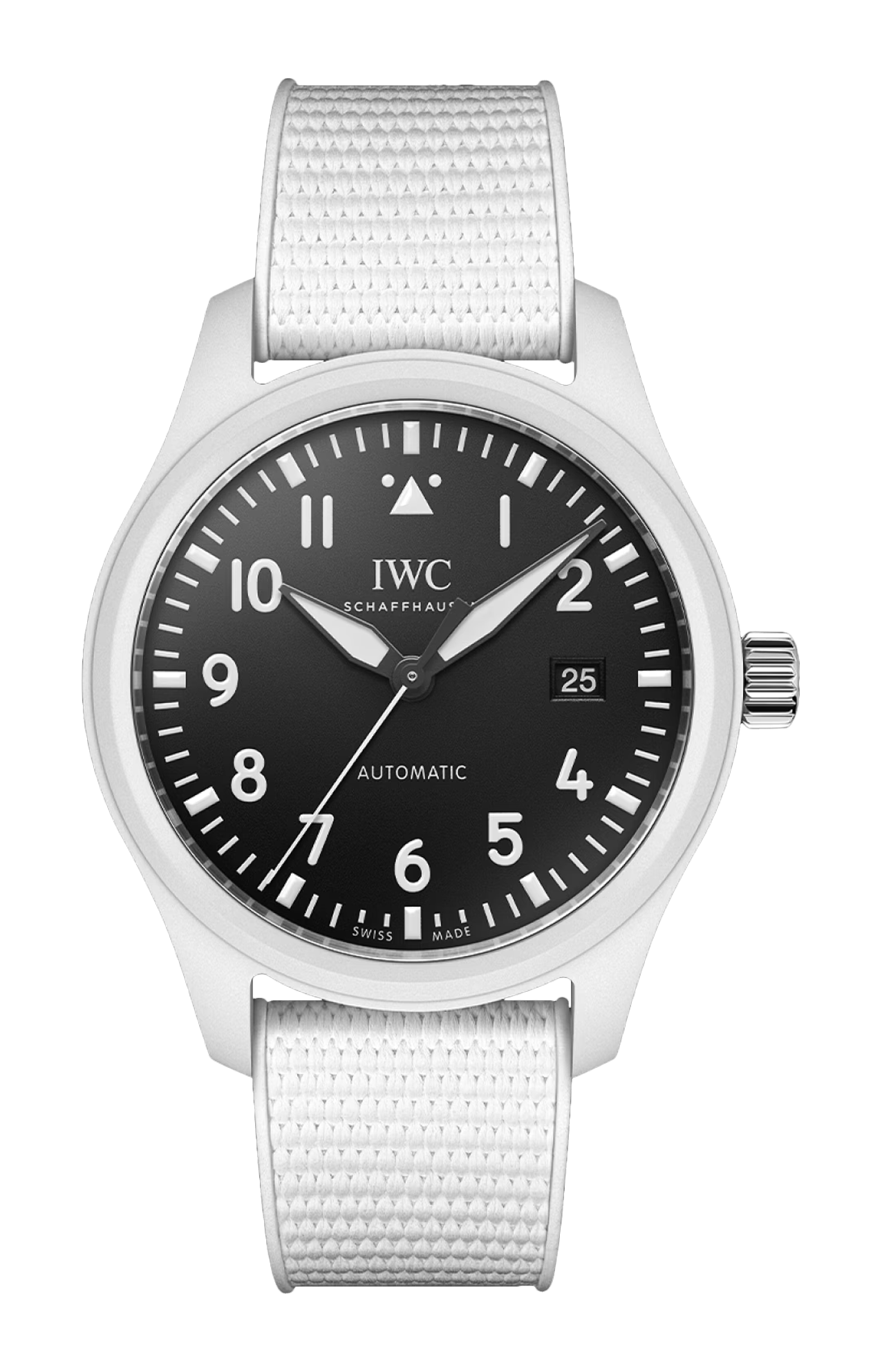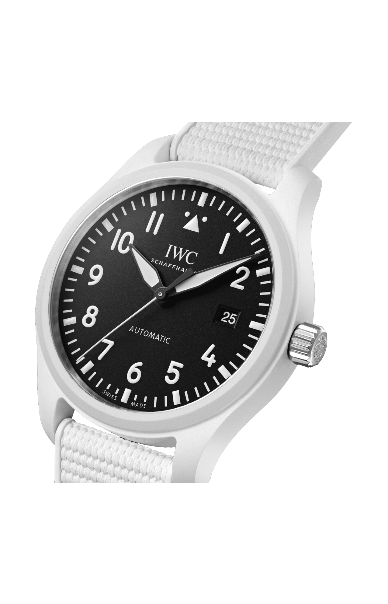 Il Pilot’s Watch Automatic 41 Top Gun Lake Tahoe presenta una cassa di 41 millimetri in splendida ceramica bianca. Il colore ceramico Lake Tahoe si ispira al paesaggio invernale intorno al Lago Tahoe, un’area montuosa spesso utilizzata come campo di addestramento dagli aviatori del vicino programma Strike Fighter Tactics Instructor (SFTI). L’inconfondibile e tenue tonalità bianca si è affermata come uno dei colori di ceramica più emblematici di IWC Schaffhausen. La ceramica bianca viene prodotta mediante un processo complesso, mescolando l’ossido di zirconio con altri ossidi metallici in un rapporto di miscelazione definito con precisione. Queste polveri vengono modellate in una preforma chiamata “corpo verde”, che viene lavorata per avvicinarsi alla geometria finale. Successivamente, la cassa viene sottoposta a un trattamento termico in forno. Dopo questo cosiddetto processo di sinterizzazione, la ceramica ha un valore di durezza di circa 1300 sulla scala Vickers e si colloca tra le sostanze più dure e resistenti ai graffi sulla terra. La cassa in ceramica bianca è completata da un quadrante nero pece con numeri e indici stampati in bianco, mentre le lancette nere sono rivestite con Super-LumiNova® per garantire una perfetta leggibilità. Il fondello in titanio è inciso con l’emblematico logo “Top Gun”. Questo orologio è animato dal calibro di manifattura IWC 32112. Il suo affidabile sistema di carica a cricchetti bidirezionale garantisce una riserva di carica di 120 ore nella molla principale. Il Pilot’s Watch Automatic 41 Top Gun Lake Tahoe è corredato di un cinturino in caucciù bianco con fibbia ad ardiglione in titanio.