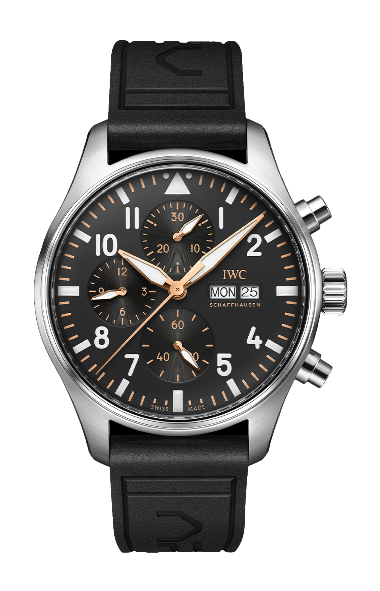 Dedicato al team immaginario “APXGP” del film “F1®” di Apple TV+, il Pilot’s Watch Chronograph 41 APXGP presenta un design nei colori della squadra con elementi neri, dorati e bianchi. Una cassa in acciaio del diametro di 41 millimetri è abbinata a un quadrante nero, stampato con numeri bianchi e indici dorati. Le lancette dei minuti e delle ore e le lancette dei contatori sono placcate oro e riempite con Super-LumiNova® bianca. Il fondello in vetro zaffiro colorato presenta il logo “APXGP” stampato in oro, mentre una speciale incisione al laser sul cinturino in caucciù nero, resistente e impermeabile, commemora la squadra immaginaria del film. Grazie al sistema di cambio EASX-CHANGE®, il cinturino può essere sostituito con la semplice pressione di un pulsante e senza l’ausilio di attrezzi. Il Pilot’s Watch Chronograph 41 APXGP è animato dal calibro di manifattura IWC 69385. Il movimento cronografico meccanico dal design classico con ruota a colonne è stato progettato con un’attenzione assoluta alle prestazioni, all’affidabilità e alla precisione. Consente di misurare accuratamente i tempi di arresto fino a 12 ore ed è dotato di quadranti secondari dal caratteristico layout verticale di IWC. Le ore sono visualizzate a ore 9, mentre i minuti di arresto sono indicati direttamente a ore 12, il che ne rende la lettura particolarmente facile e intuitiva. L’affidabile sistema di carica a cricchetto bidirezionale del movimento accumula una riserva di carica di 46 ore nella molla principale.