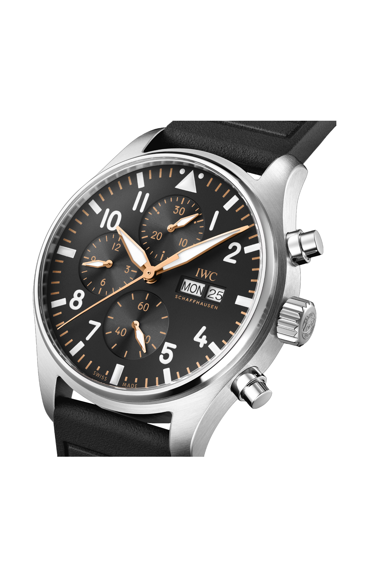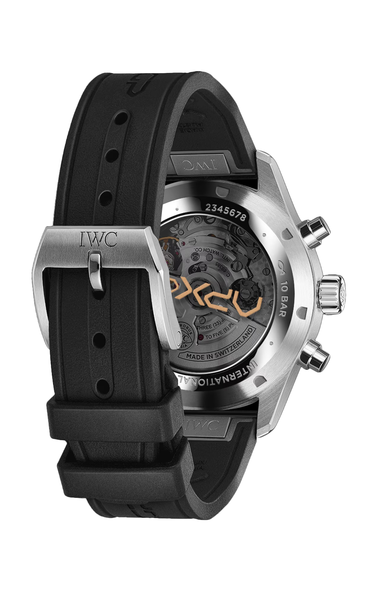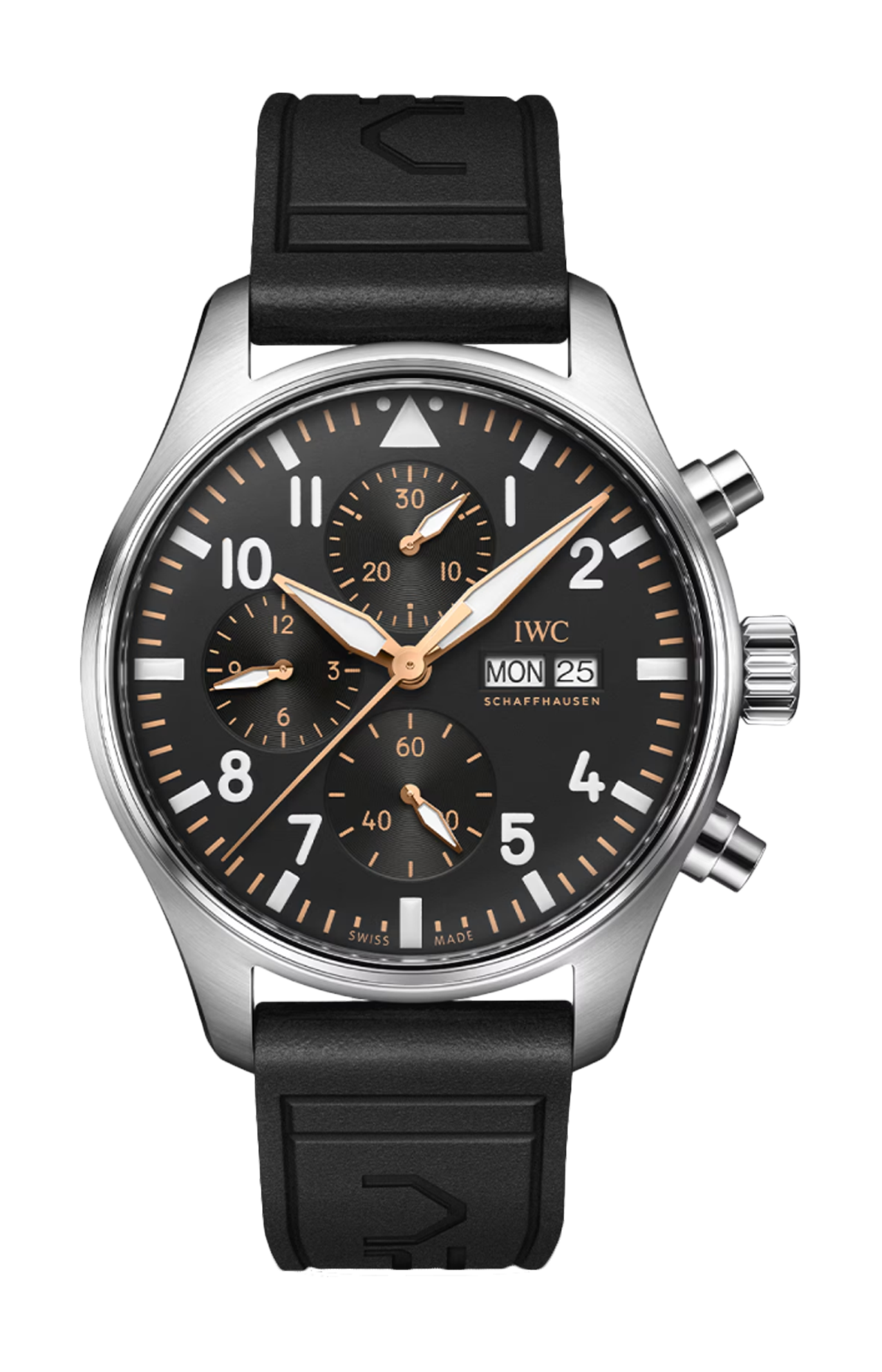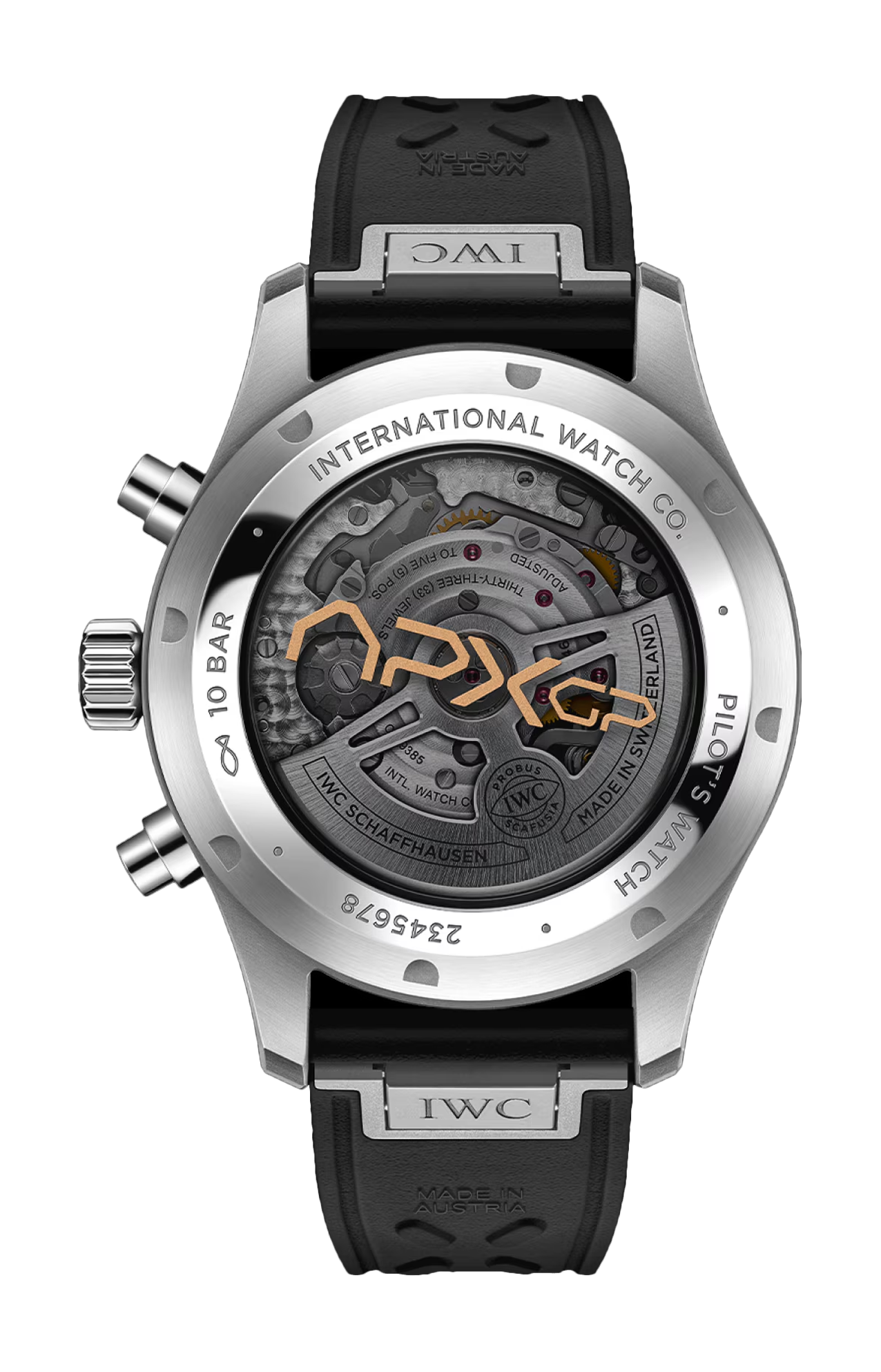 Dedicato al team immaginario “APXGP” del film “F1®” di Apple TV+, il Pilot’s Watch Chronograph APXGP presenta un design nei colori della squadra con elementi neri, dorati e bianchi. Una cassa in acciaio del diametro di 43 millimetri è abbinata a un quadrante nero, stampato con numeri bianchi e indici dorati. Le lancette dei minuti e delle ore e le lancette dei contatori sono placcate oro e riempite con Super-Luminova® bianca. Il fondello in vetro zaffiro colorato presenta il logo “APXGP” stampato in oro, mentre una speciale incisione al laser sul cinturino in caucciù nero, resistente e impermeabile, commemora la squadra immaginaria del film. Grazie al sistema di cambio EASX-CHANGE®, il cinturino può essere sostituito con la semplice pressione di un pulsante e senza l’ausilio di attrezzi. Il Pilot’s Watch Chronograph APXGP è animato dal calibro di manifattura IWC 69385. Il movimento cronografico meccanico dal design classico con ruota a colonne è stato progettato con un’attenzione assoluta alle prestazioni, all’affidabilità e alla precisione. Consente di misurare accuratamente i tempi di arresto fino a 12 ore ed è dotato di quadranti secondari dal caratteristico layout verticale di IWC. Le ore sono visualizzate a ore 9, mentre i minuti di arresto sono indicati direttamente a ore 12, il che ne rende la lettura particolarmente facile e intuitiva. L’affidabile sistema di carica a cricchetto bidirezionale del movimento accumula una riserva di carica di 46 ore nella molla principale.