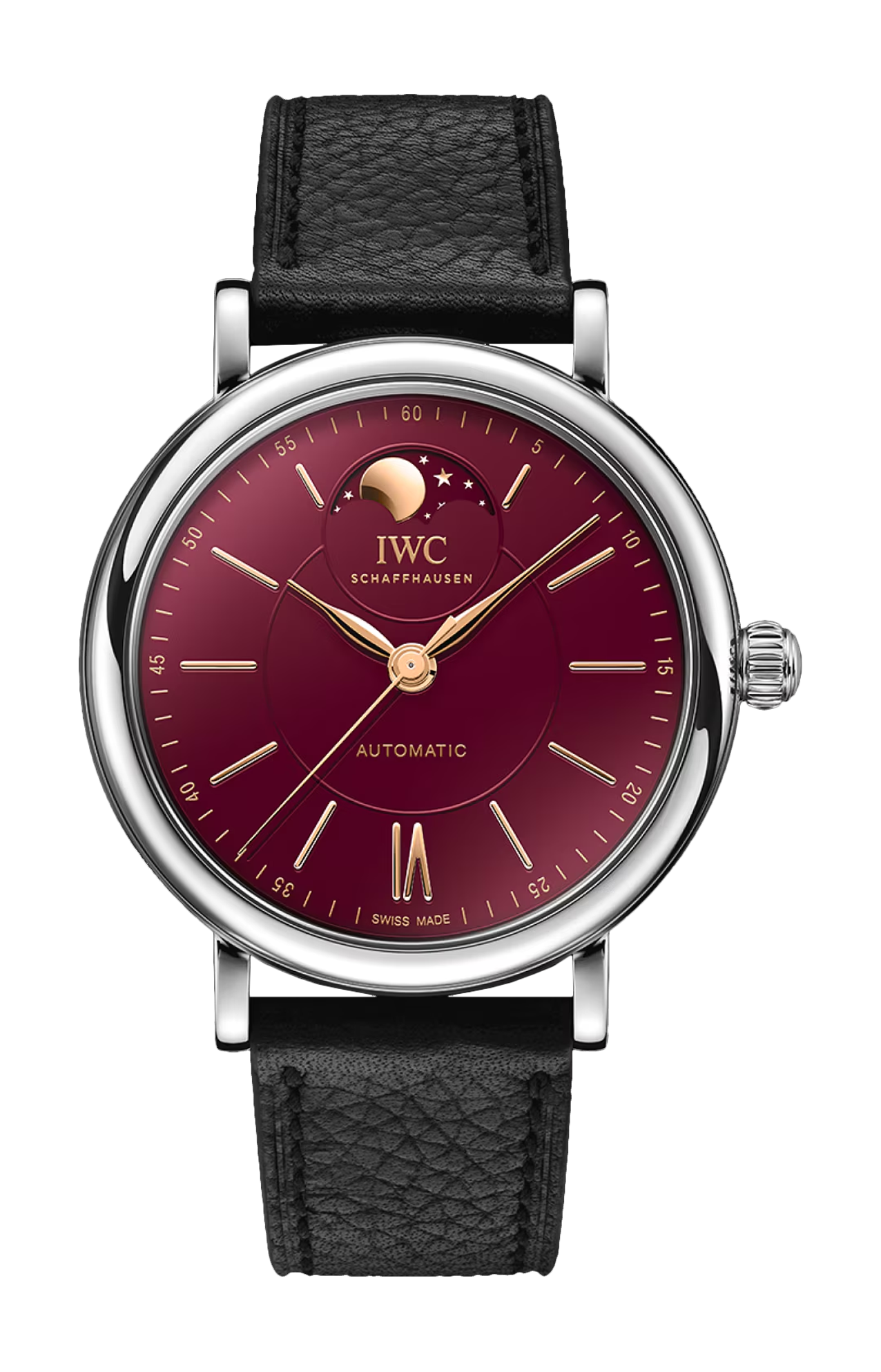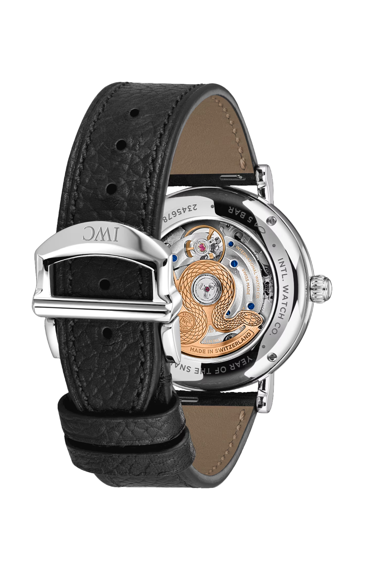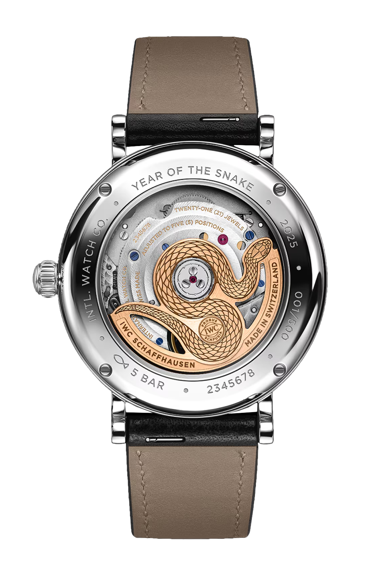 Seguendo una tradizione consolidata, IWC Schaffhausen accoglie il nuovo anno lunare con un’edizione speciale. Il Portofino Automatic Moon Phase 37 Year of the Snake presenta una cassa in acciaio con un diametro di 37 millimetri e un quadrante bordeaux. Questa tonalità unica di rosso simboleggia il colore vibrante del fuoco, tipicamente utilizzato per dare il benvenuto al nuovo anno lunare in Cina. L’indicazione delle fasi lunari a ore 12 è talmente precisa che presenta uno scarto di un solo giorno dall’orbita reale del satellite terrestre dopo 122 anni. La luna e le stelle dorate risaltano sullo sfondo bordeaux e si armonizzano perfettamente con le lancette e gli indici placati oro. L’orologio è animato dal calibro 32800 di manifattura IWC a carica automatica, che garantisce una riserva di carica di cinque giorni. Il retro cela un particolare davvero interessante: la massa oscillante, realizzata in oro massiccio 18 carati, ha la forma di un serpente, in omaggio al nuovo anno lunare. Per una maggiore versatilità, il Portofino Automatic Moon Phase 37 è dotato di due cinturini; uno è realizzato in pelle di vitello nera e l’altro in pelle di vitello bordeaux, entrambi con chiusura a farfalla. Un sistema di sostituzione rapida consente a chi lo indossa di cambiare il look dell’orologio con estrema facilità.