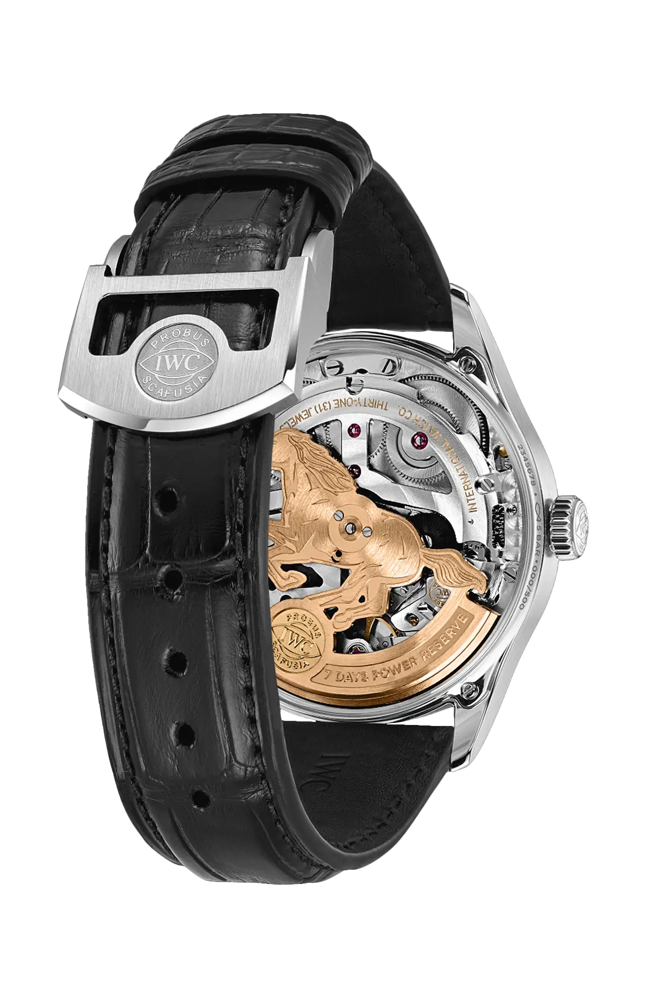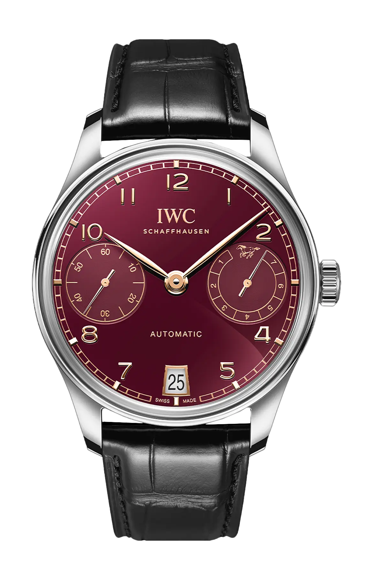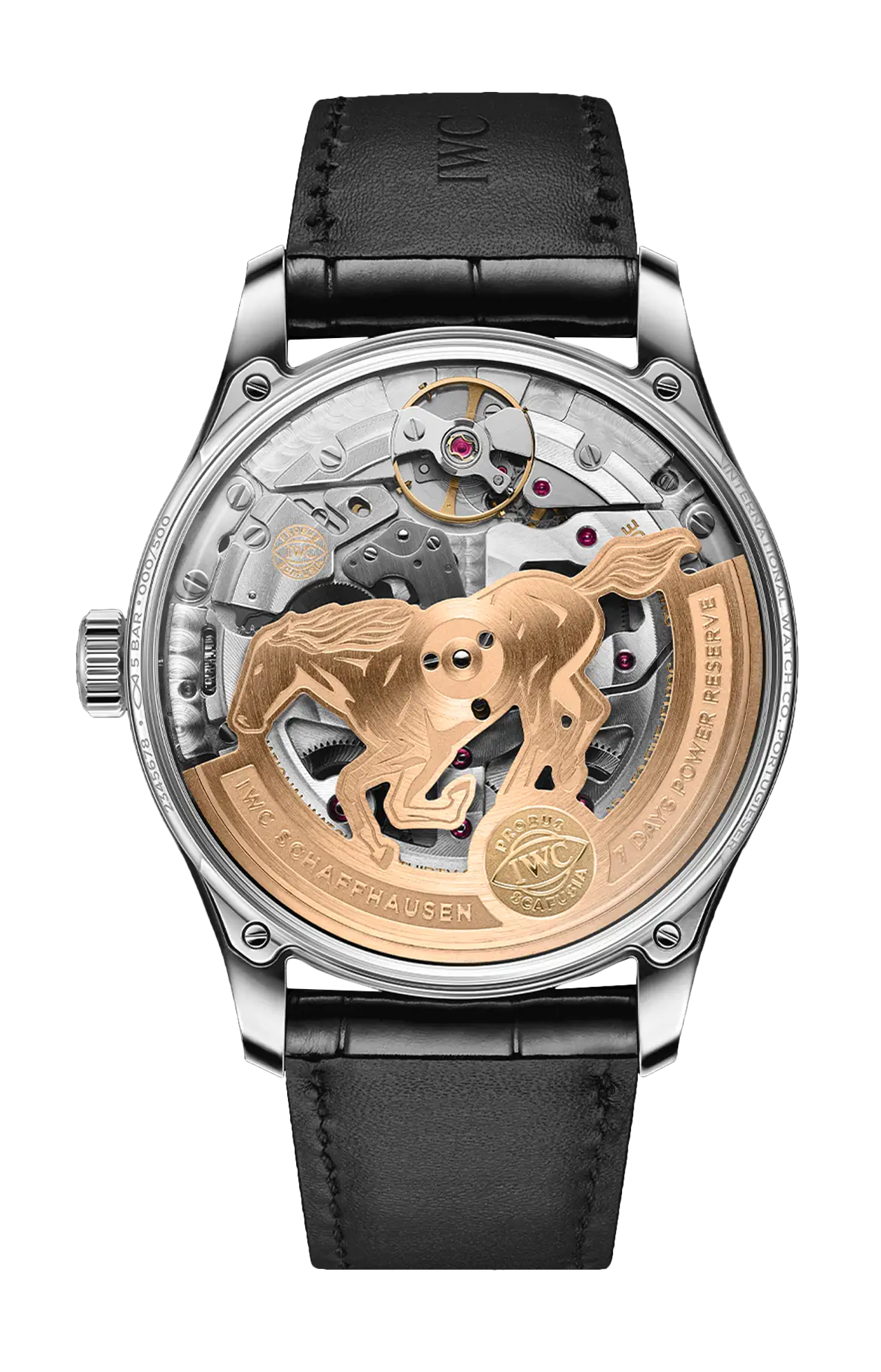 Il Portugieser Automatic 42 Year of the Horse presenta una cassa in acciaio inossidabile, un quadrante bordeaux e lancette e indici applicati dorati. La massa oscillante del calibro 52011 di manifattura IWC è sagomata a forma di cavallo al galoppo, in omaggio al Capodanno lunare.