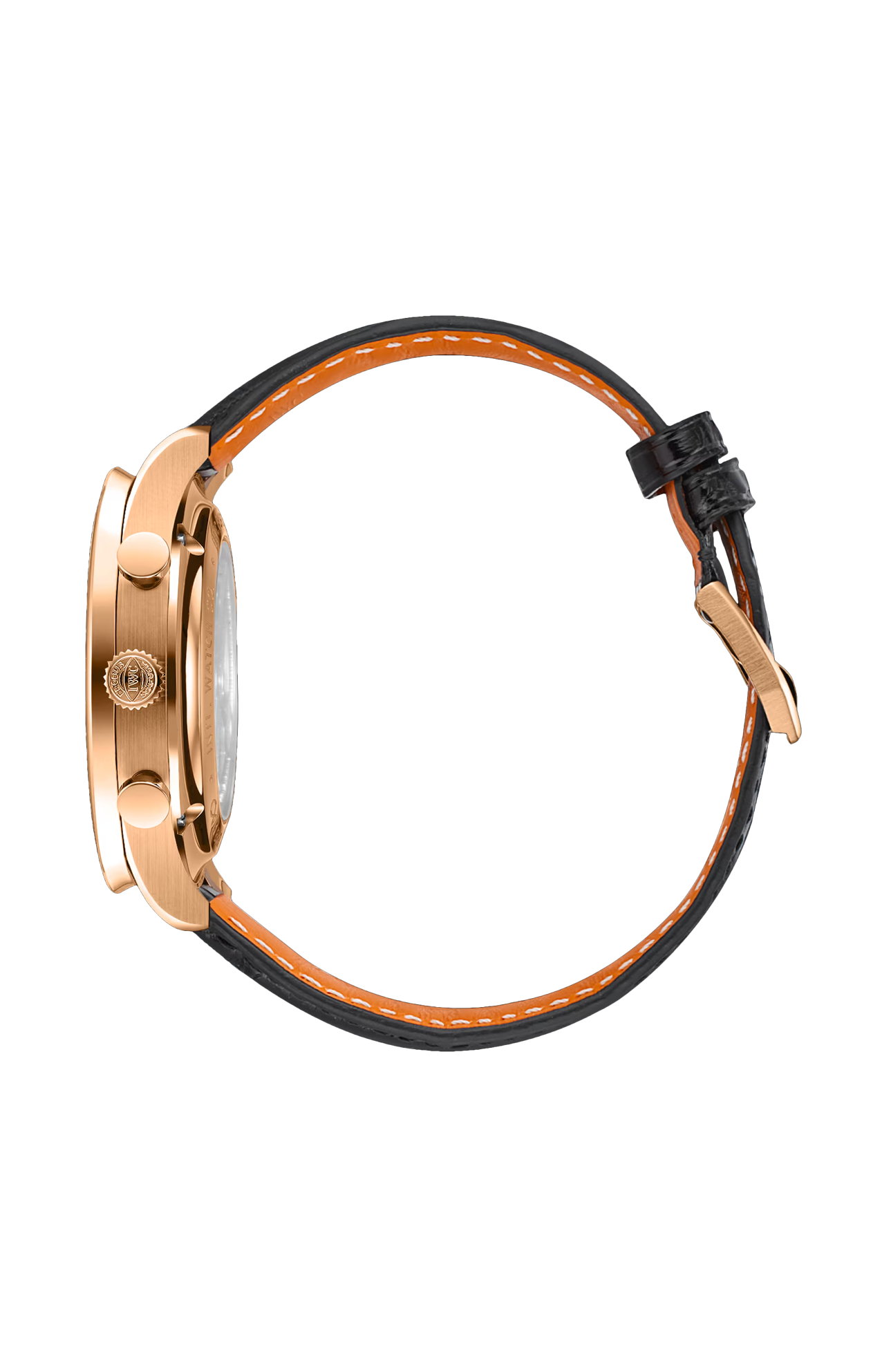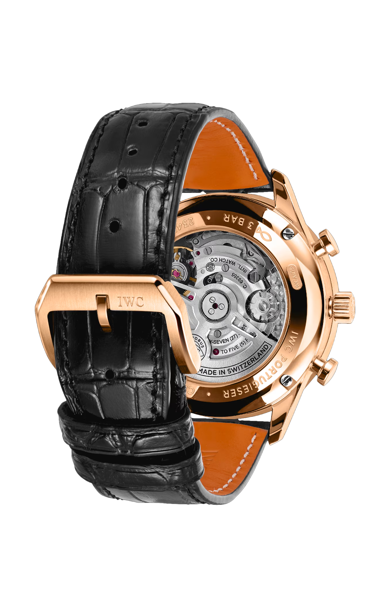 Questa versione presenta una cassa lucida in oro rosso 18 carati dal diametro di 41 mm, quadrante obsidian, lancette dorate e indici applicati in oro. Particolarmente pregevole è il quadrante, realizzato mediante un complesso processo di lavorazione che comprende 60 fasi individuali. La singolare profondità ottica è stata ottenuta applicando 15 strati di laccatura trasparente, che sono stati poi molati e lucidati fino a ottenere una finitura brillante. I contatori sono stati fresati sia nella parte in ottone che nello strato di lacca. Uno speciale processo di stampa enfatizza ulteriormente l’effetto tridimensionale. Infine, gli indici applicati sono montati individualmente a mano sul quadrante. Il Portugieser Chronograph è animato dal calibro 69355 di manifattura IWC, un movimento cronografico meccanico progettato per garantire massime prestazioni in termini di robustezza, affidabilità e durata. L’orologio è corredato da un cinturino in alligatore nero di Santoni con fibbia ad ardiglione in oro rosso 18 carati.