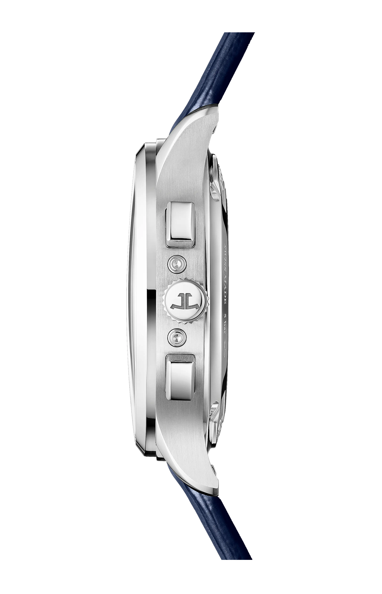 Il Master Control Chronograph Calendar si distingue per la sua eleganza assolutamente al passo con i tempi. Il suo quadrante a raggi di sole è in due tonalità di blu che conferiscono profondità e rilievo al modello. Il blu intenso del centro del quadrante, della scala pulsometrica e delle fasi lunari è completato dal blu più chiaro dei contatori dei piccoli secondi e dei 30 minuti. Al polso, l’effetto visivo è garantito: il cinturino in pelle, anch’esso blu, contrasta con il colore argento degli indici, delle lancette dauphine e della cassa in acciaio con anse ricurve. Infine, il colore rosso vivo dei numeri più importanti dei contatori è un dettaglio raffinato che fa la differenza e non passa di certo inosservato. Con la sua grande leggibilità, questo orologio dotato del calibro di manifattura 759 testimonia tutto il savoir-faire orologiero della grande maison, sia dal punto di vista meccanico che estetico.