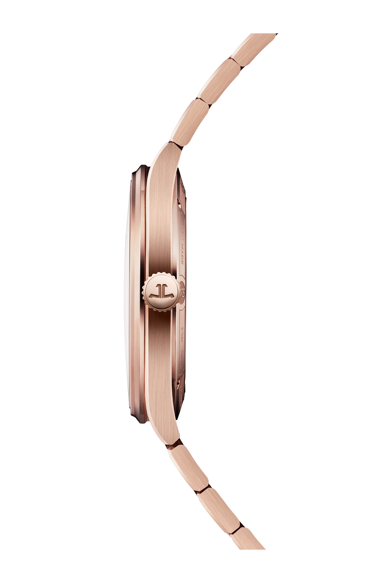 Il Master Control Chronometre Date incarna l’eleganza contemporanea. Realizzata in oro rosa 18 carati (750/1000), la sua raffinata cassa da 38 mm, spessa appena 8,4 mm, presenta un design elegante, completato da un bracciale integrato anch’esso in oro rosa 18 carati (750/1000) con finiture satinate e lucide. Un affascinante quadrante color bronzo con finitura soleil esalta l’eleganza del modello. Animato dal Calibro di Manifattura 899, offre una riserva di carica di 70 ore, l’essenziale funzione della data e una precisione certificata dal sigillo HPG di Jaeger-LeCoultre, che integra gli standard COSC testando l’orologio completo in condizioni reali di utilizzo.