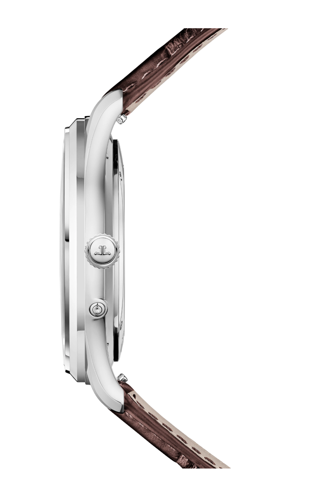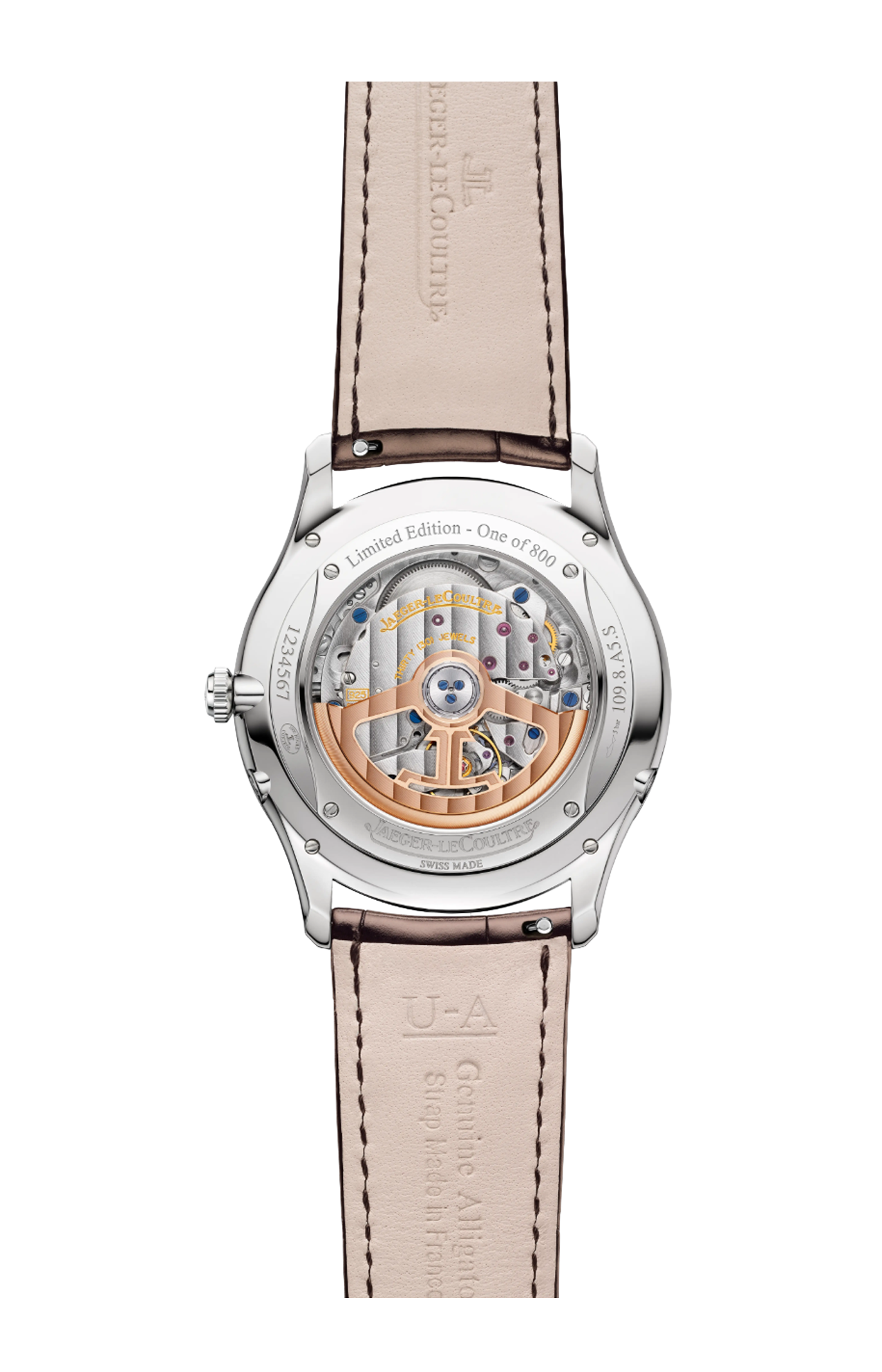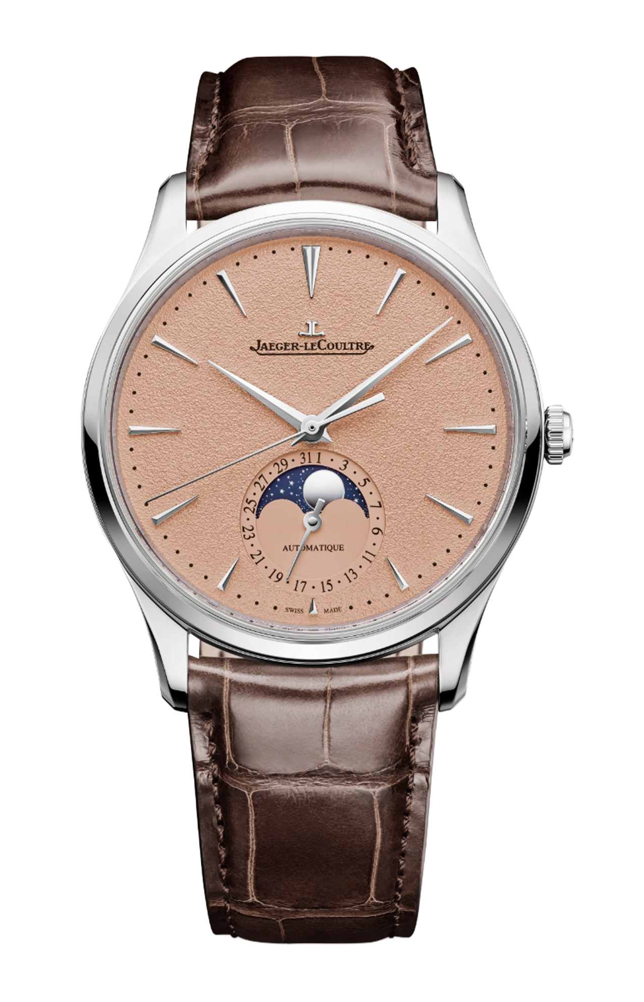 Il Master Ultra Thin Moon incarna un’eleganza raffinata in una cassa in acciaio da 39 mm, con uno spessore di soli 9,3 mm. Con l’indicazione delle fasi lunari discretamente posizionata a ore 6, il quadrante a grana color rame mette in luce una simmetria equilibrata. Gli indici trapezoidali allungati si armonizzano con le iconiche lancette Dauphine, le cui sfaccettature alternate satinate e lucide creano un affascinante gioco di luci. Il cinturino in alligatore marrone, fissato da una fibbia déployante in acciaio, può essere facilmente sostituito. Sul retro, il Calibro di Manifattura 925, interamente progettato e assemblato presso la Grande Maison, rivela finiture meticolose, tra cui smussature, Côtes de Genève e viti azzurrate. Edizione limitata a 800 esemplari.