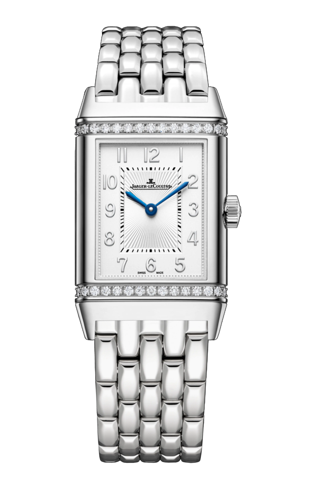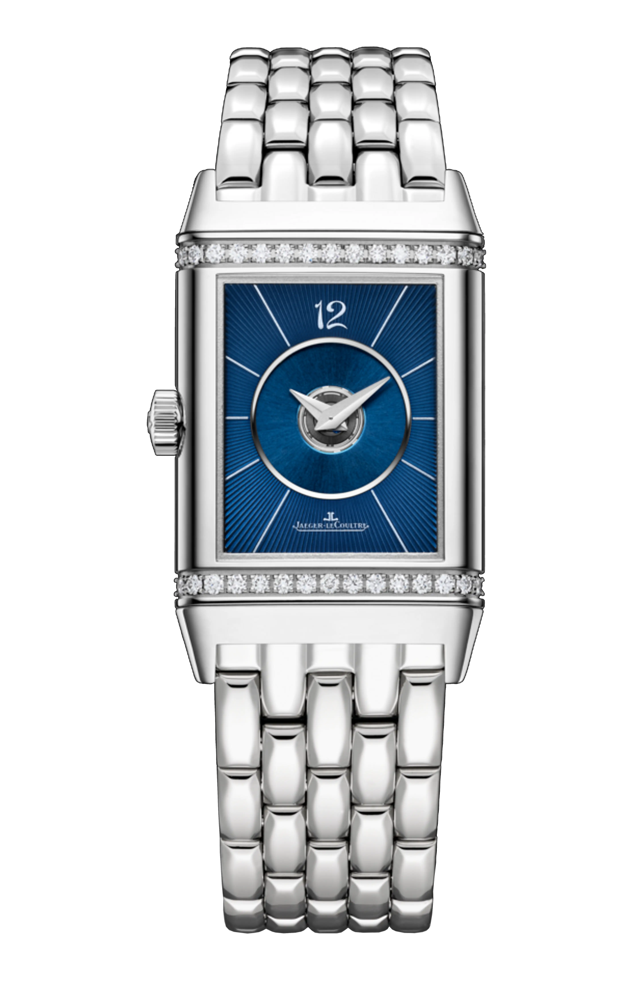 L’estetica raffinata e inconfondibile del Reverso Duetto, su entrambi i lati, crea un forte impatto visivo. Nella tradizione dei primi modelli Reverso, il primo quadrante in stile Art Déco presenta una finitura guilloché opalina a raggi di sole con scanalature incastonate di diamanti. Sul retro, il contrasto di texture tra la finitura soleil e il motivo guilloché del quadrante blu laccato risalta ogni dettaglio: gli indici che formano raggi celesti, il numero 12, le lancette dauphine e una doppia fila di diamanti taglio brillante... Nel cuore del Reverso Duetto, il calibro di manifattura 968 dà vita al concetto Duetto con una doppia serie di lancette che ruotano in direzioni opposte indicando la stessa ora.