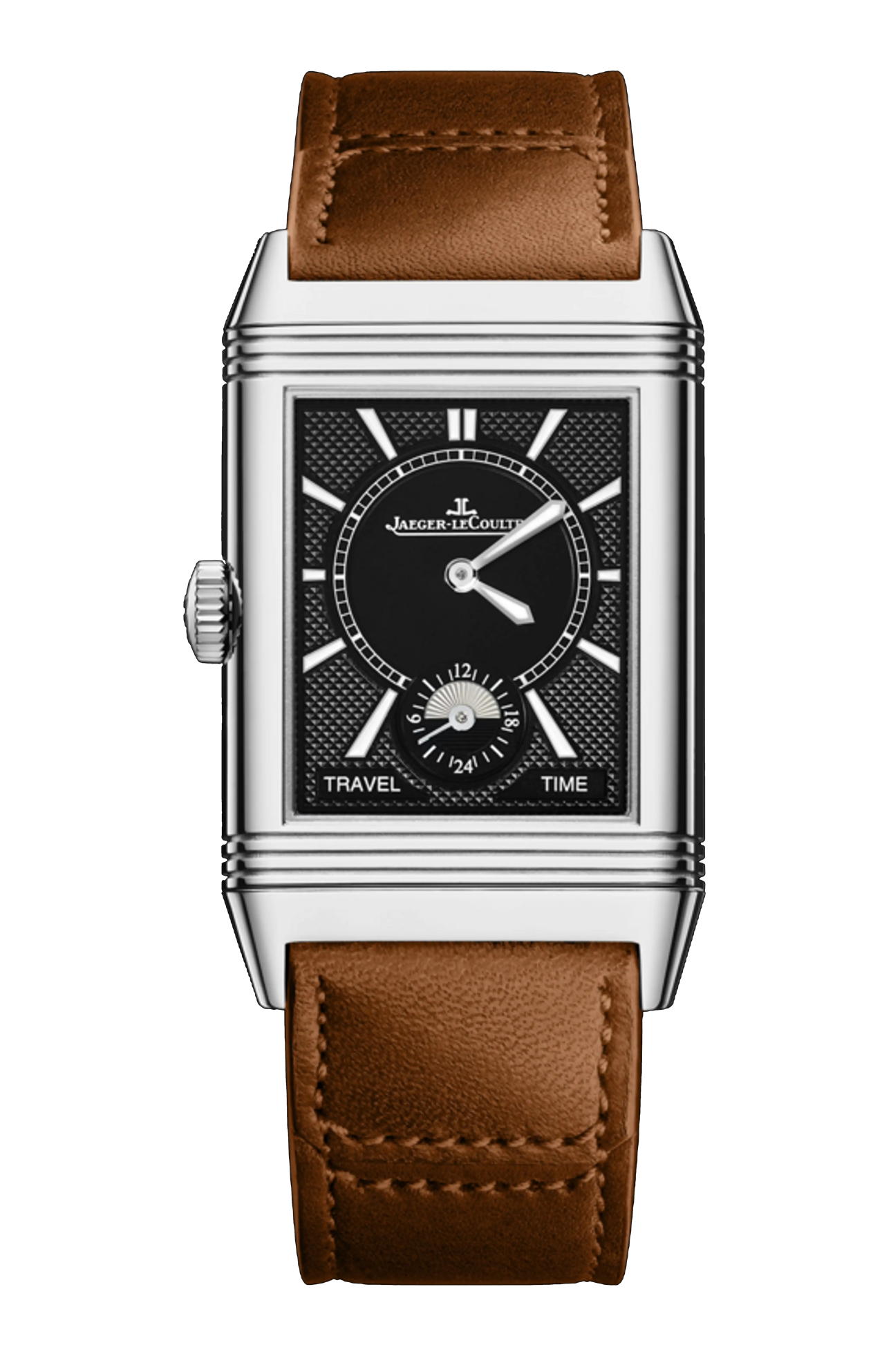 La cassa in grande formato del segnatempo Reverso Classic Large Duoface Small Seconds in acciaio vanta due quadranti per un doppio fuso orario, animati da un movimento unico. Un compagno di viaggio ideale per i viaggiatori più eleganti, è dotato di un secondo piccolo quadrante frontale che enfatizza ulteriormente il suo fascino.