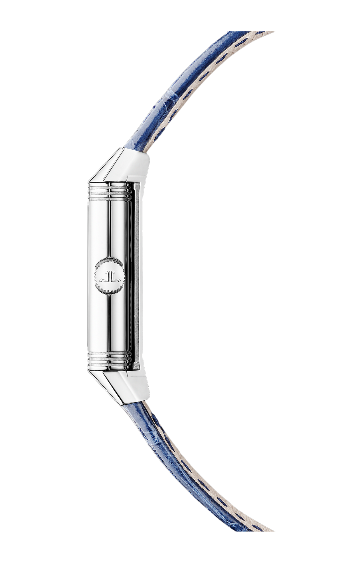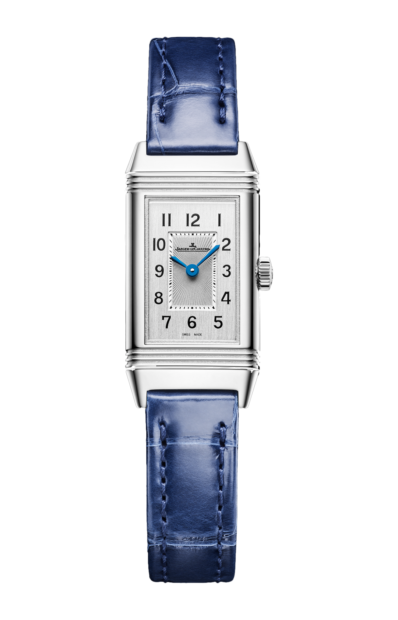 Il Reverso Classic Monoface Origin, con la sua sottile silhouette rettangolare (16,3 mm di larghezza), ricorda le proporzioni delle prime casse Reverso da donna degli anni ‘30. Dotato di un movimento al quarzo, l’orologio presenta le funzioni ore e minuti su un fronte dalle linee pulite ed essenziali, impreziosito dalla doppia finitura del quadrante, guilloché all’interno e spazzolato verticalmente all’esterno. Il quadrante argentato ospita 12 numeri arabi e lancette dauphine azzurrate che riprendono il blu del cinturino in pelle di alligatore delicatamente brillante. Come suggerisce il nome dell’orologio, il retro può essere personalizzato incidendo un motivo, una data o delle iniziali.