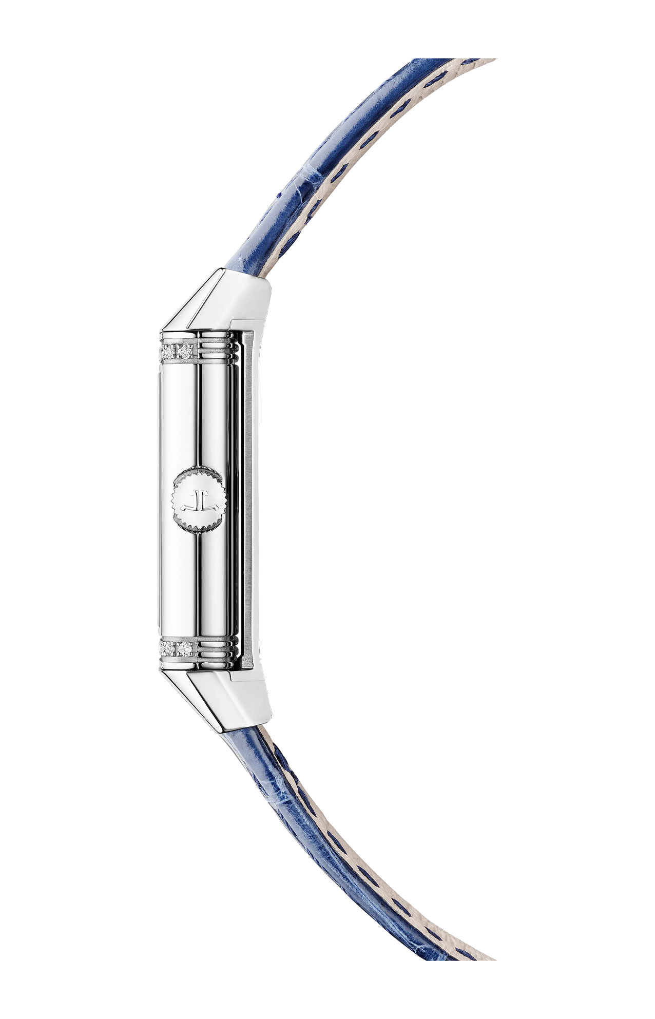 Ispirato alle dimensioni dei primi orologi Reverso da donna degli anni ’30, il Reverso Classic Monoface Origin presenta una raffinata silhouette rettangolare di 32,5 x 16,3 mm. Il quadrante di colore argento sfoggia un doppio motivo distintivo: un delicato guilloché al centro e una finitura spazzolata verticale sul bordo esterno. La superficie è adornata da dodici numeri arabi, mentre le lancette azzurrate richiamano il cinturino in pelle di alligatore blu. Le emblematiche scanalature della cassa sono impreziosite da diamanti, che aggiungono un tocco di alta gioielleria. Il segnatempo è animato da un movimento al quarzo estremamente preciso, che indica ore e minuti. Fedele allo spirito del Reverso, il secondo lato è una tela per incisioni personali.