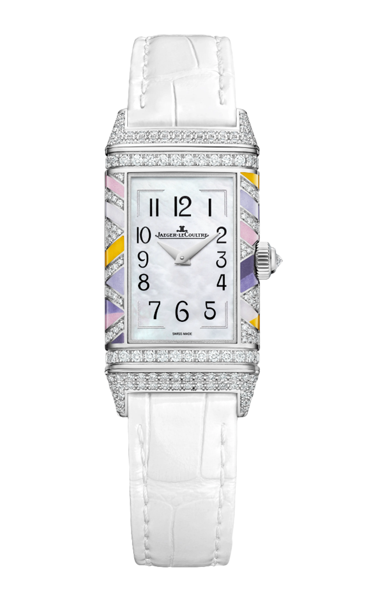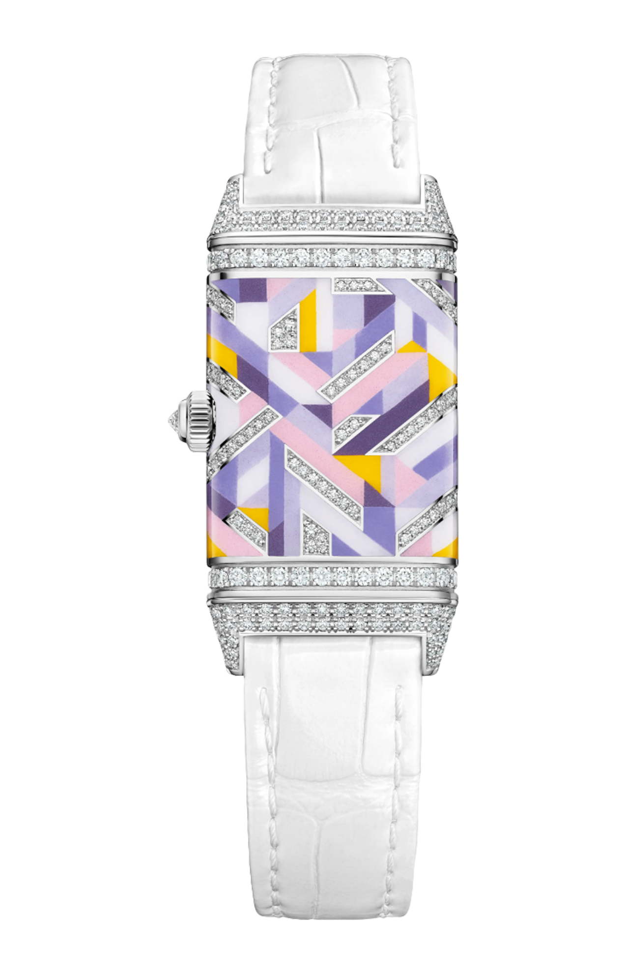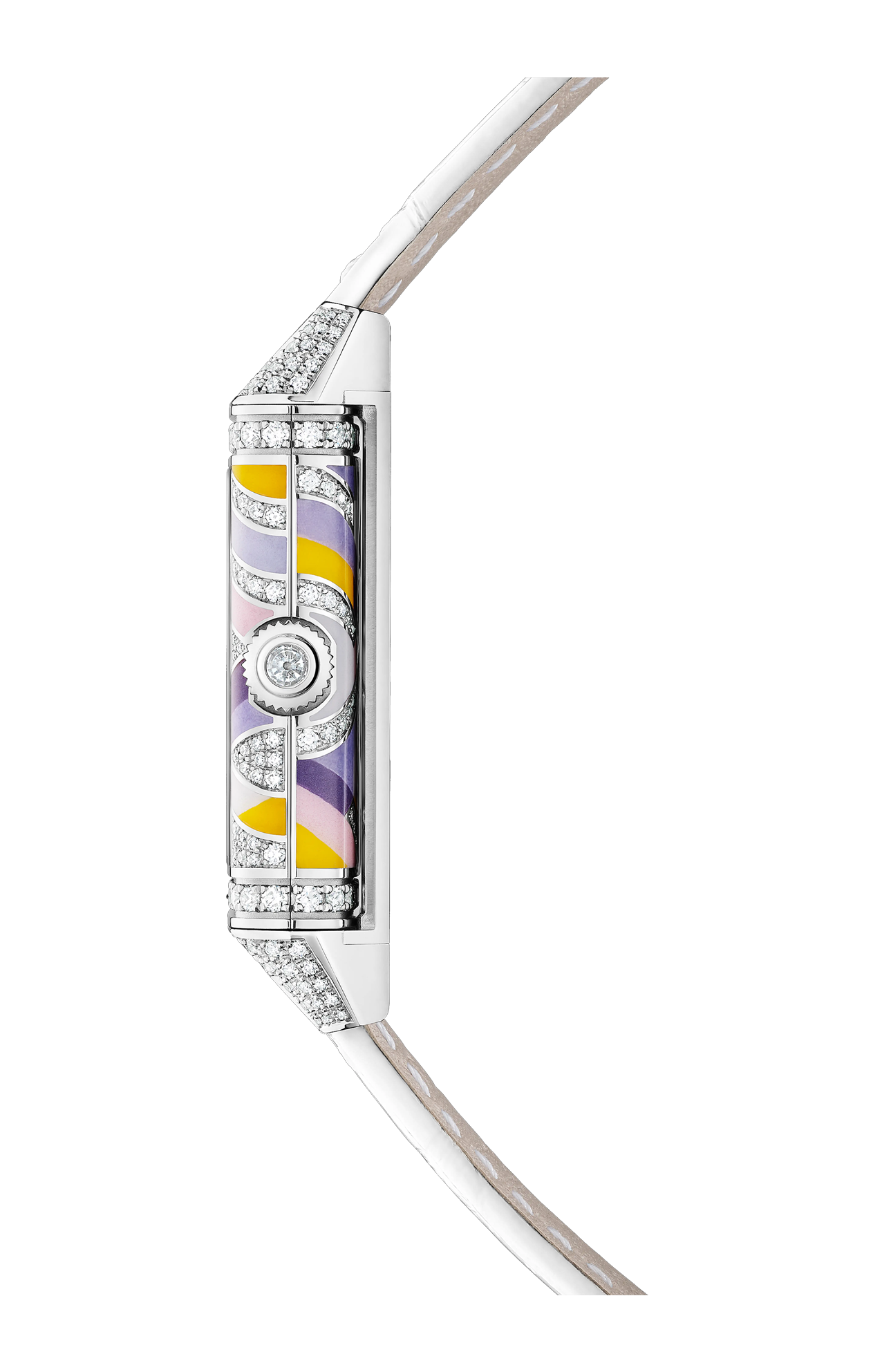 Sui bordi della cassa smaltata e incastonata, il fronte dell’orologio Reverso One Precious Colours lascia intravedere parte dell’elaborato motivo che adorna il retro. Una volta capovolto, il fondello rivela un intreccio di forme geometriche dipinte a mano con smalto Grand Feu in vivaci tonalità pastello. File di diamanti taglio brillante catturano la luce per illuminare le linee colorate, i quadrati e i triangoli realizzati in smalto dipinto in miniatura. Incarnando appieno lo stile Art Déco, il motivo si integra con la cornice decalcatata sul quadrante in madreperla. Agli artigiani del nostro atelier dei Mestieri Rari™ sono necessarie circa 100 ore di lavoro manuale per elevare questo orologio agli alti standard della gioielleria. Edizione limitata a 10 esemplari.