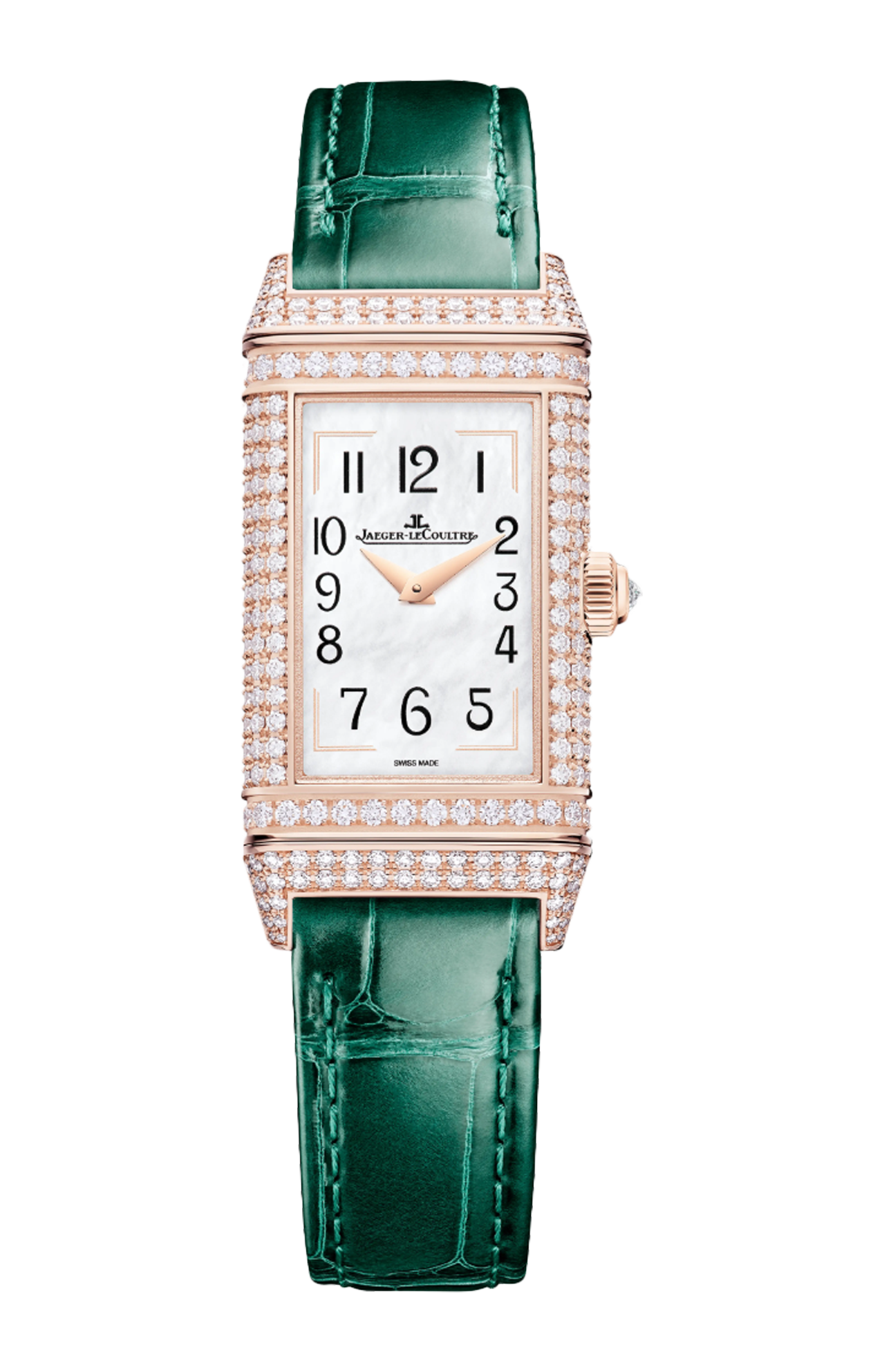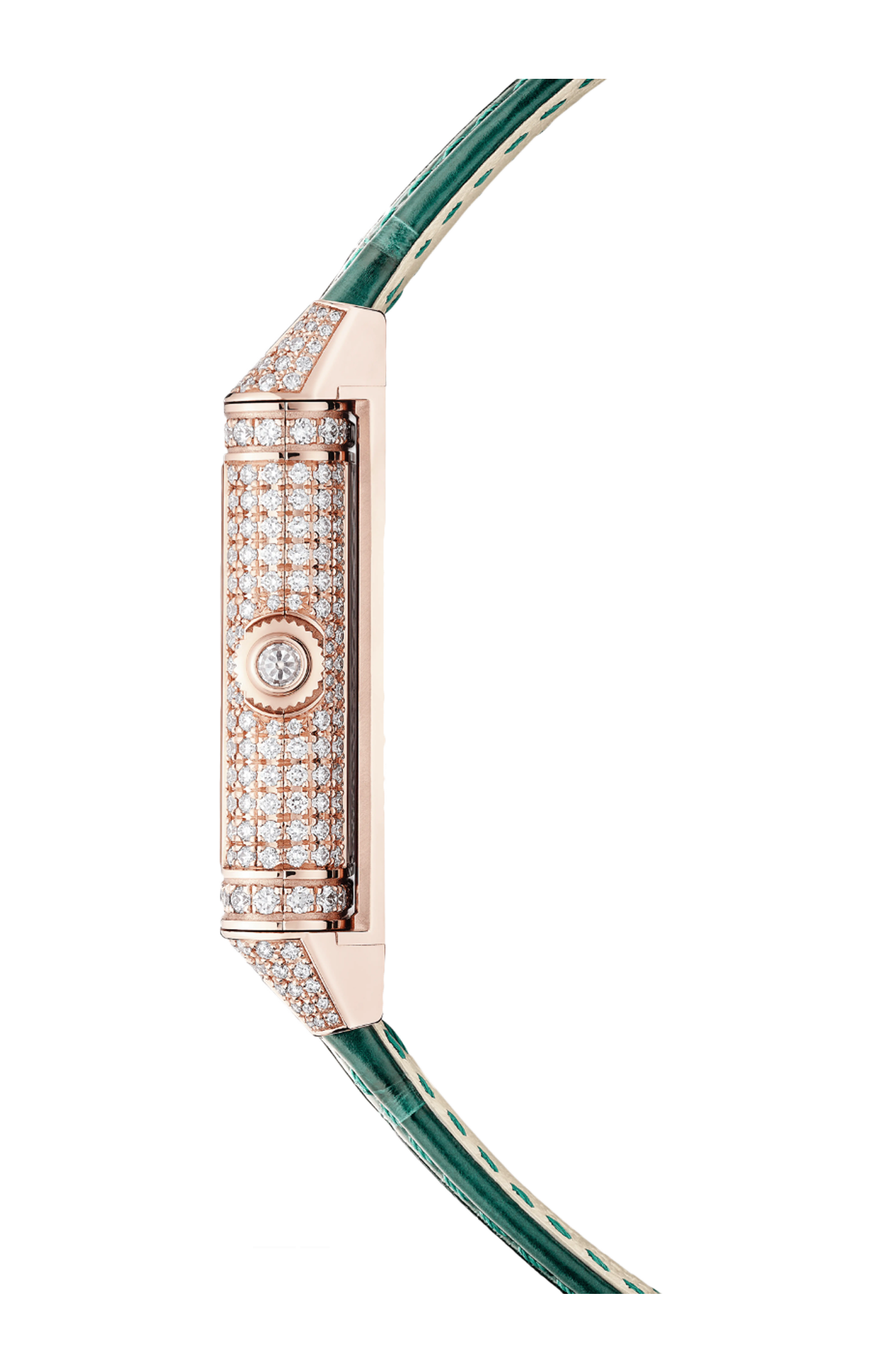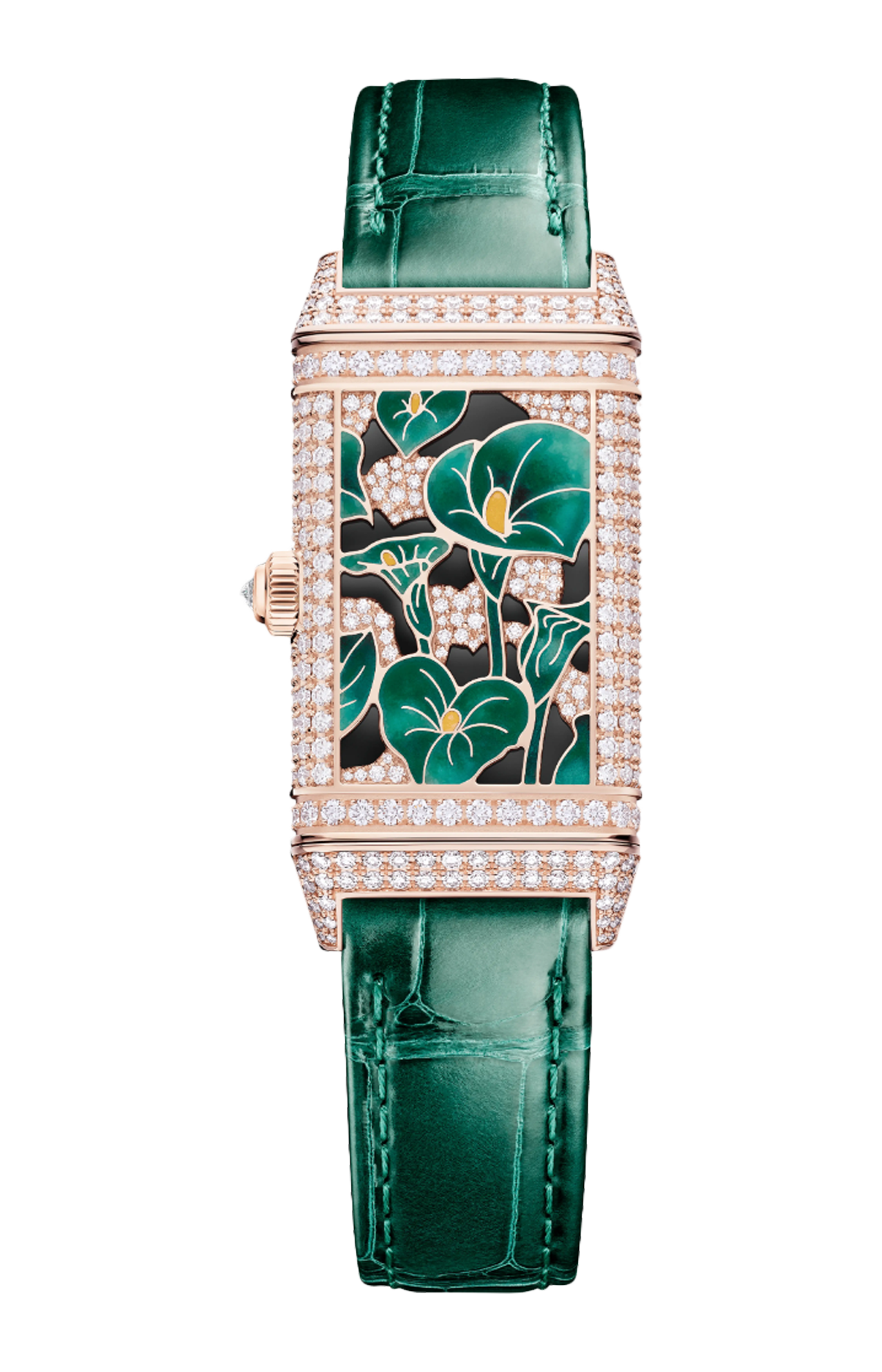In linea con le interpretazioni floreali della collezione, l’orologio Reverso One Precious Flowers esprime il savoir-faire orologiero e i mestieri rari della Maison. Su questo orologio-gioiello in oro rosa, i nostri artigiani dimostrano tutto il loro talento nell’incastonatura delle gemme e nella smaltatura. La cassa racchiude un quadrante in madreperla bianca, impreziosito da 12 numeri arabi incorniciati dai quattro angoli Art Déco tipici della collezione. Sul retro, la decorazione è realizzata con la combinazione di tre tecniche distinte: i fiori di calla sono creati con lo smalto Champlevé Grand Feu, una tecnica che richiede non meno di cinque fasi e diverse cotture in forno a 800 °C. Questo bouquet di calle si staglia su un campo di diamanti incastonati a neve. La sola incastonatura dei 409 diamanti richiede 45 ore. I pezzi laccati neri sono applicati a mano, aggiungendo contrasto e profondità al motivo. Edizione limitata di 10 esemplari.