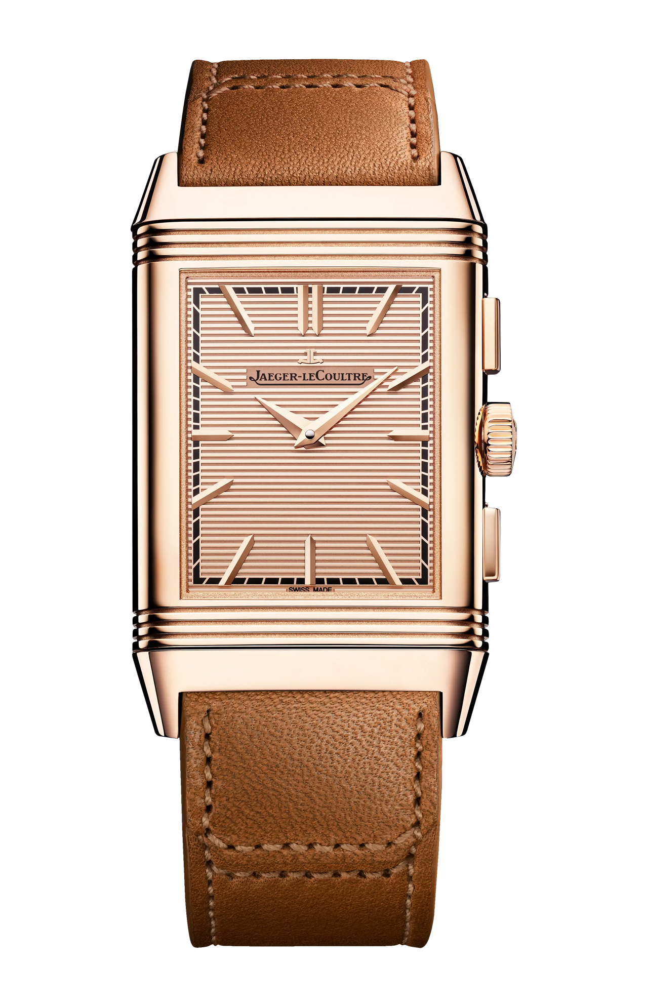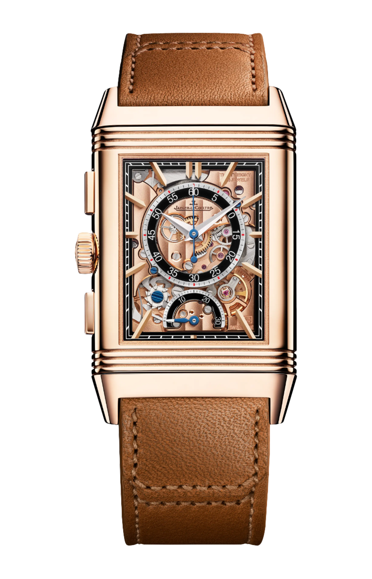 Nel Reverso Tribute Chronograph, la cassa, il quadrante e il calibro 860 sono impreziositi dall’oro rosa. Sotto un quadrante interamente in oro sul fronte, il retro altamente sofisticato rivela il funzionamento del cronografo con il suo contatore retrogrado dei 30 minuti. L’eccellente leggibilità del savoir-faire orologiero è qui davvero evidente: indici applicati, minuteria “chemin de fer” fluttuante sul rehaut, lancetta dei minuti azzurrata, ponti scheletrati e smussati... Con una coppia di cinturini intercambiabili inclusi – uno in pelle di vitello marrone basato su un design di casa Fagliano e l’altro in alligatore nero – l’orologio Reverso Tribute Chronograph offre al tempo stesso versatilità e raffinatezza. Edizione limitata a 250 esemplari.