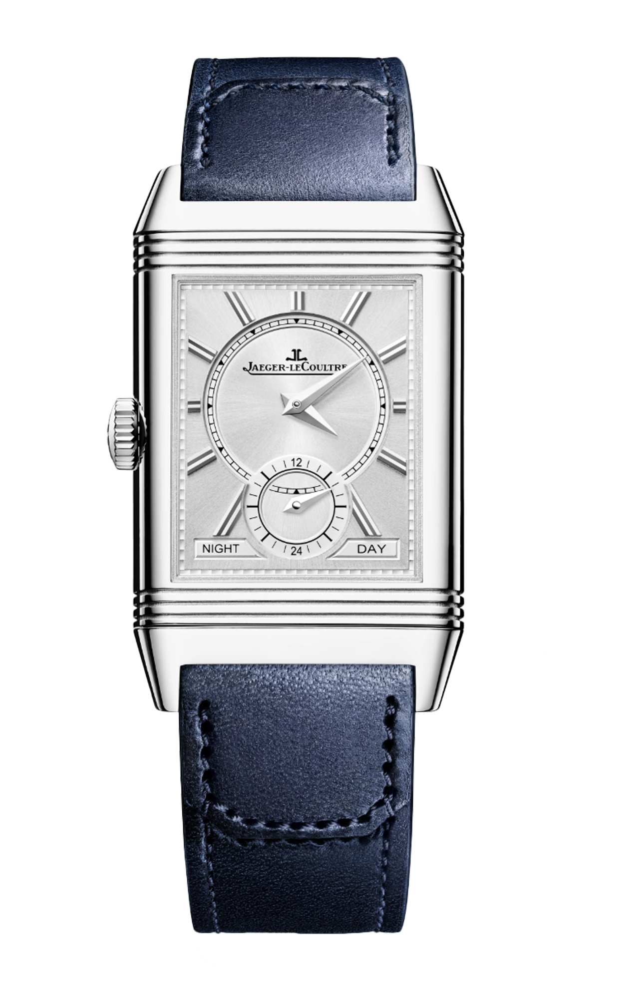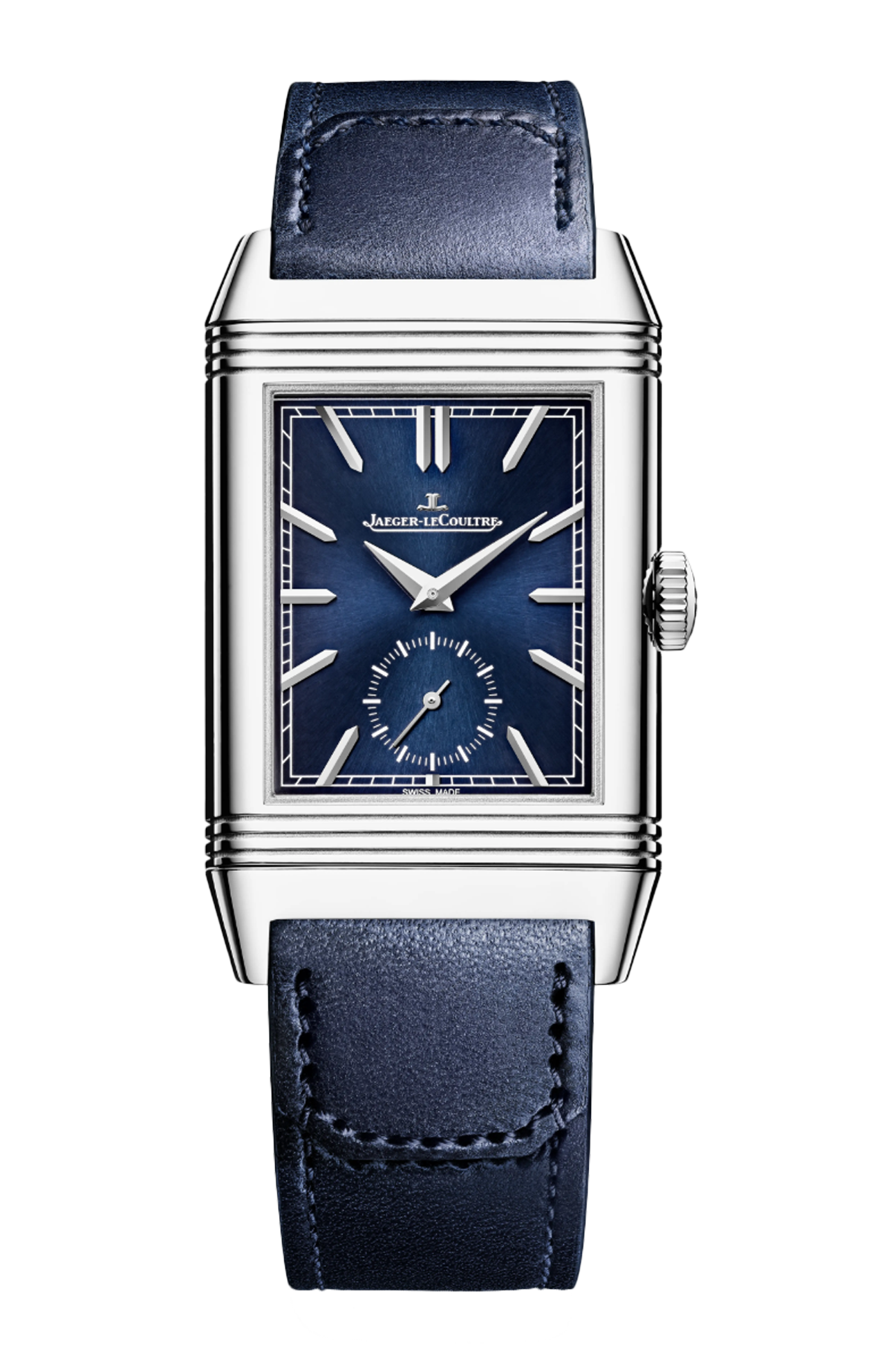 Dotato della complicazione Duoface, l’orologio Reverso Tribute Duoface Small Seconds si ispira ai codici Art Déco dei primissimi modelli del 1931. Sul fronte, il quadrante blu laccato a raggi di sole mostra chiaramente le sue caratteristiche e funzioni: la minuteria “chemin de fer”, gli indici trapezoidali applicati, le lancette dauphine e i piccoli secondi a ore 6. Sul retro, il quadrante argentato con finitura soleil lascia spazio a un indicatore giorno/notte centrato a ore 6. Il secondo fuso orario si regola facilmente tramite un pulsante posto sul lato della cassa in acciaio. L’orologio è dotato di due bracciali disegnati da Casa Fagliano: il primo in pelle blu; il secondo, dello stesso colore, in pelle e tela.