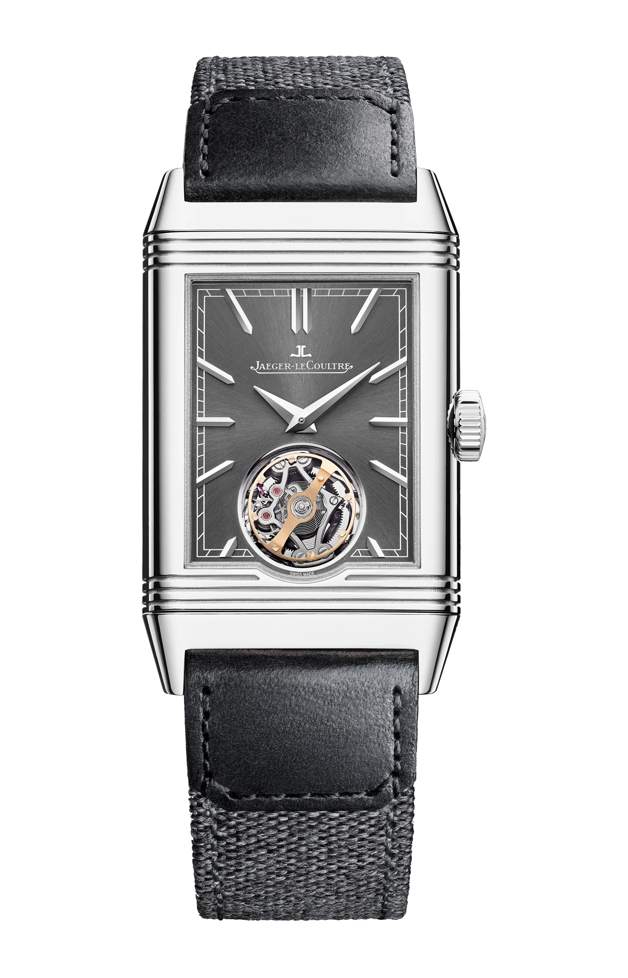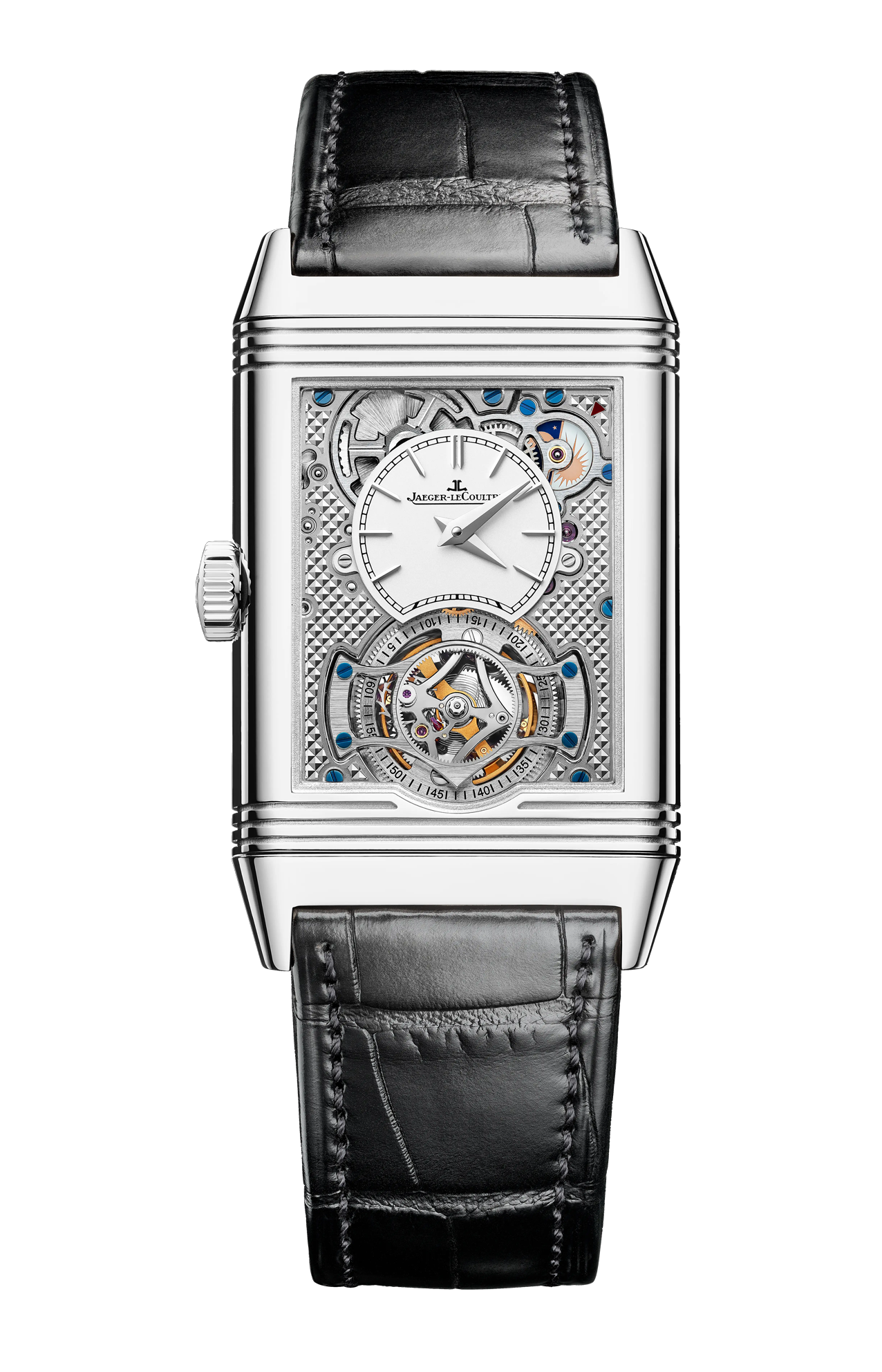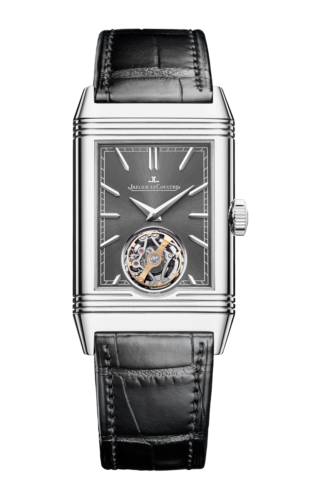 Nell’orologio Reverso Tribute Duoface Tourbillon, l’assenza di un ponte superiore conferisce al tourbillon volante e alla sua spirale a forma di S un ruolo di particolare bellezza. Dotato di 62 componenti e con un peso inferiore a 0,5 grammi, il tourbillon è stato assemblato a mano nell’atelier delle Grandi Complicazioni. Nella sua cassa in acciaio, il Reverso Tribute Duoface Tourbillon ospita il calibro di manifattura 847, di soli 3,9 mm di spessore, caratterizzato dal concetto Duoface. Con il suo sobrio quadrante grigio con finitura soleil, il fronte nasconde un lato opposto realizzato presso l’atelier dei Mestieri Rari™. Rifinito a mano con motivo Clous de Paris, il ponte ha richiesto 232 linee di guillochage, per un totale di 1.392 gesti.