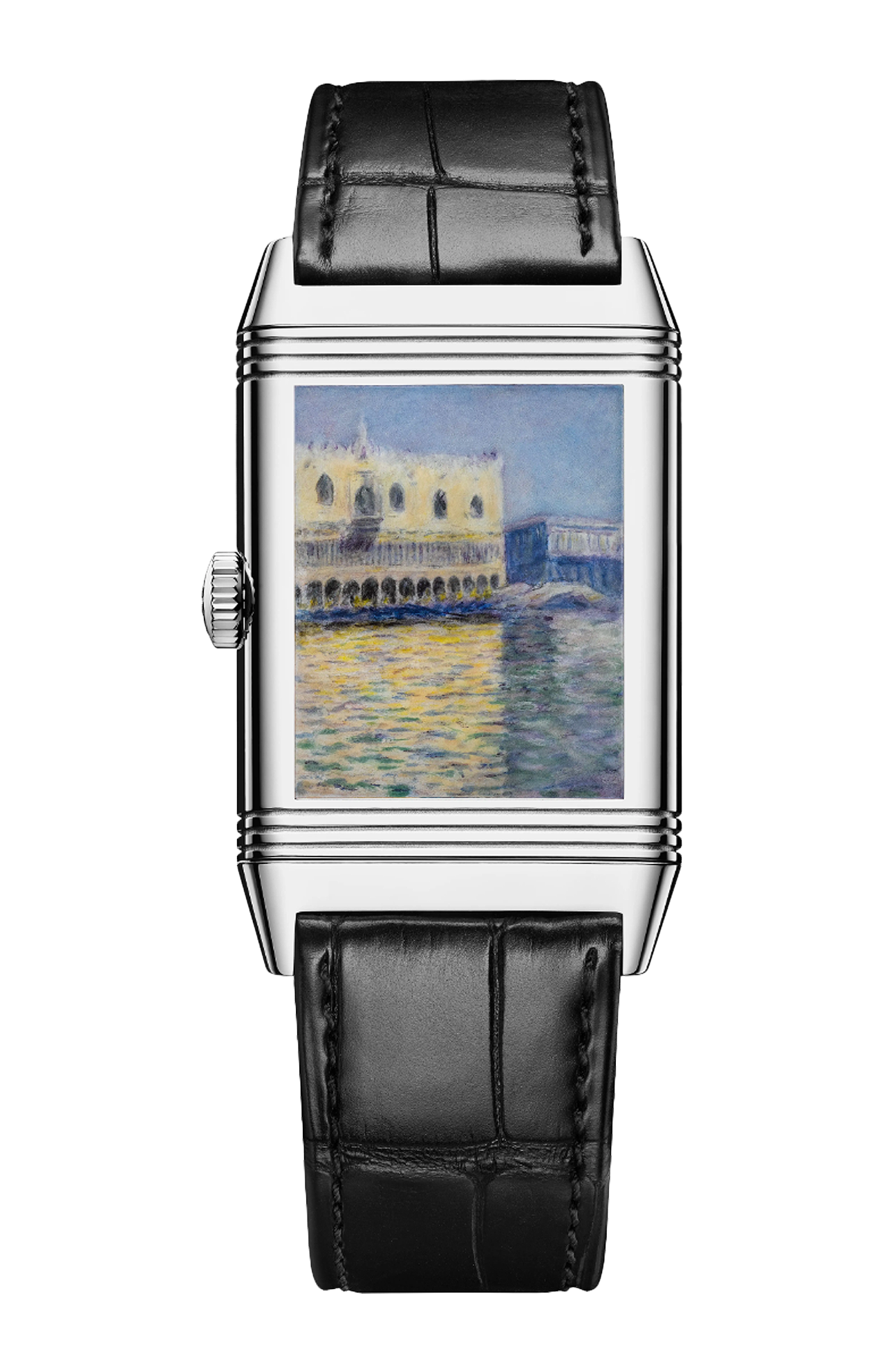 Immersione in acque blu. Nell’orologio Reverso Tribute Enamel che riproduce il “Palazzo Ducale”, uno dei dipinti più noti di Claude Monet, le sfumature di blu dello smalto Grand Feu evocano Venezia all’alba. Il fronte dell’orologio presenta un quadrante guilloché con un elaborato motivo a losanghe. Per ottenere questa luminosità traslucida, 4.905 linee guilloché sono state smaltate in blu Grand Feu. Gli smaltatori del nostro atelier dei Mestieri Rari™ hanno impiegato quasi 70 ore per completare la riproduzione in miniatura dell’opera originale del maestro impressionista sul retro. Il blu e l’oro del cielo e del mare sembrano riflettersi l’un l’altro in una perfetta armonia cromatica. Edizione limitata a 10 esemplari.