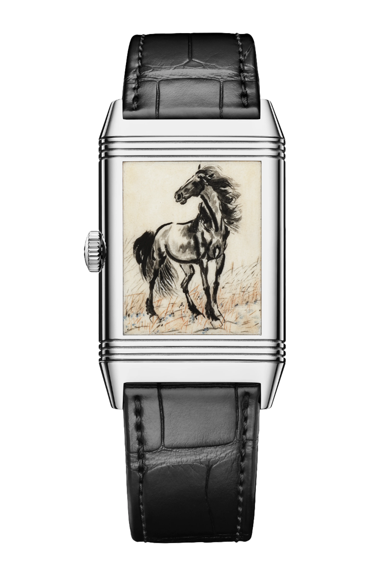 Sin dalla sua creazione nel 1931, questo iconico orologio reversibile si è rivelato una tela artistica estremamente stimolante. In omaggio all’arte della pittura a china e in onore dello spirito dell’anno del cavallo, i maestri artigiani dell’atelier dei mestieri rari™ hanno riprodotto il celebre “cavallo in piedi” di Xu Beihong sul retro del reverso tribute enamel. Realizzato con la tecnica della miniatura smaltata, questo capolavoro impiega raffinate sfumature di inchiostro nero per catturare l’essenza del nobile destriero, simbolo di potenza, grazia ed energia indomabile. Il quadrante, guilloché con un motivo a spina di pesce e rivestito di smalto grand feu arancione traslucido, offre un contrasto sorprendente con l’opera sul retro. La riproduzione meticolosa di questa iconica opera d’arte e la creazione del quadrante richiedono oltre 80 ore di lavorazione manuale, con molteplici cotture in forno a 800°C per ottenere le delicate variazioni tonali dello smalto e una profondità cromatica straordinaria. Edizione limitata a 10 esemplari.