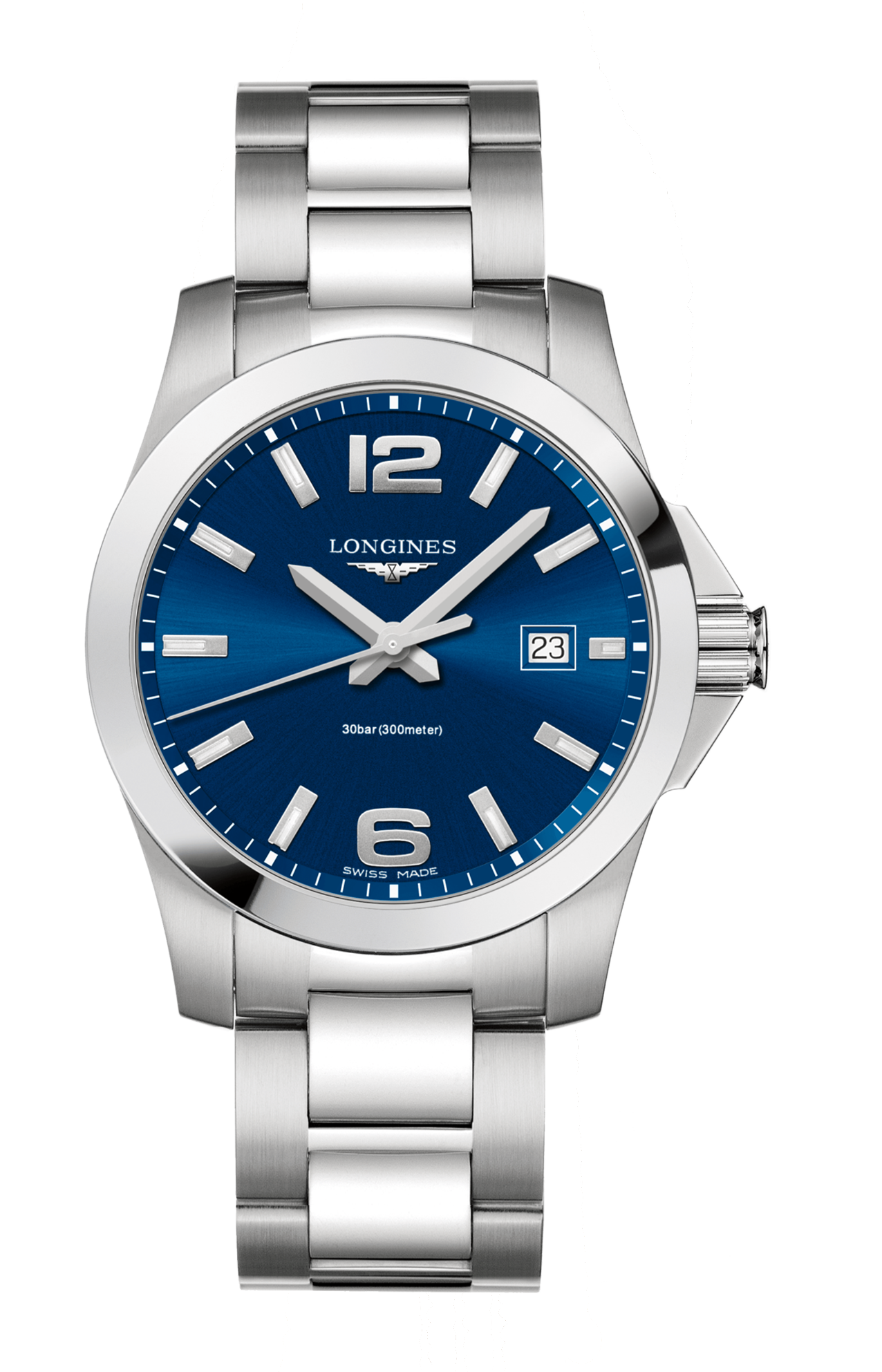 Date. Corona a vite, impermeabile fino a 30 bar, vetro zaffiro antigraffio con trattamento antiriflesso sul lato interno. Quadrante blu a raggi di sole. Bracciale in acciaio inossidabile, con chiusura DÉPLOYANTE a tripla sicurezza e meccanismo di apertura a pressione.