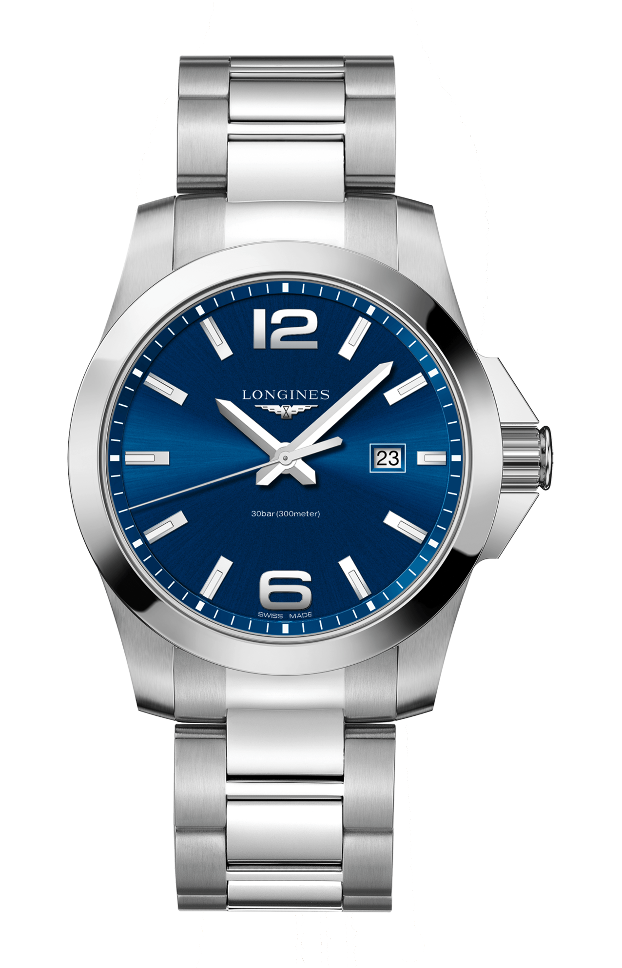 Date. Corona a vite, impermeabile fino a 30 bar, vetro zaffiro antigraffio con trattamento antiriflesso sul lato interno. Quadrante blu a raggi di sole. Bracciale in acciaio inossidabile, con chiusura DÉPLOYANTE a tripla sicurezza e meccanismo di apertura a pressione.