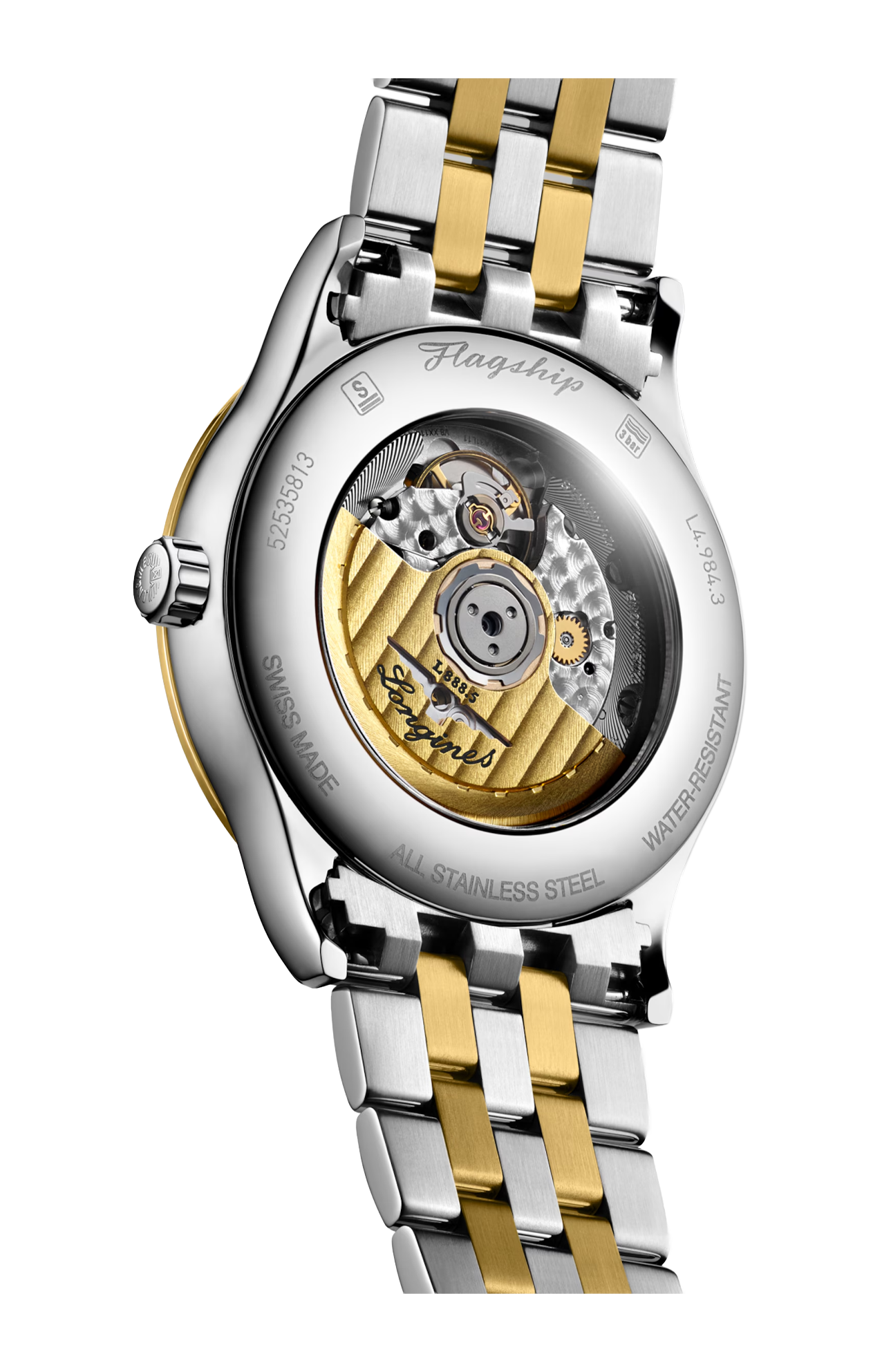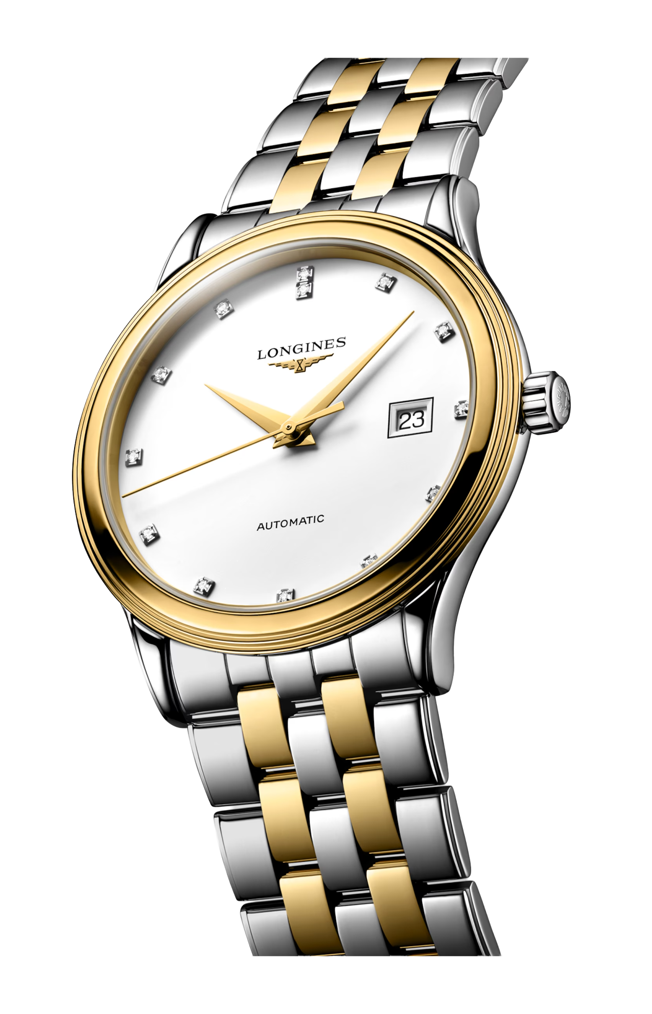 OROLOGIO AUTOMATICO, Ø 40.00 MM, ACCIAIO INOSSIDABILE E RIVESTIMENTO PVD GIALLO, L4.984.3.17.7 DATE, MOVIMENTO MECCANICO A CARICA AUTOMATICA CON FREQUENZA DI 25'200 ALTERNANZE ORARIE E RISERVA DI CARICA DI CIRCA 72 ORE, BILANCIERE-SPIRALE IN SILICIO MONOCRISTALLINO. IMPERMEABILE FINO A 3 BAR, VETRO ZAFFIRO ANTIGRAFFIO BOMBATO CON TRATTAMENTO ANTIRIFLESSO MULTISTRATO SUL LATO INTERNO. QUADRANTE BIANCO MAT. BRACCIALE IN ACCIAIO INOSSIDABILE E RIVESTIMENTO PVD GIALLO, CON CHIUSURA DÉPLOYANTE A TRIPLA SICUREZZA E MECCANISMO DI APERTURA A PRESSIONE.