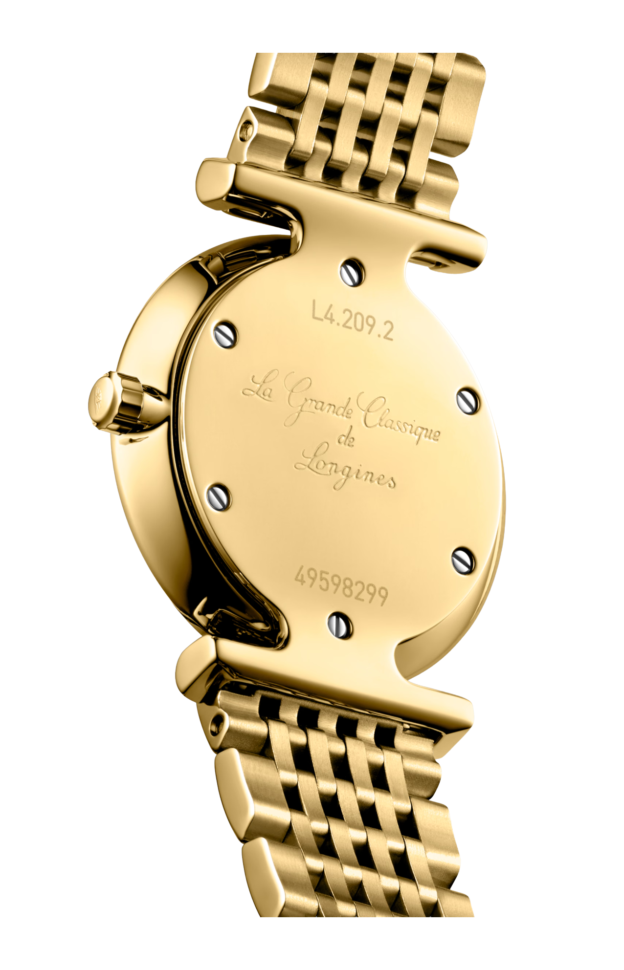 Orologio al quarzo, Ø 24.00 mm, rivestimento PVD giallo, L4.209.2.37.8 Impermeabile fino a 3 bar, vetro zaffiro antigraffio. Quadrante dorato. Bracciale in rivestimento PVD giallo, con chiusura déployante a tripla sicurezza e meccanismo di apertura a pressione.