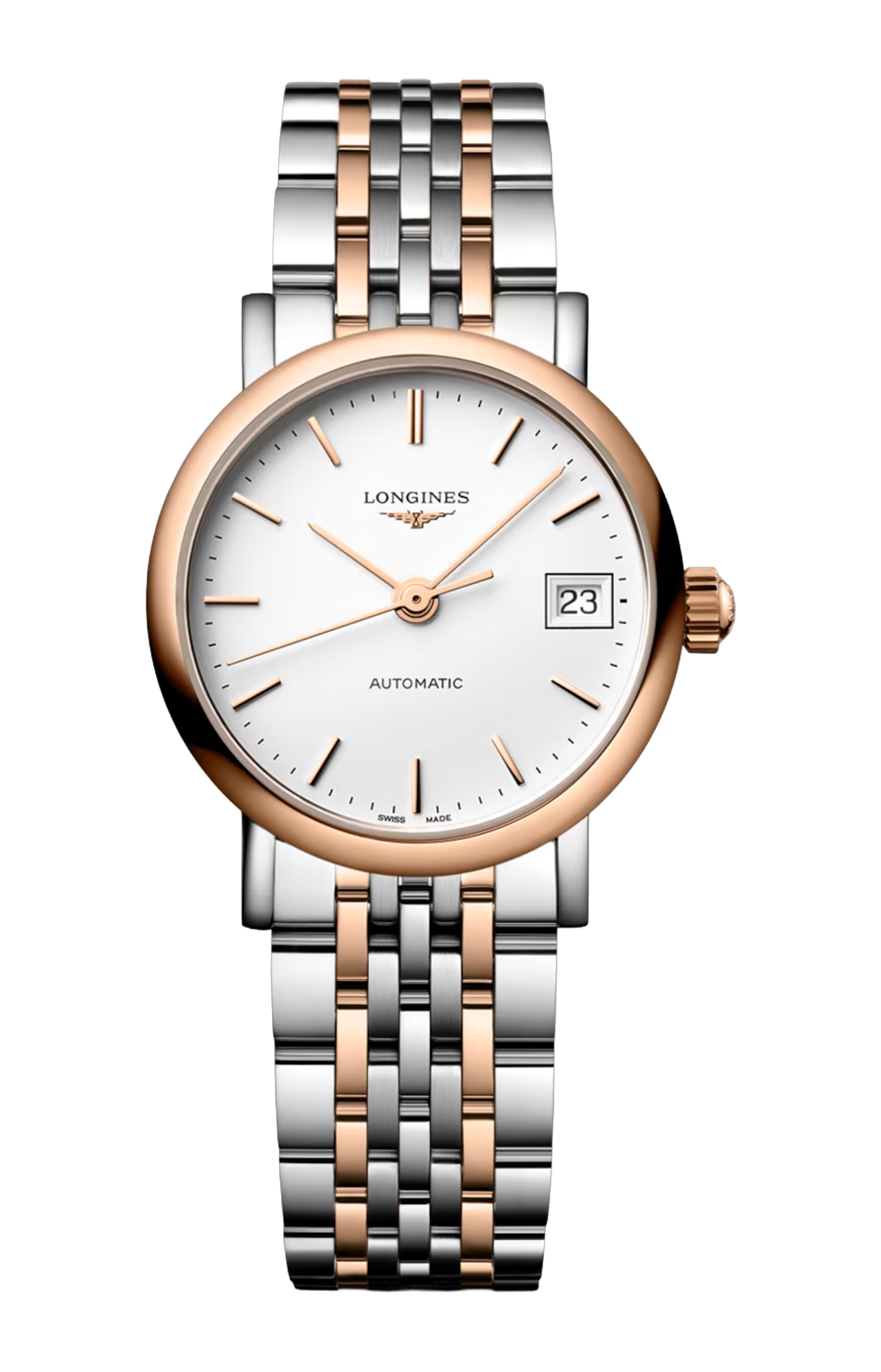 OROLOGIO AUTOMATICO, Ø 25.50 MM, ACCIAIO INOSSIDABILE E LUNETTA GIREVOLE BIDIREZIONALE CON INSERTO SPAZZOLATO CIRCOLARE SOVRASTATO DA UNA COIFFE IN ORO ROSA 18 CARATI 5N, L4.309.5.19.7 DATE, MOVIMENTO MECCANICO A CARICA AUTOMATICA CON FREQUENZA DI 28'800 ALTERNANZE ORARIE E RISERVA DI CARICA DI CIRCA 45 ORE, BILANCIERE-SPIRALE IN SILICIO MONOCRISTALLINO. IMPERMEABILE FINO A 3 BAR, VETRO ZAFFIRO ANTIGRAFFIO. QUADRANTE BIANCO MAT. BRACCIALE IN ACCIAIO INOSSIDABILE E LUNETTA GIREVOLE BIDIREZIONALE CON INSERTO SPAZZOLATO CIRCOLARE SOVRASTATO DA UNA COIFFE IN ORO ROSA 18 CARATI 5N, CON CHIUSURA DÉPLOYANTE A TRIPLA SICUREZZA E MECCANISMO DI APERTURA A PRESSIONE.