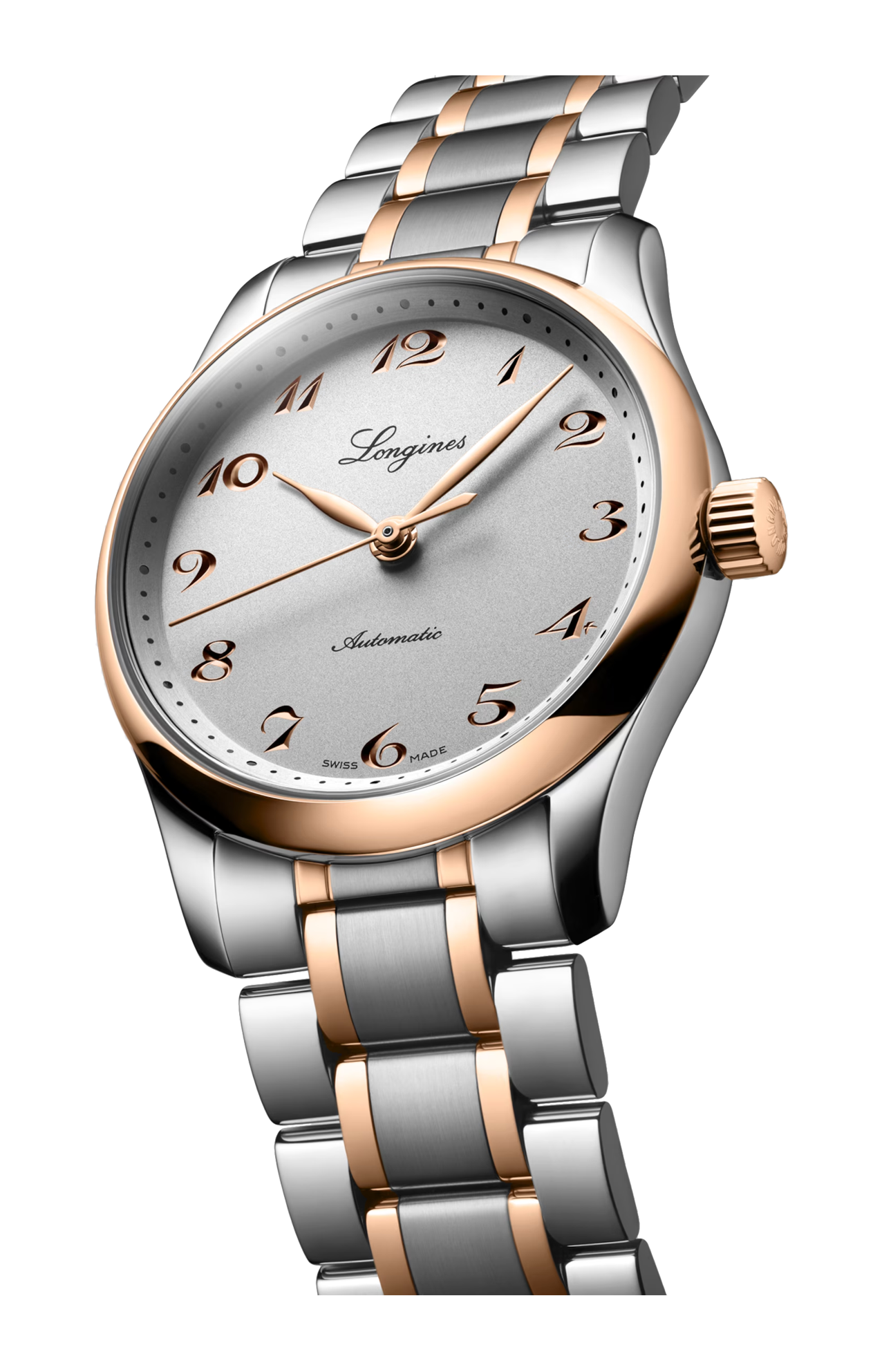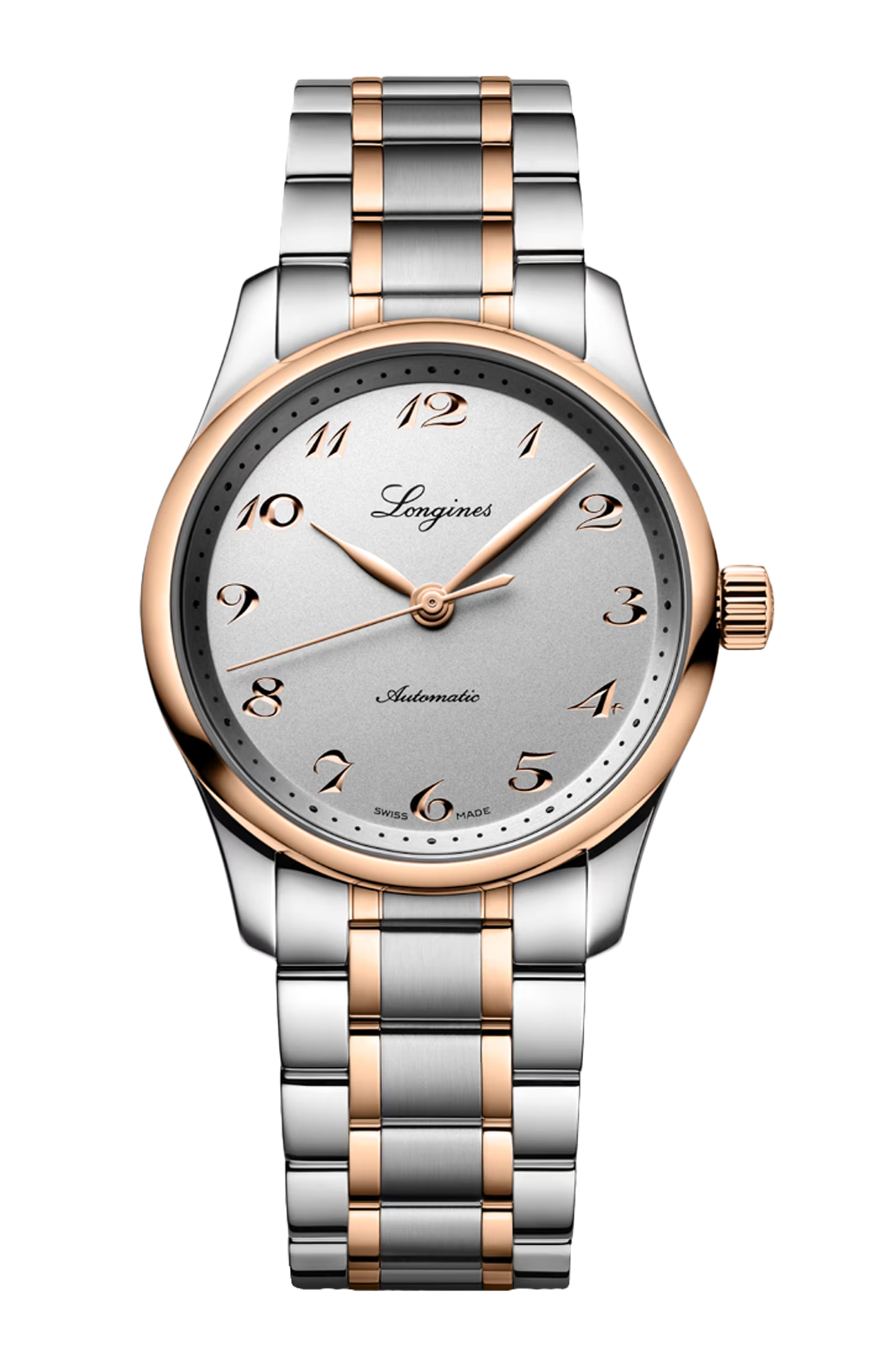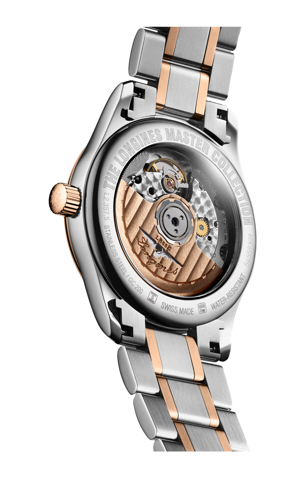 Movimento meccanico a carica automatica con frequenza di 25'200 alternanze orarie e riserva di carica di circa 72 ore, bilanciere-spirale in silicio monocristallino. Impermeabile fino a 3 bar, vetro zaffiro antigraffio con trattamento antiriflesso multistrato su entrambi i lati. Quadrante argento. Bracciale in acciaio inossidabile e lunetta girevole bidirezionale con inserto spazzolato circolare sovrastato da una coiffe in oro rosa 18 carati 5N, con chiusura déployante a tripla sicurezza e meccanismo di apertura a pressione.