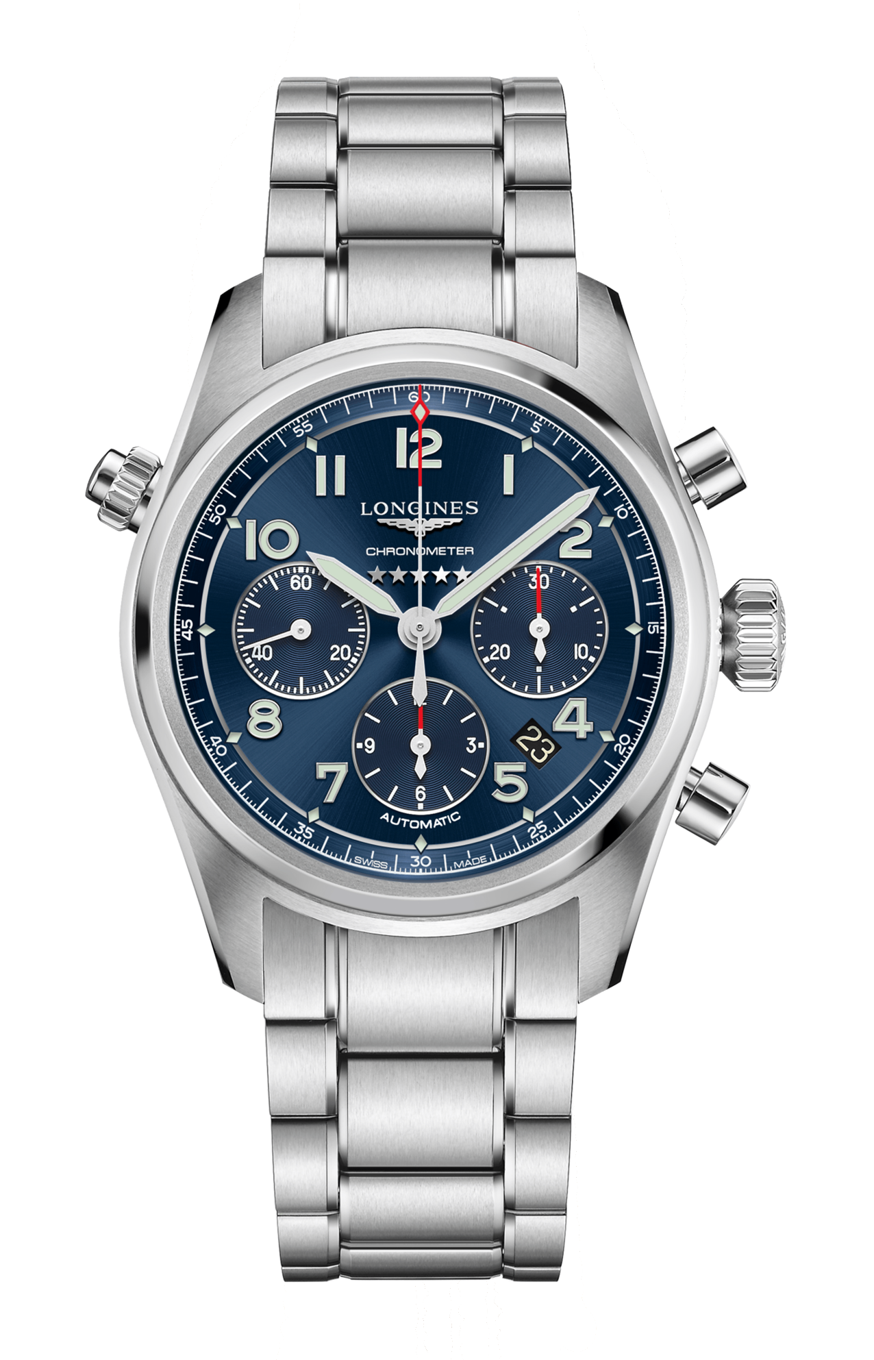 Orologio automatico, Ø 42.00 mm, acciaio inossidabile, L3.820.4.93.6 cronografo date, movimento meccanico a carica automatica con frequenza di 28'800 alternanze orarie e riserva di carica di circa 66 ore, bilanciere-spirale in silicio monocristallino. Corona a vite, impermeabile fino a 10 bar, vetro zaffiro antigraffio con trattamento antiriflesso multistrato su entrambi i lati. Quadrante blu a raggi di sole, Swiss Super-Luminova®. Bracciale in acciaio inossidabile, con chiusura déployante a tripla sicurezza e meccanismo di apertura a pressione.