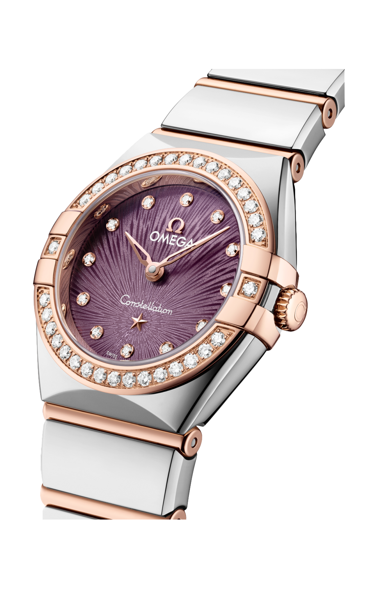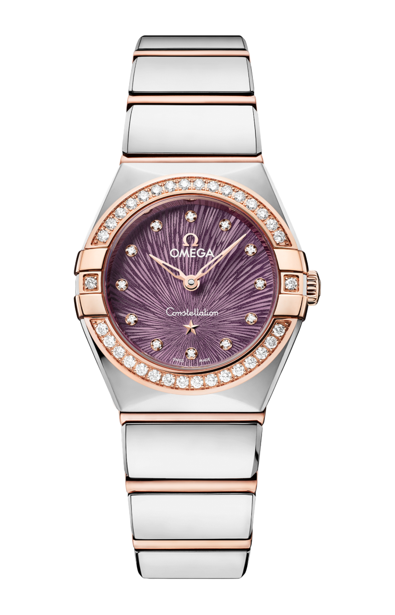 Questo modello da 25 mm, realizzato in acciaio inossidabile e oro Sedna™ 18K, presenta una scintillante lunetta tempestata di diamanti. Il quadrante con trattamento PVD viola, ornato dall’iconico motivo Supernova inciso elettrochimicamente, presenta lancette e stella in oro Sedna™ 18K, e indici delle ore con diamanti incastonati in supporti in oro Sedna™ 18K.