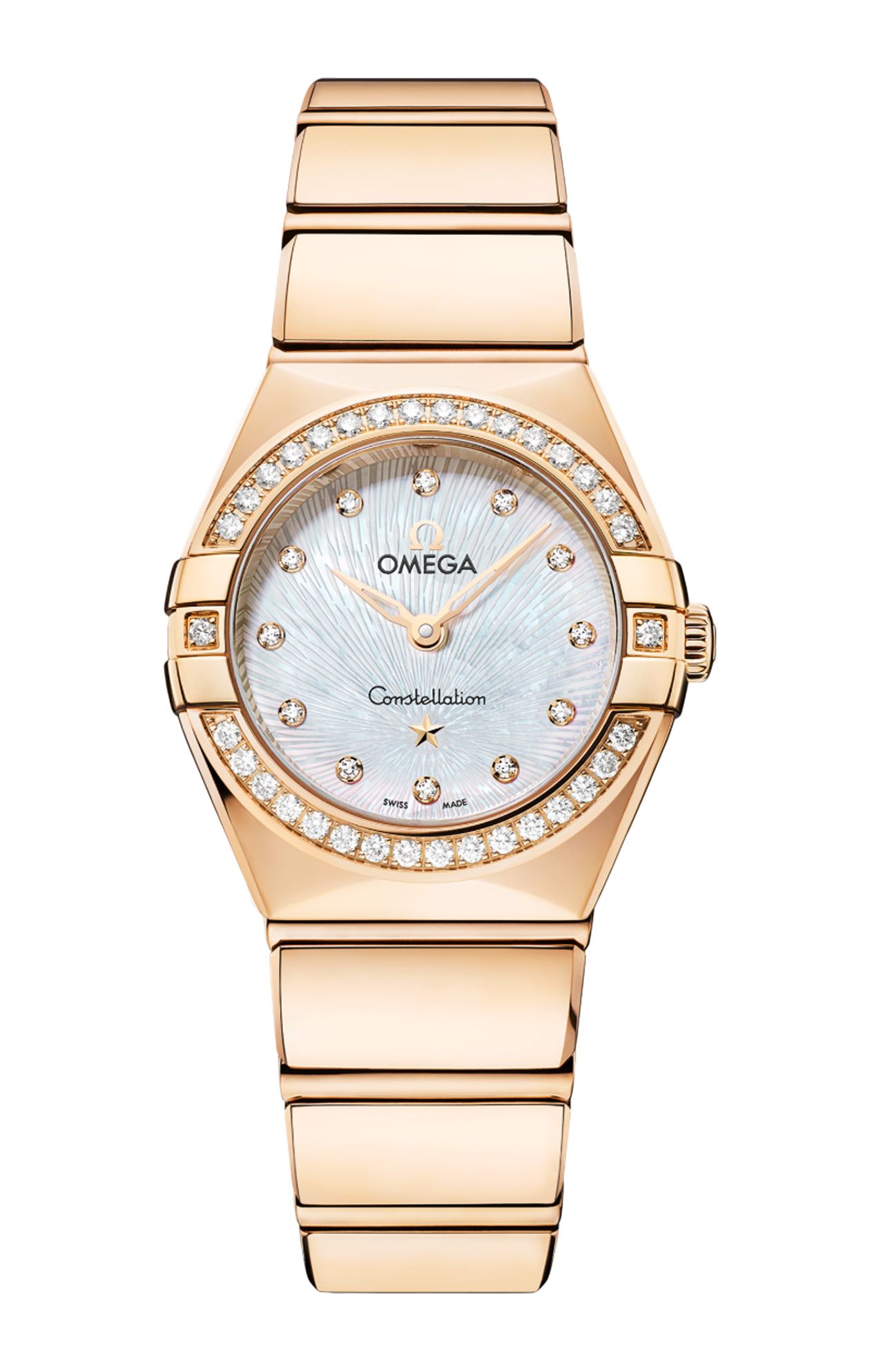 Questo modello da 25 mm, realizzato in oro Moonshine™ 18K, presenta una scintillante lunetta tempestata di diamanti. Il quadrante in madreperla iridescente colorata, ornato dall’iconico motivo supernova inciso al laser, presenta lancette e stella in oro Moonshine™ 18K, e indici delle ore con diamanti incastonati in supporti in oro Moonshine™ 18K.