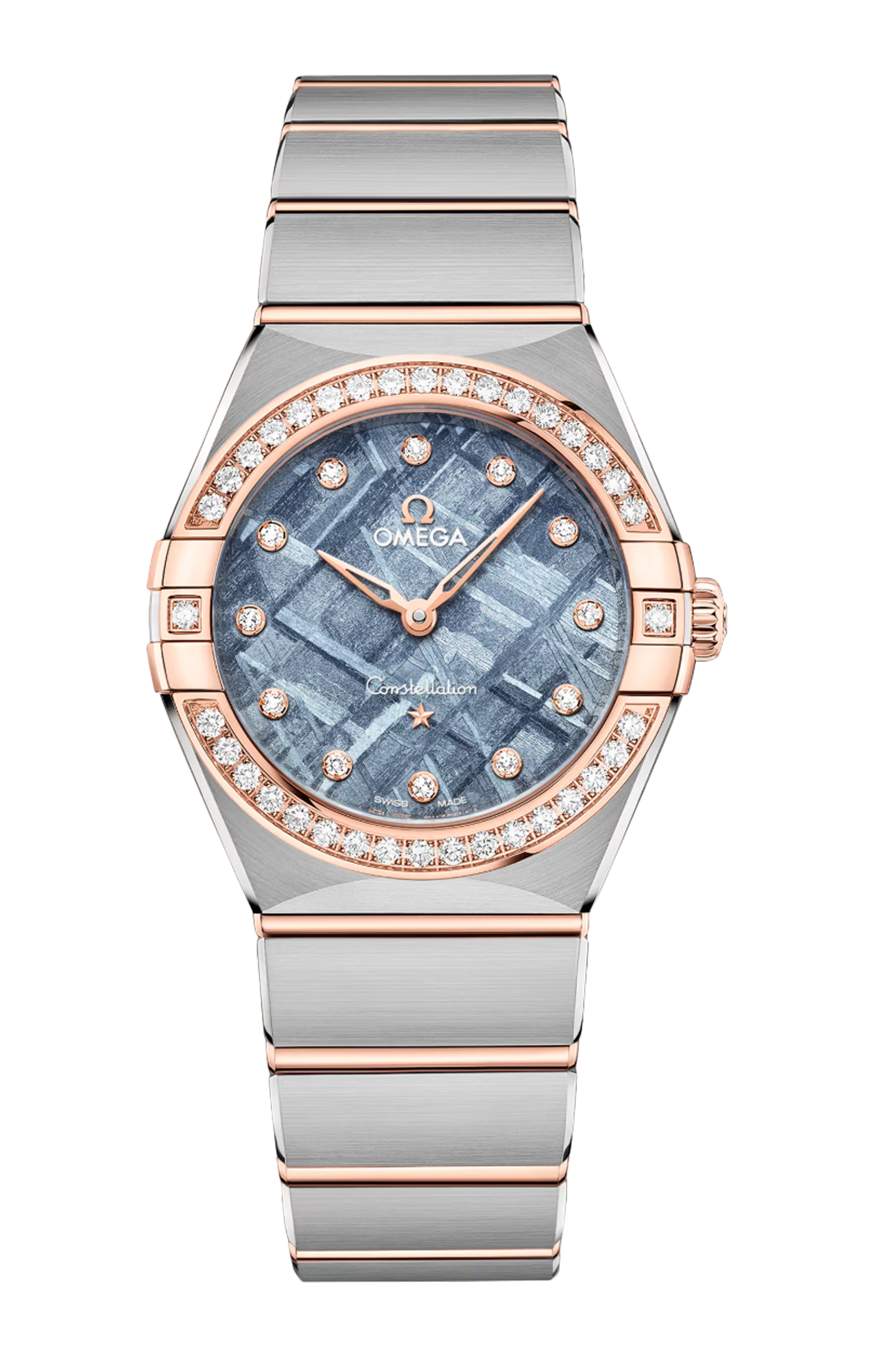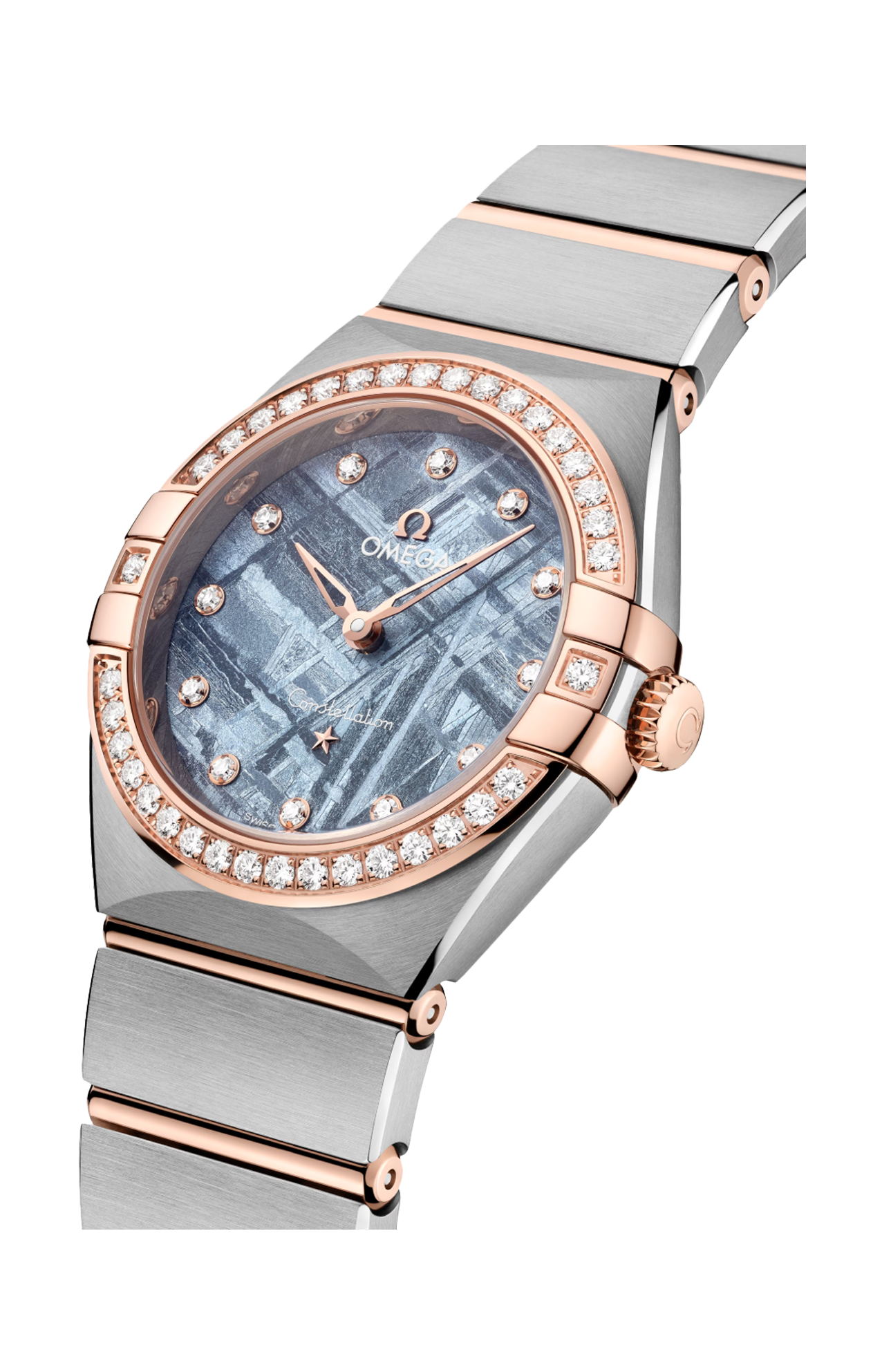 L’orologio presenta una cassa da 28 mm corredata da un bracciale “Mono Rang” in acciaio inossidabile e oro Sedna™ 18K e integra molte delle caratteristiche distintive della linea Constellation, come le griffe lucide, le sfaccettature a mezzaluna e la lunetta tempestata di diamanti.