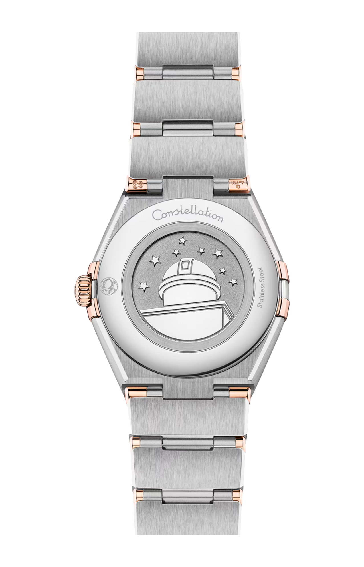 Alloggiato dietro al fondello caratterizzato da un medaglione Constellation con impressa l’effigie dell’osservatorio, anima l’orologio il calibro Omega 4061.