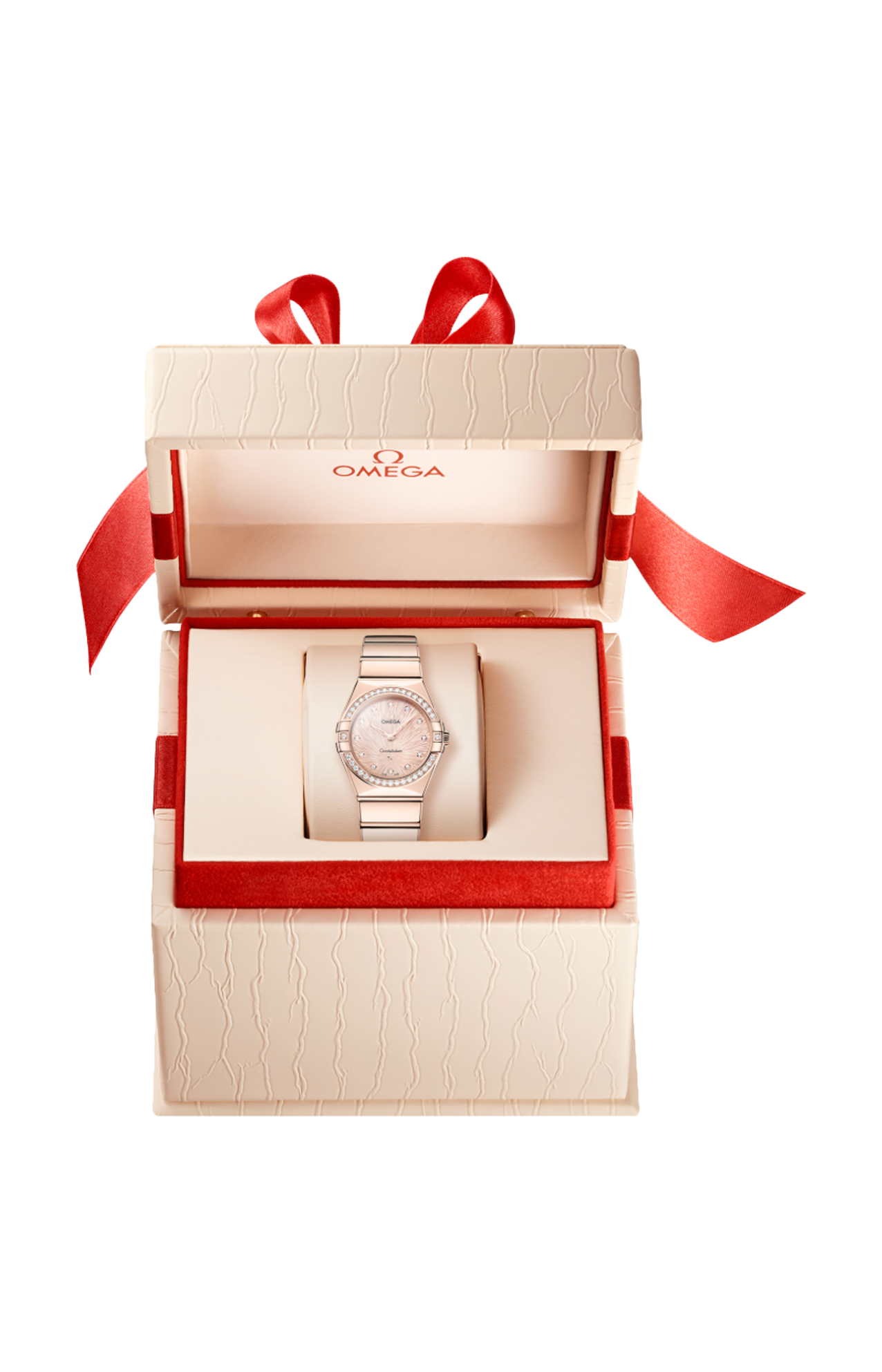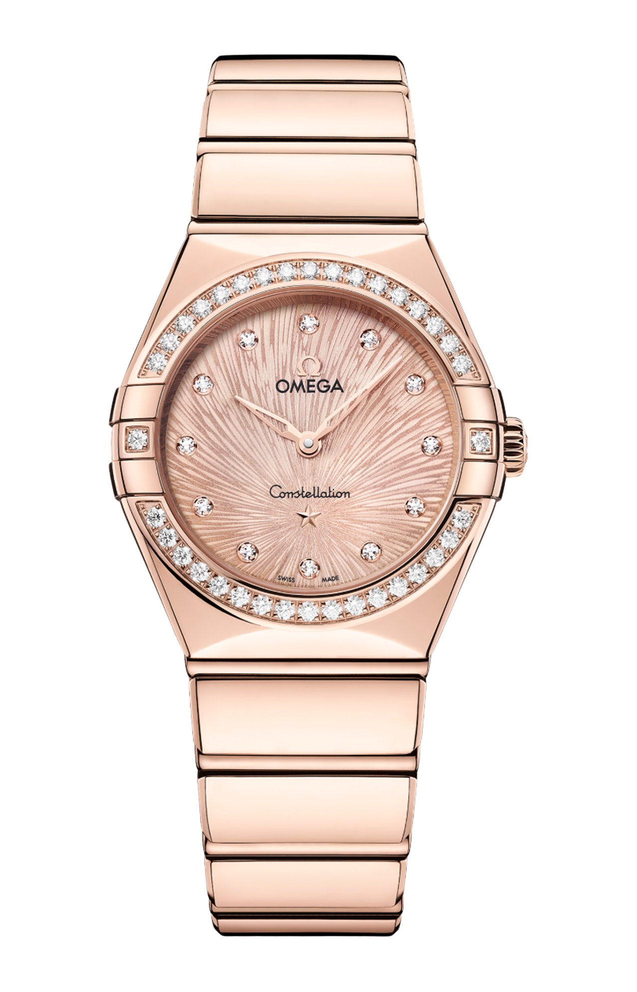 L’orologio presenta una cassa da 28 mm corredata da un bracciale “mono rang” in acciaio inossidabile e integra molte delle caratteristiche distintive della linea Constellation, come le griffe lucide, le sfaccettature a mezzaluna e la lunetta tempestata di diamanti.