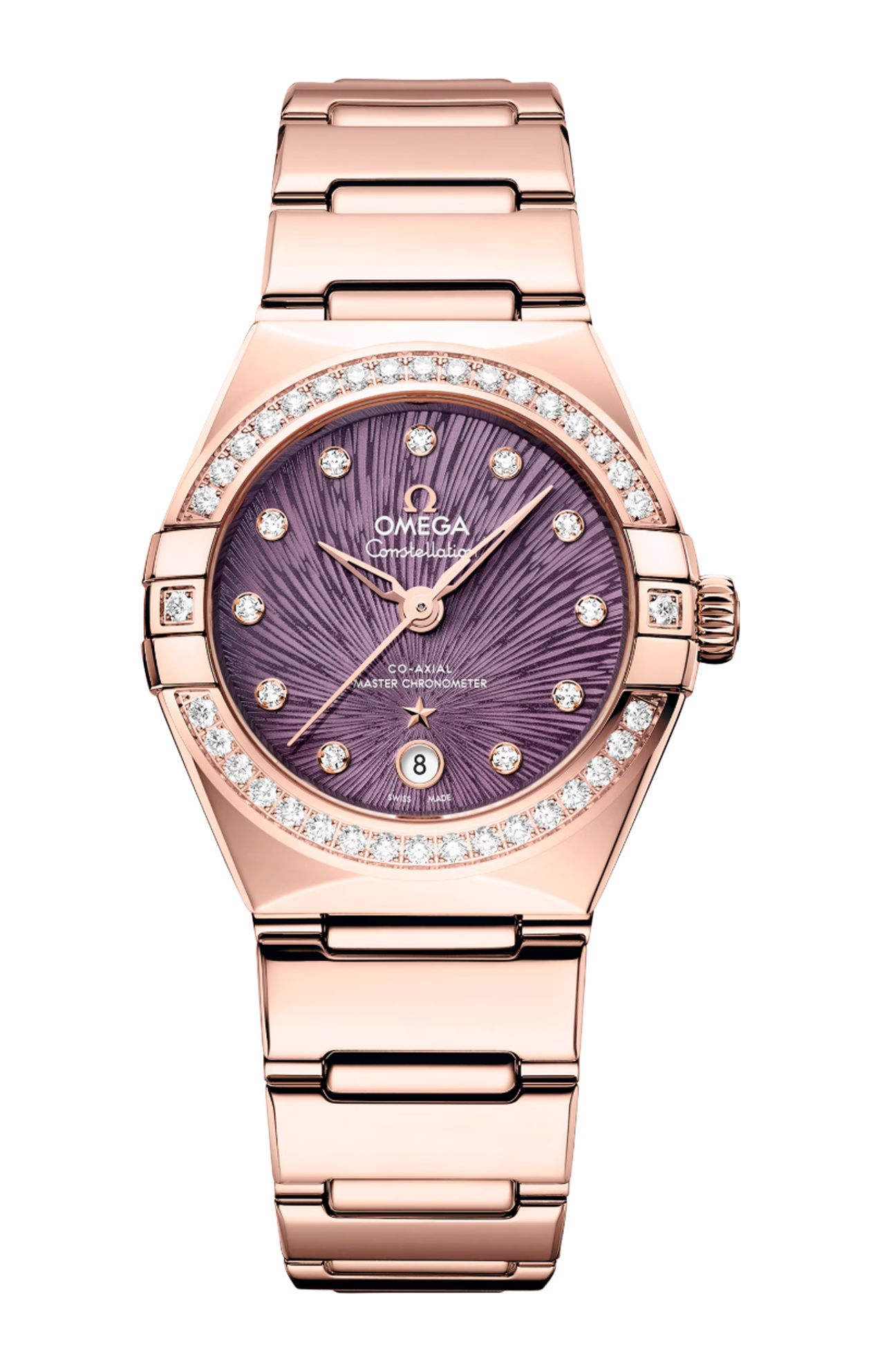 Questo modello da 29 mm, realizzato in oro Sedna™ 18K, presenta una scintillante lunetta tempestata di diamanti. Il quadrante con trattamento PVD viola, ornato dall’iconico motivo Supernova inciso elettrochimicamente, presenta un datario a finestrella a ore 6, lancette e stella in oro Sedna™ 18K, e indici delle ore con diamanti incastonati in supporti in oro Sedna™ 18K.