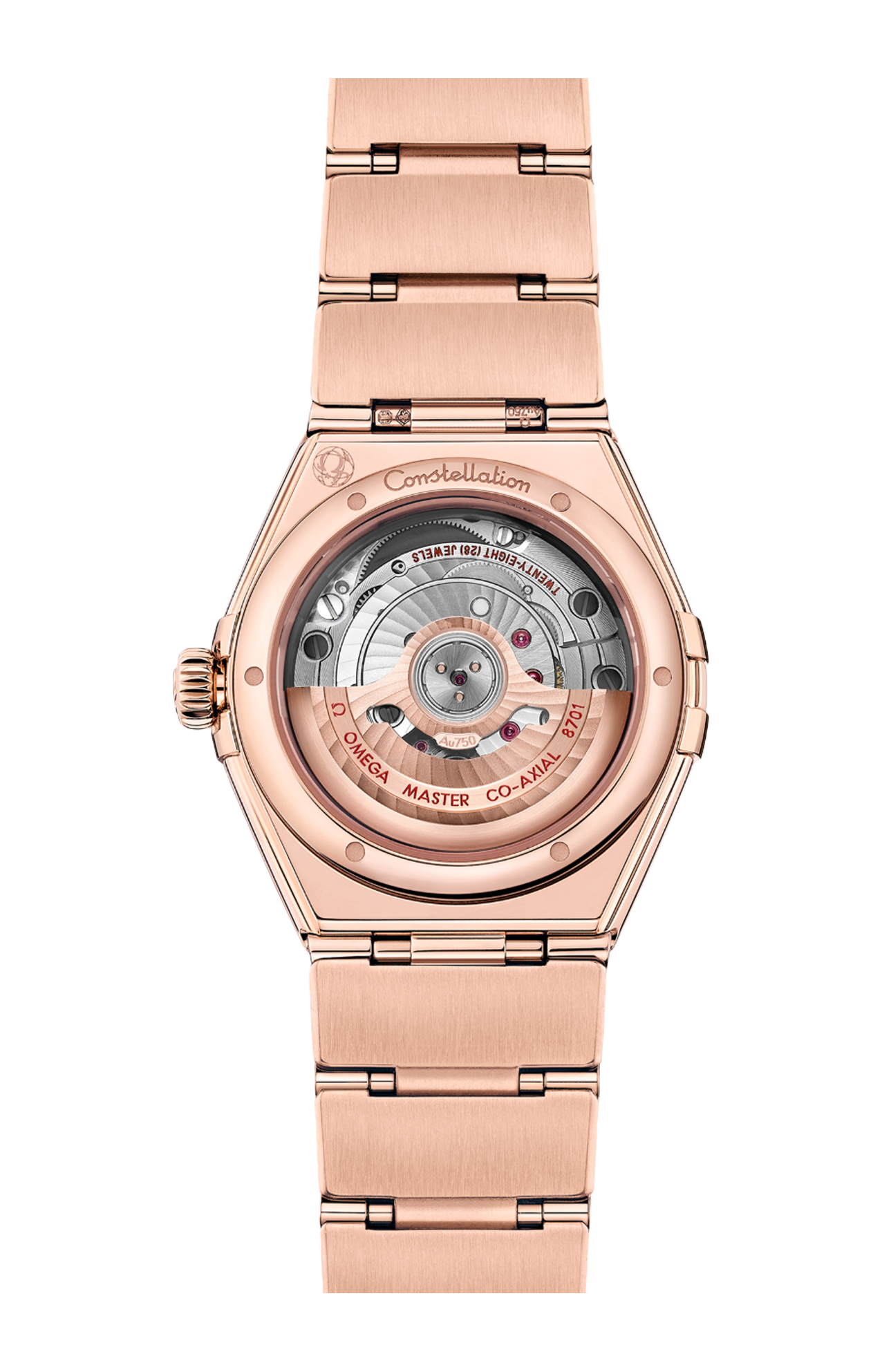 L'orologio, corredato dal caratteristico bracciale "Mono Rang" con comodo sistema di regolazione, è animato dal calibro Omega Co-Axial Master Chronometer 8701, visibile attraverso il fondello in vetro zaffiro.