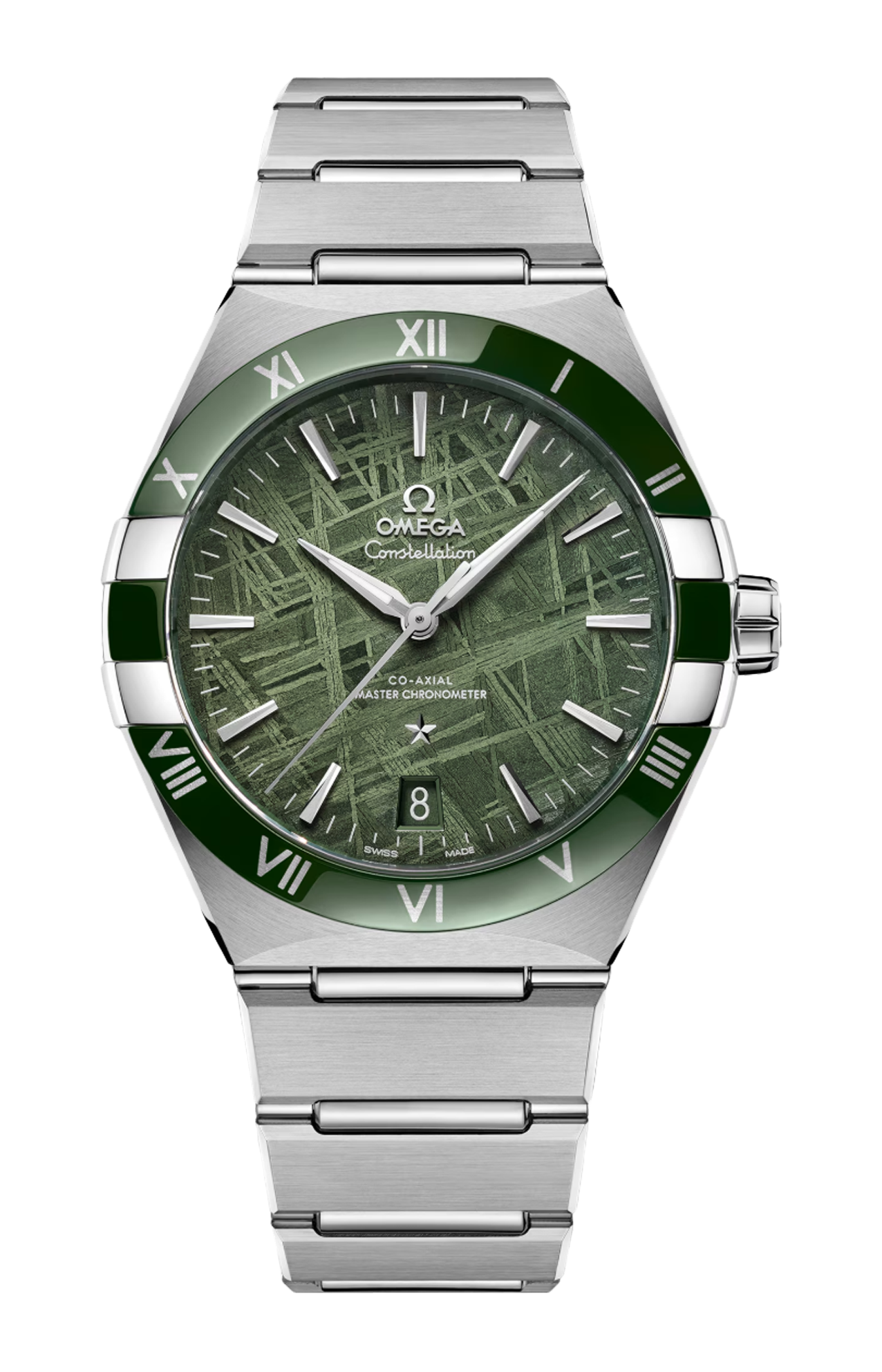 L’orologio presenta una cassa da 41 mm corredata da un bracciale “Mono Rang” in acciaio inossidabile e integra molte delle caratteristiche distintive della linea Constellation, come le griffe lucide, le sfaccettature a mezzaluna e i numeri romani in Liquidmetal™ sulla lunetta in ceramica verde.