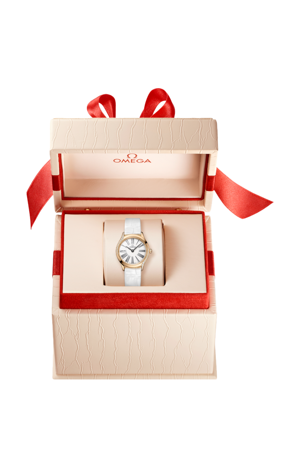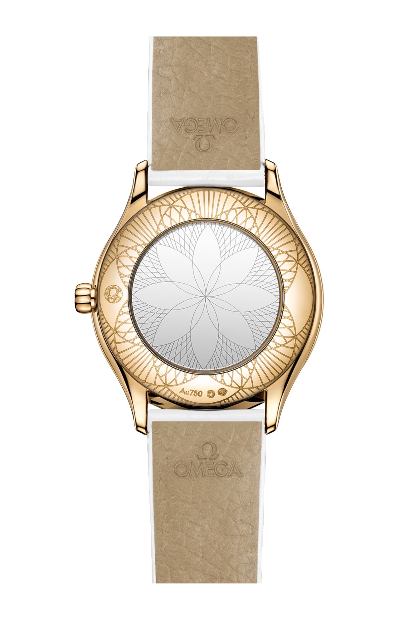 Corredato da un cinturino in pelle di alligatore laccata bianca con fibbia Trésor, l’orologio è animato dal calibro Omega 4061, alloggiato nello speciale fondello a specchio con motivo metallizzato “Her Time”.