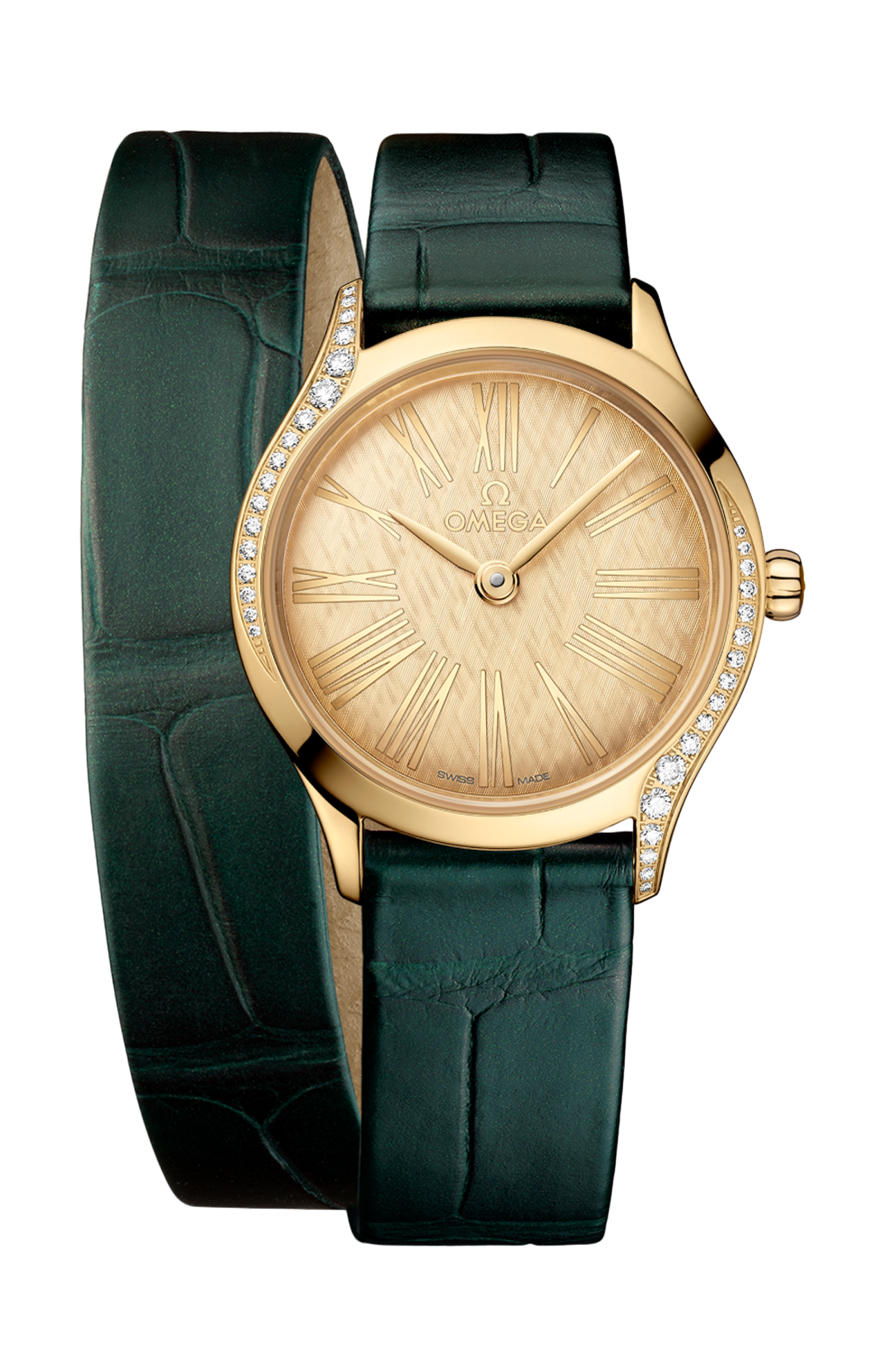 Corredato da un cinturino a doppio giro in pelle di alligatore verde scintillante con fibbia Trésor, l’orologio è animato dal calibro Omega 4061, alloggiato nello speciale fondello a specchio con motivo metallizzato “Her Time”.