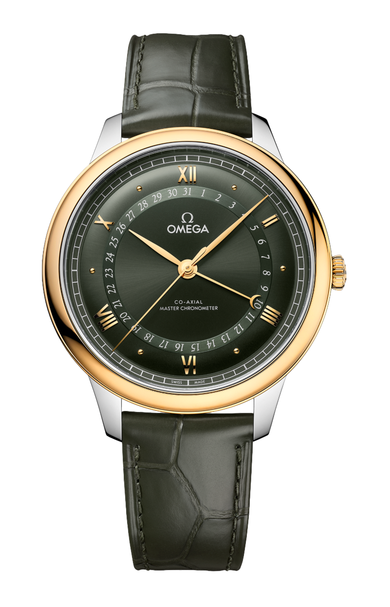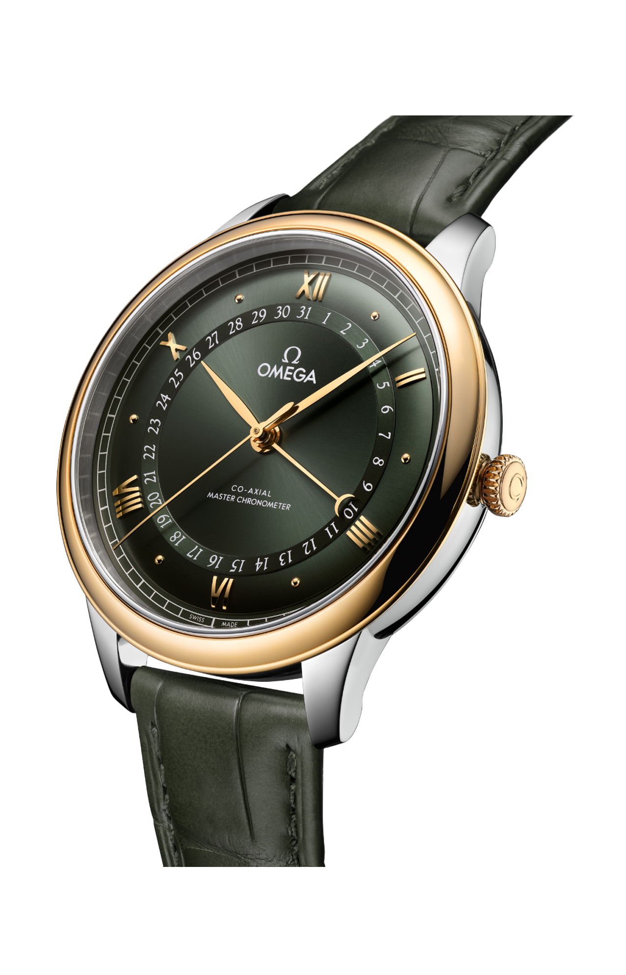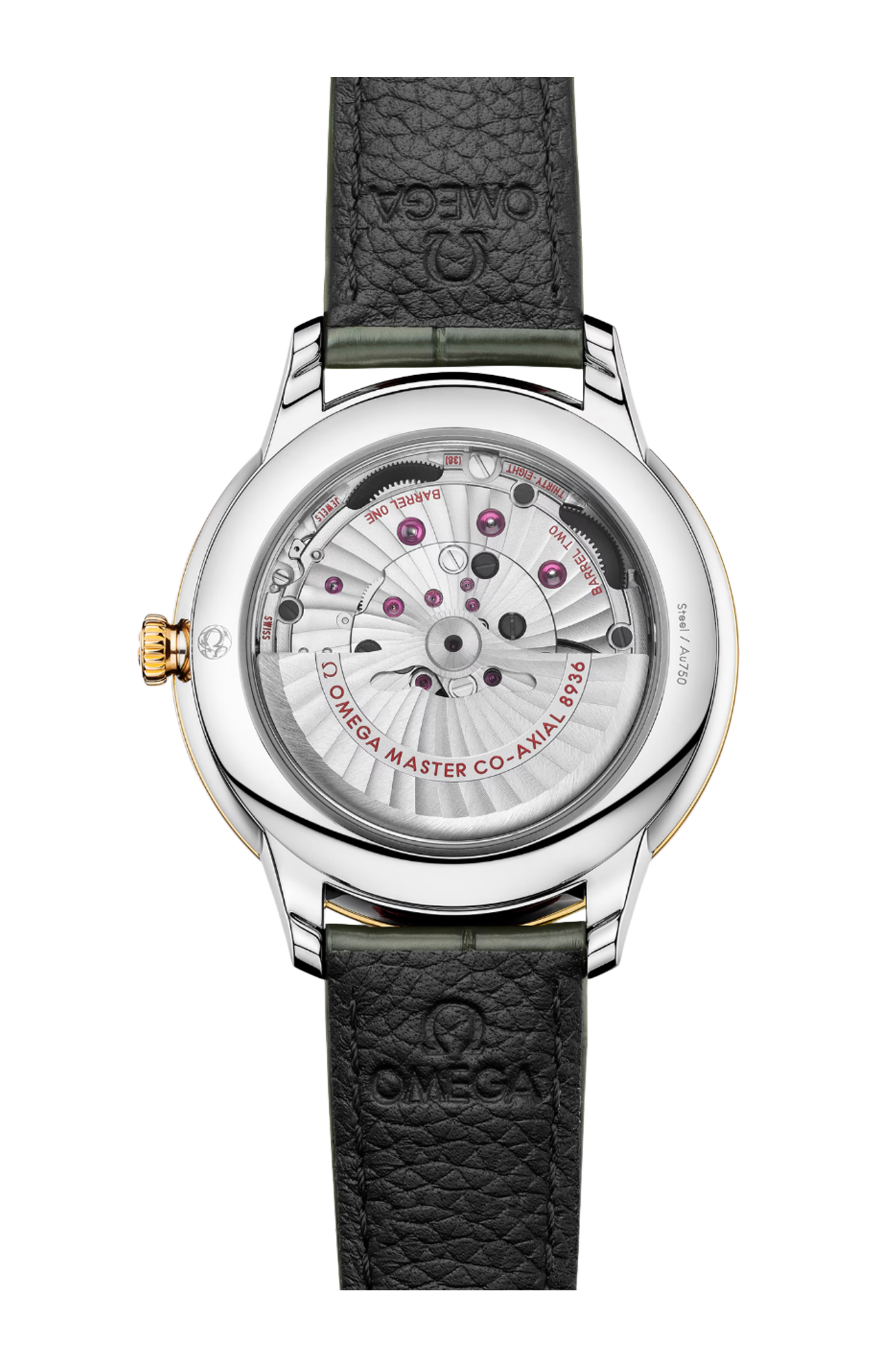 Dotato di cinturino in pelle verde, questo de Ville Prestige è animato dal calibro Co-Axial Master Chronometer 8936, visibile attraverso il fondello in vetro zaffiro.