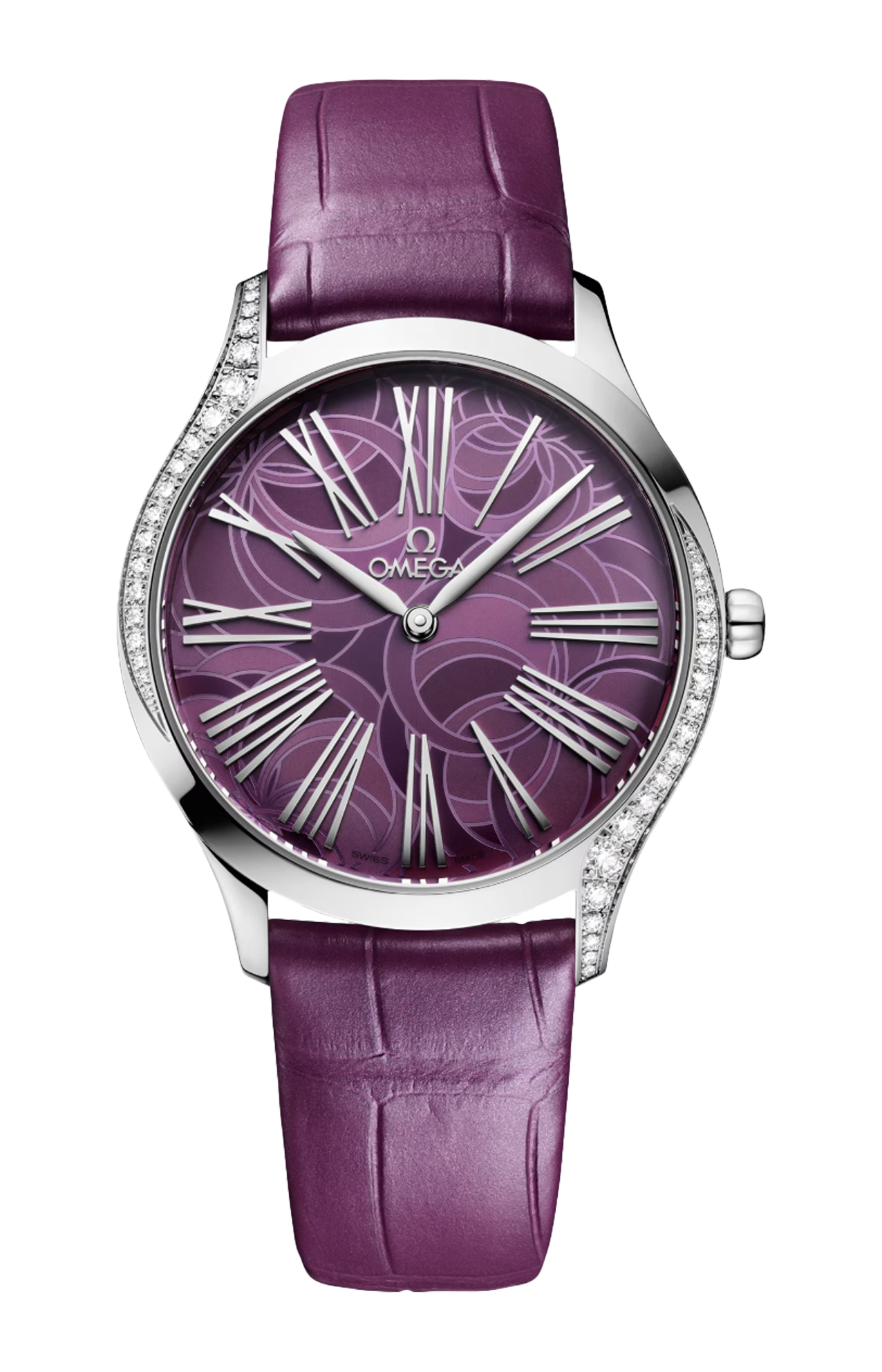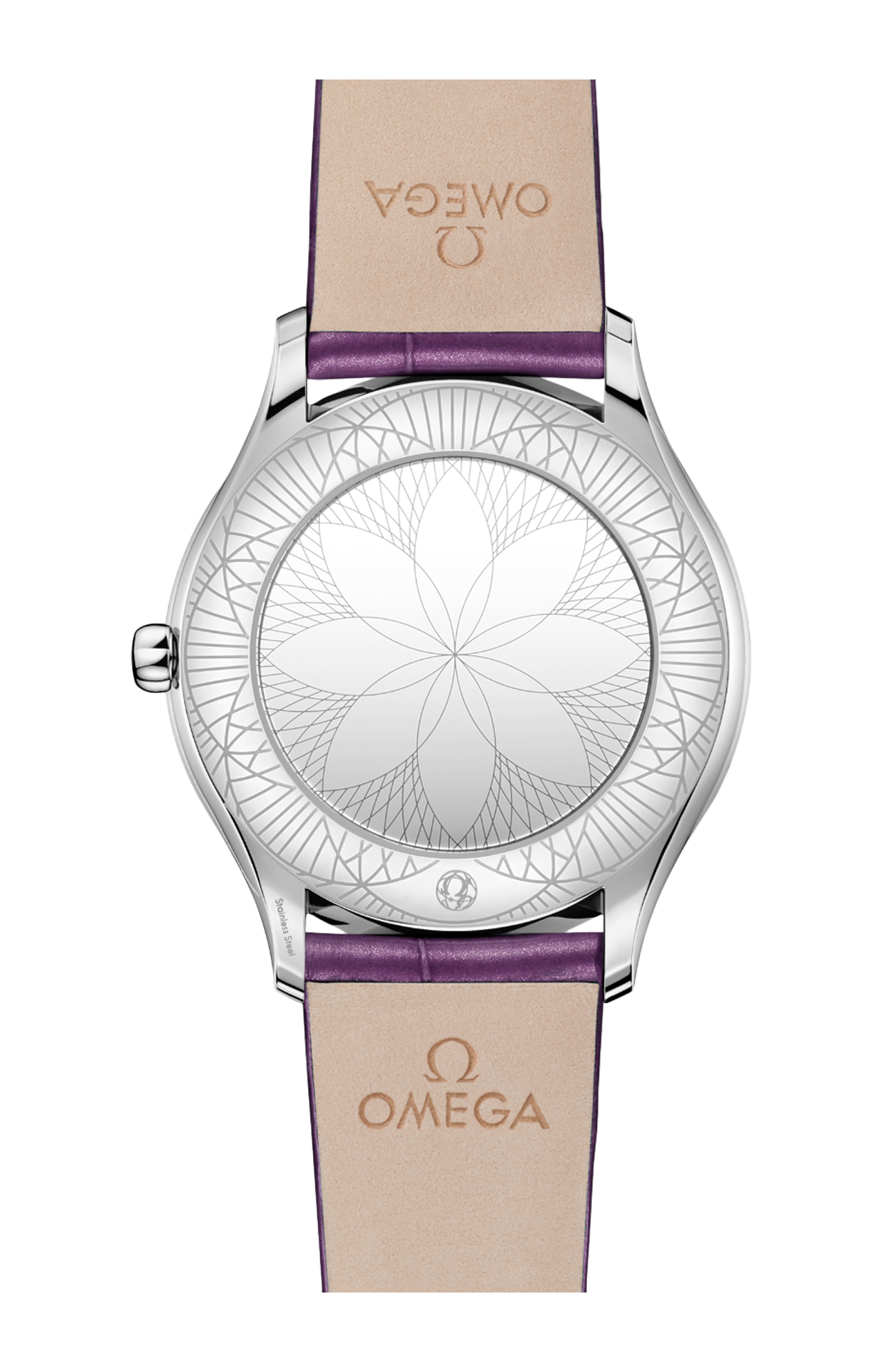 La cassa da 36 mm in acciaio inossidabile lucido vanta 38 diamanti taglio brillante (0,49 carati) che si snodano magnificamente creando una curva su ogni lato. Visibile sotto il vetro zaffiro bombato, il quadrante sabbiato in PVD viola, ulteriormente sublimato da un motivo raffigurante delle peonie ottenuto mediante una decorazione al laser. La corona è incastonata con un diamante taglio brillante, mentre le lancette, gli indici e il logo OMEGA sono rodiati.