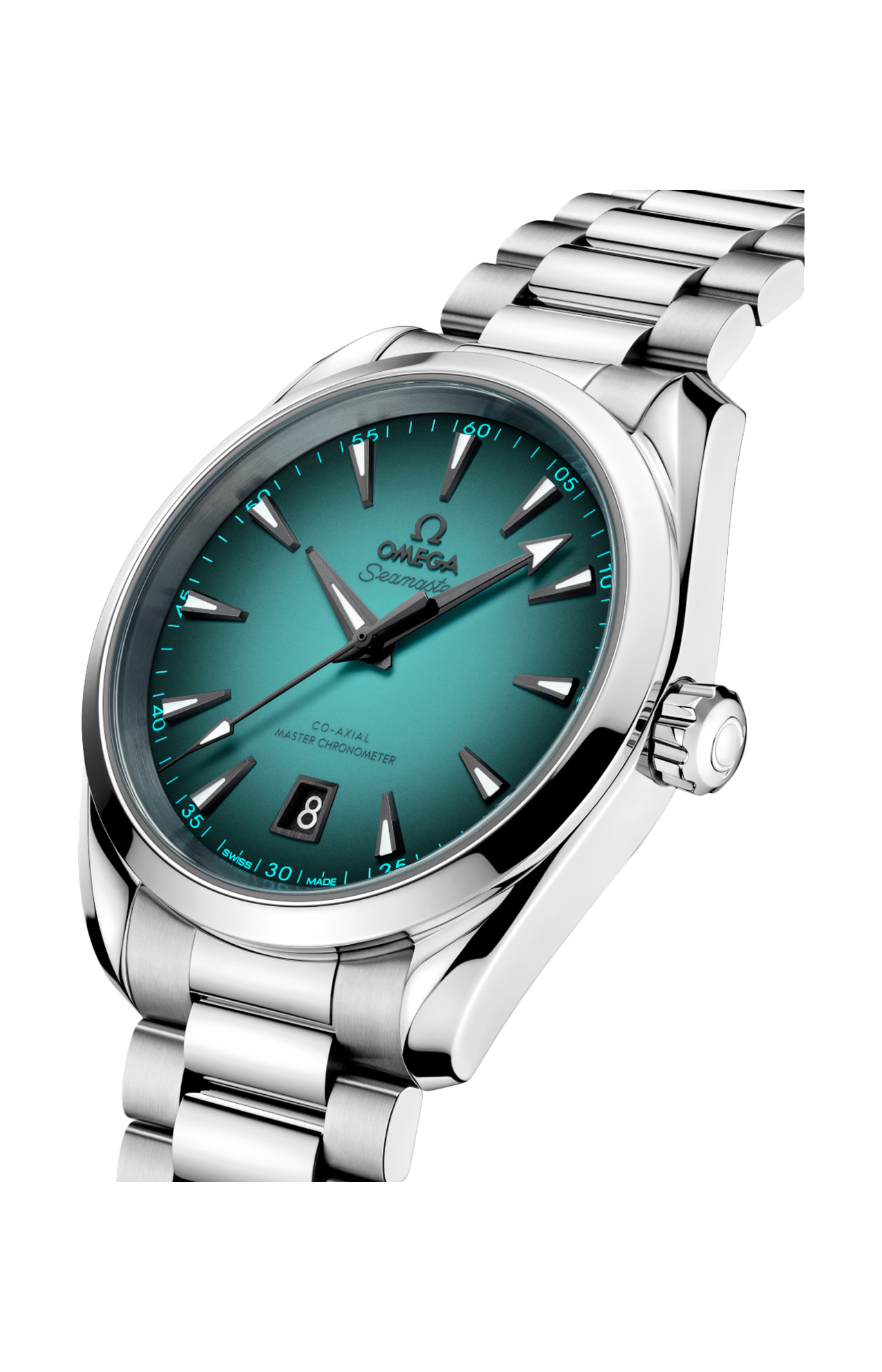 Il quadrante laccato turchese è accentuato da un effetto sfumato nero e presenta lancette sfaccettate e indici delle ore trattati in PVD grigio con Super-Luminova bianca. Anche il logo Omega e il datario a finestrella presentano un trattamento in PVD grigio per abbinarsi alle diciture applicate in grigio e turchese.