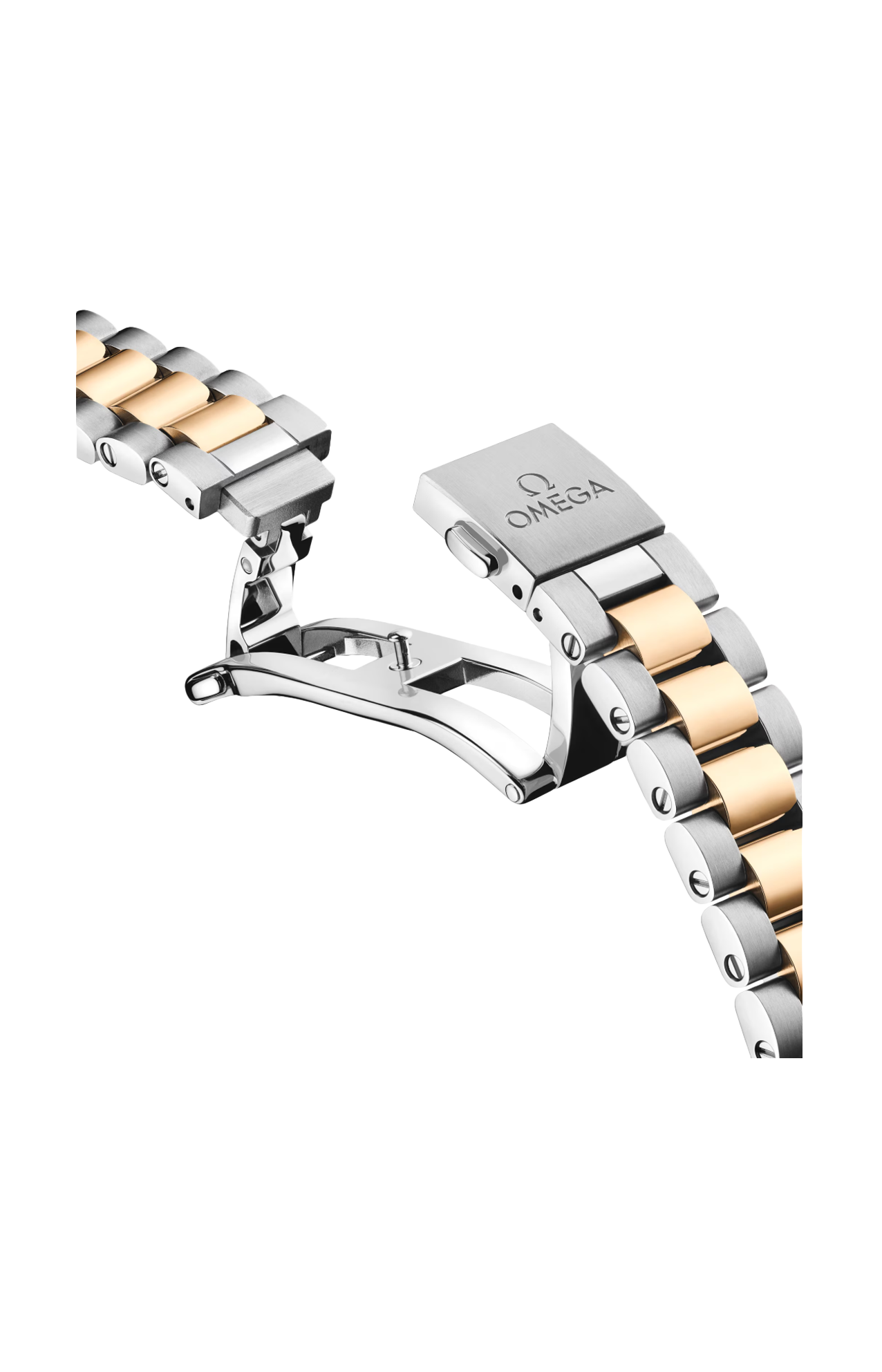 L’orologio è corredato da un bracciale integrato in acciaio inossidabile e oro Moonshine™ 18K dotato di splendide maglie rotonde lucide e spazzolate, fibbia déployante con chiusura a farfalla e comodo sistema di regolazione Omega.