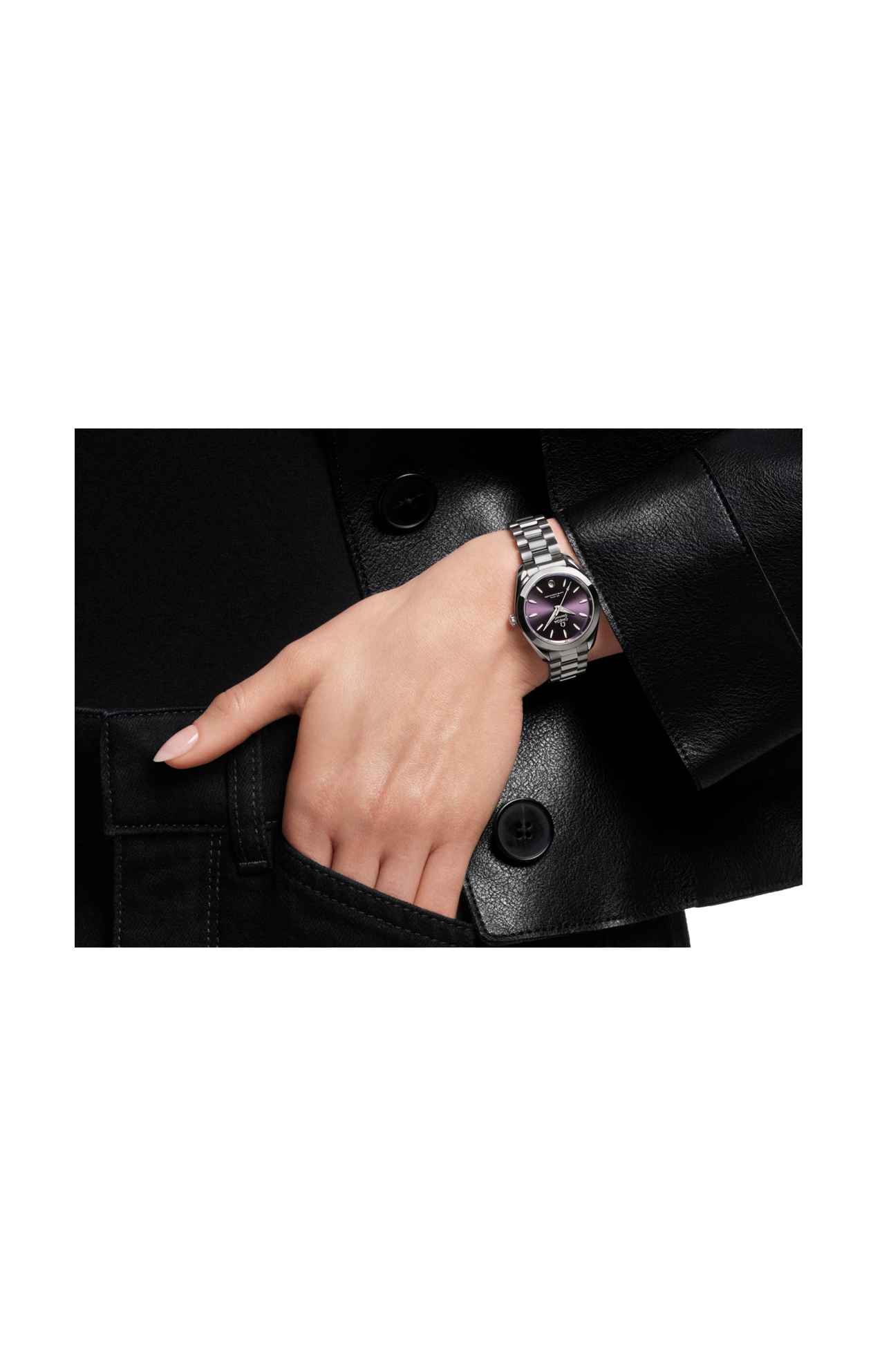 Il quadrante lavanda spazzolato a raggi di sole e laccato vanta un datario a finestrella circolare a ore 6, 11 indici delle ore a forma di scafo, lancette sfaccettate ridisegnate e lancetta dei minuti che si assottiglia in una punta raffinata. Tutti gli elementi applicati e le lancette sono realizzati in oro bianco 18K; gli indici e le lancette sono riempiti di Super-Luminova bianca che emette una luminescenza blu.