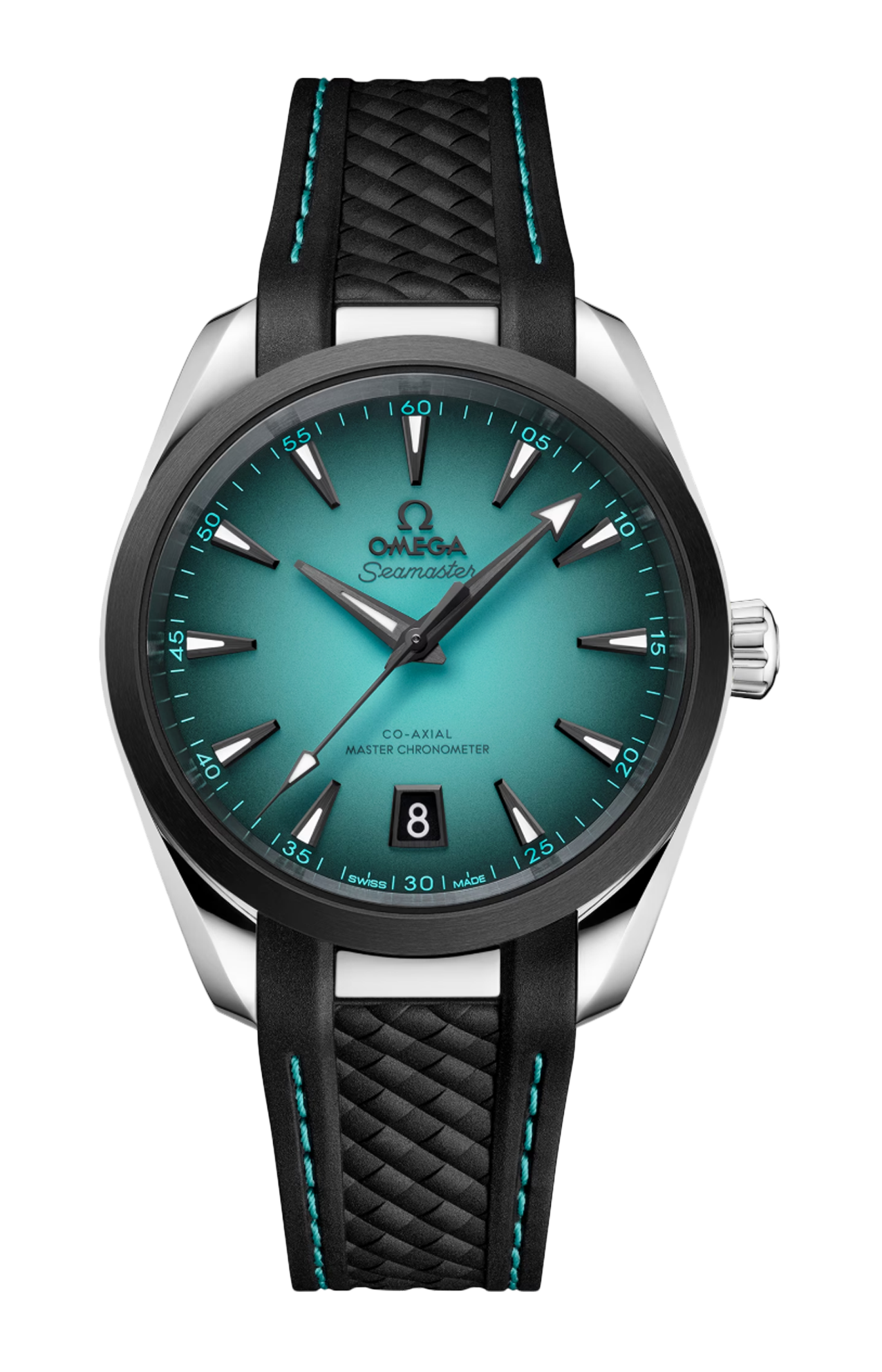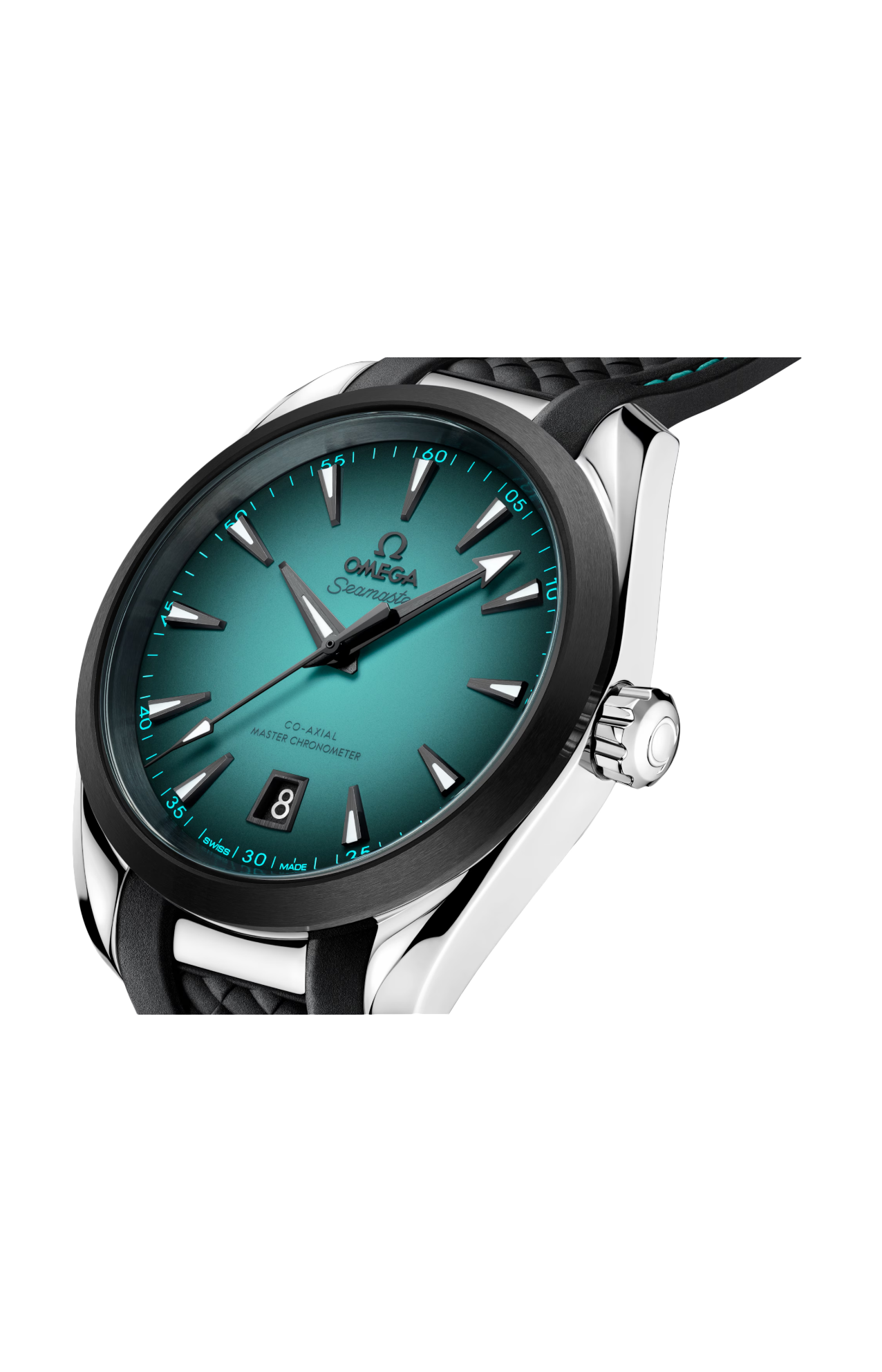 Il quadrante laccato turchese si distingue per l’incantevole colore, ispirato all’oceano e accentuato da un effetto sfumato nero; presenta inoltre lancette e indici sfaccettati trattati in PVD grigio e Super-Luminova bianca. Anche il logo Omega e il datario a finestrella sono trattati in PVD grigio, per abbinarsi alle diciture applicate in grigio, mentre la minuteria esterna è proposta in turchese.