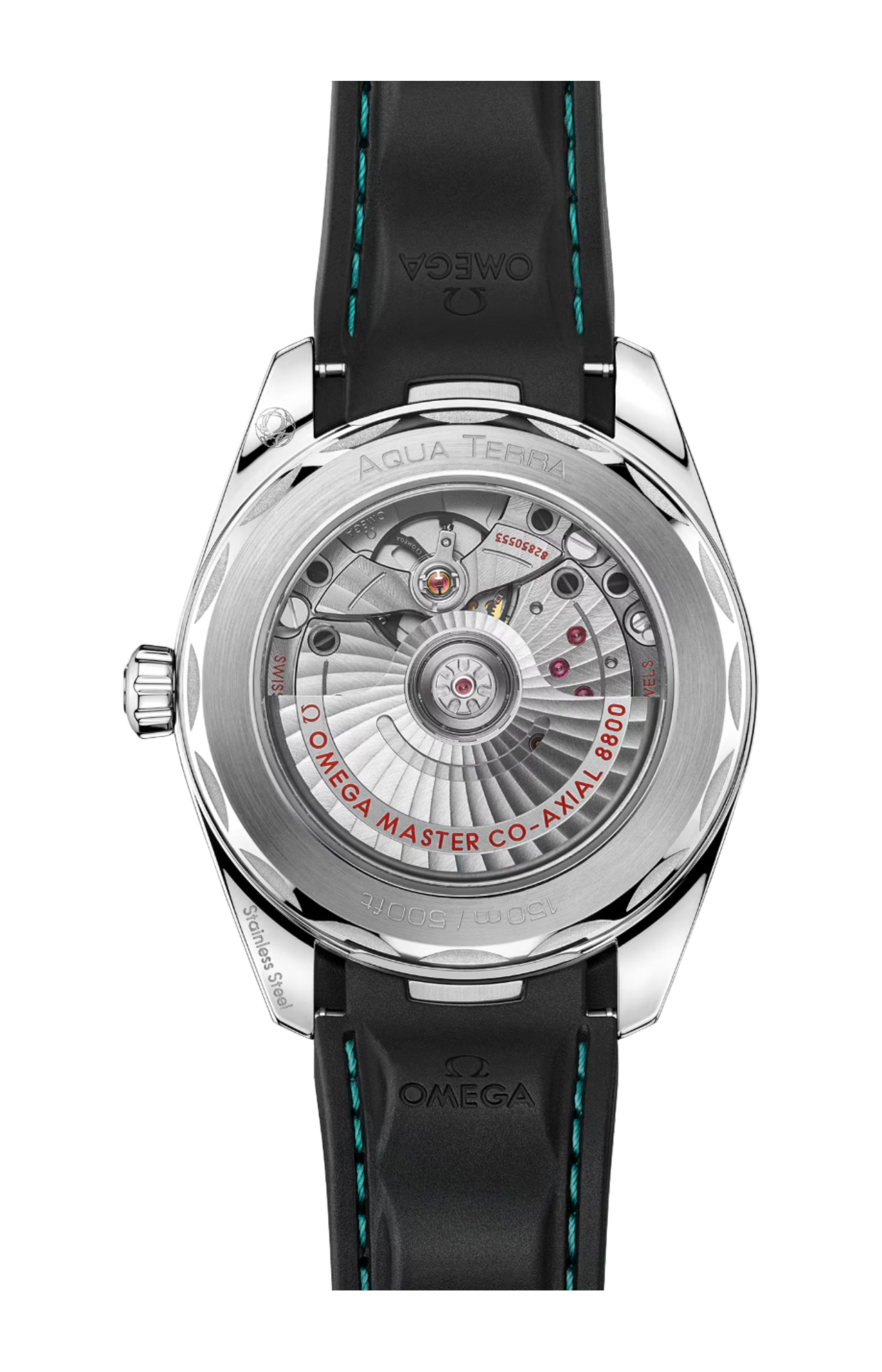 Il cinturino integrato in caucciù nero, con impunture turchesi e fibbia déployante, garantisce il massimo comfort al polso. Anima questo modello il calibro Omega Co-Axial Master Chronometer 8800, certificato dall’Istituto Federale Svizzero di Metrologia (METAS) secondo i più elevati standard stabiliti dal settore orologiero.