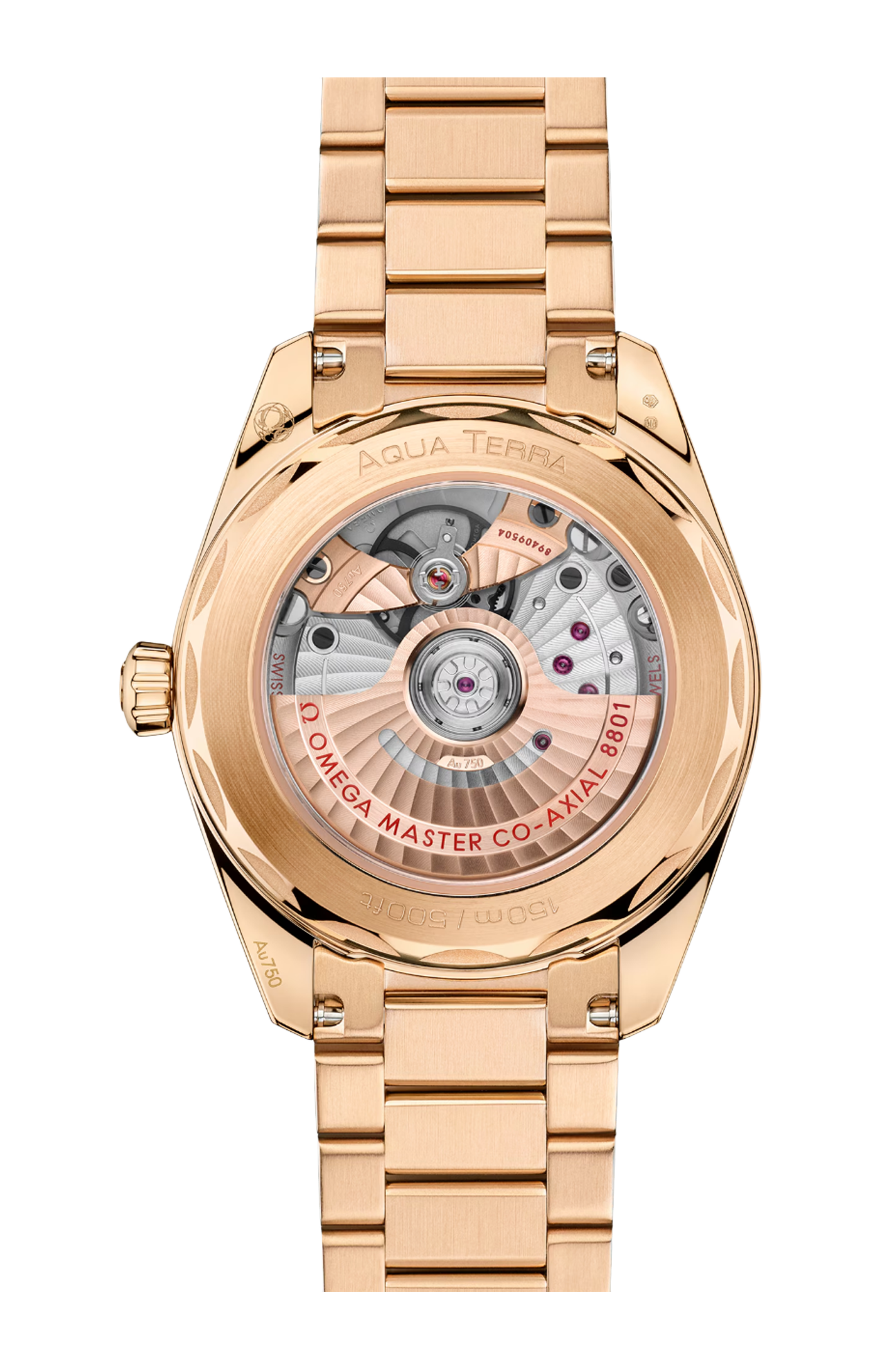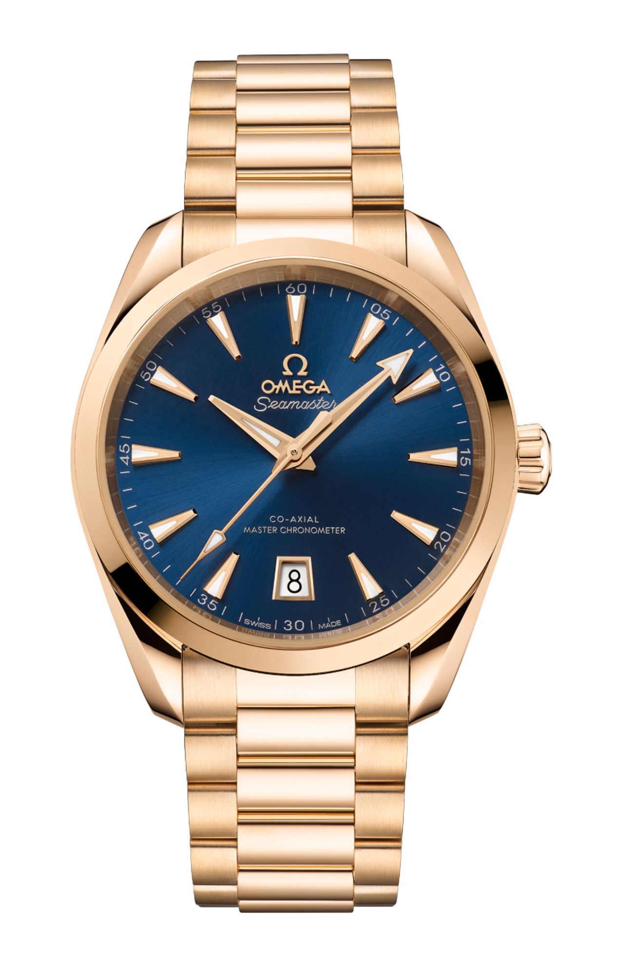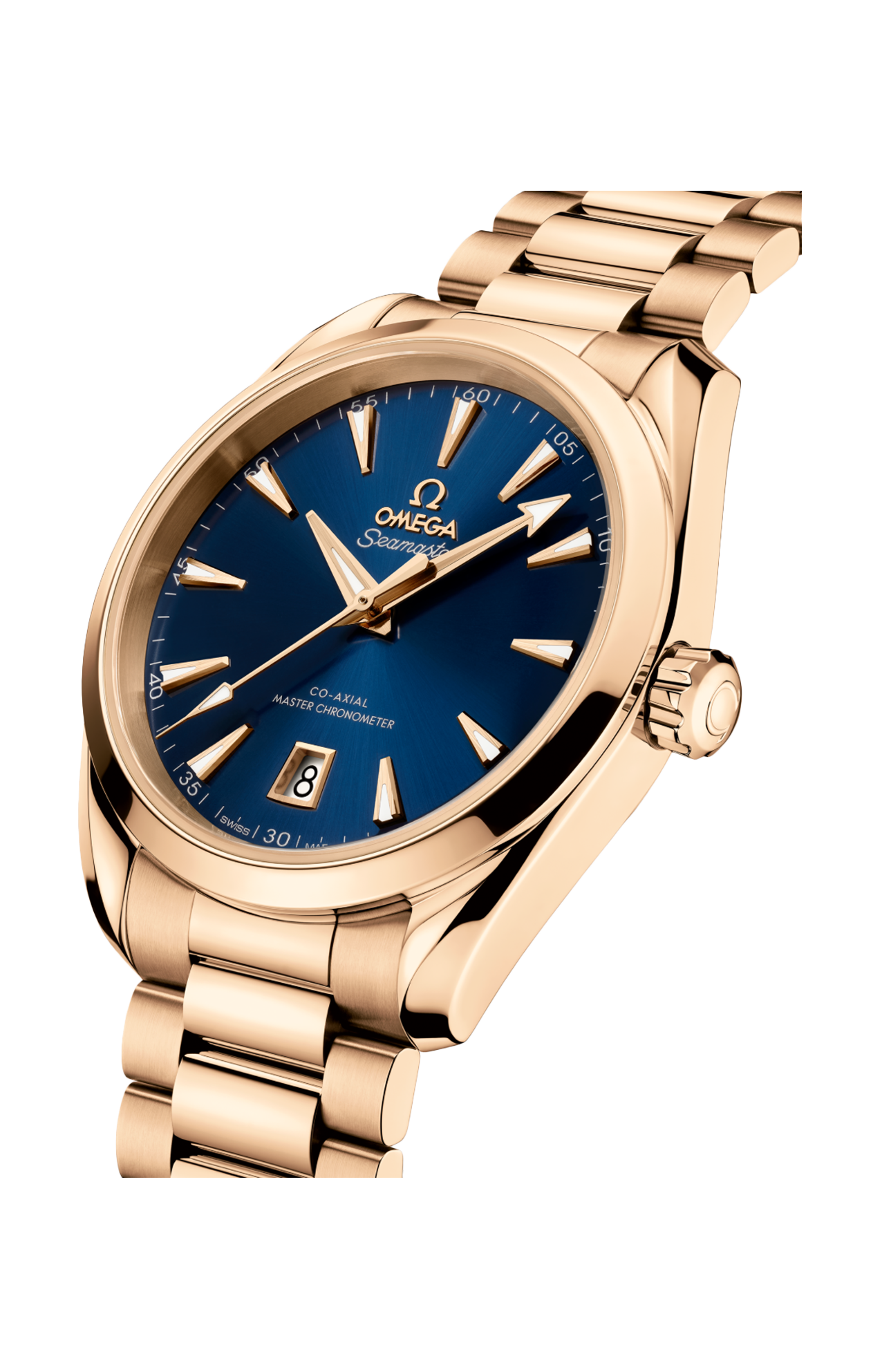 Il Seamaster Aqua Terra è un eccezionale tributo alla ricca tradizione marittima di Omega. Il modello da 38 mm presenta una cassa simmetrica in oro Moonshine™ 18K con fondello a vite e design con bordo ondulato.